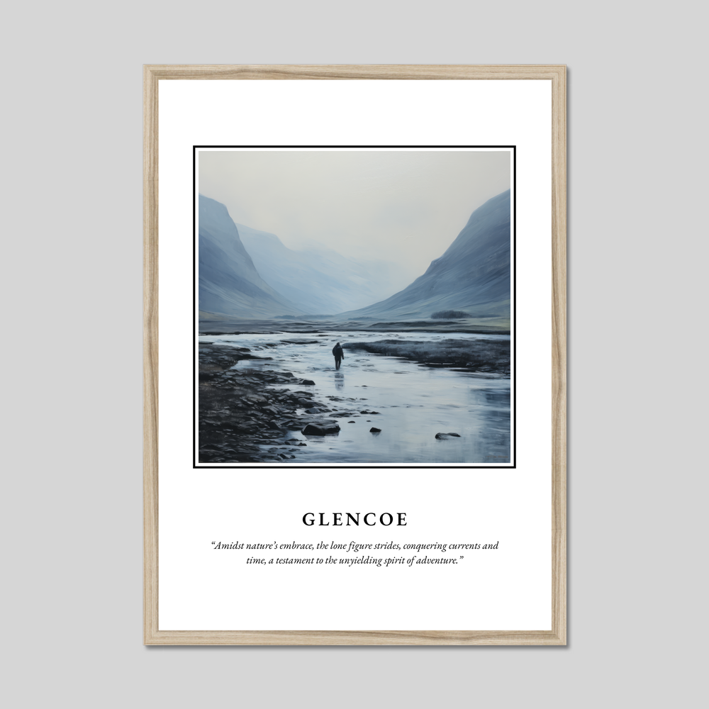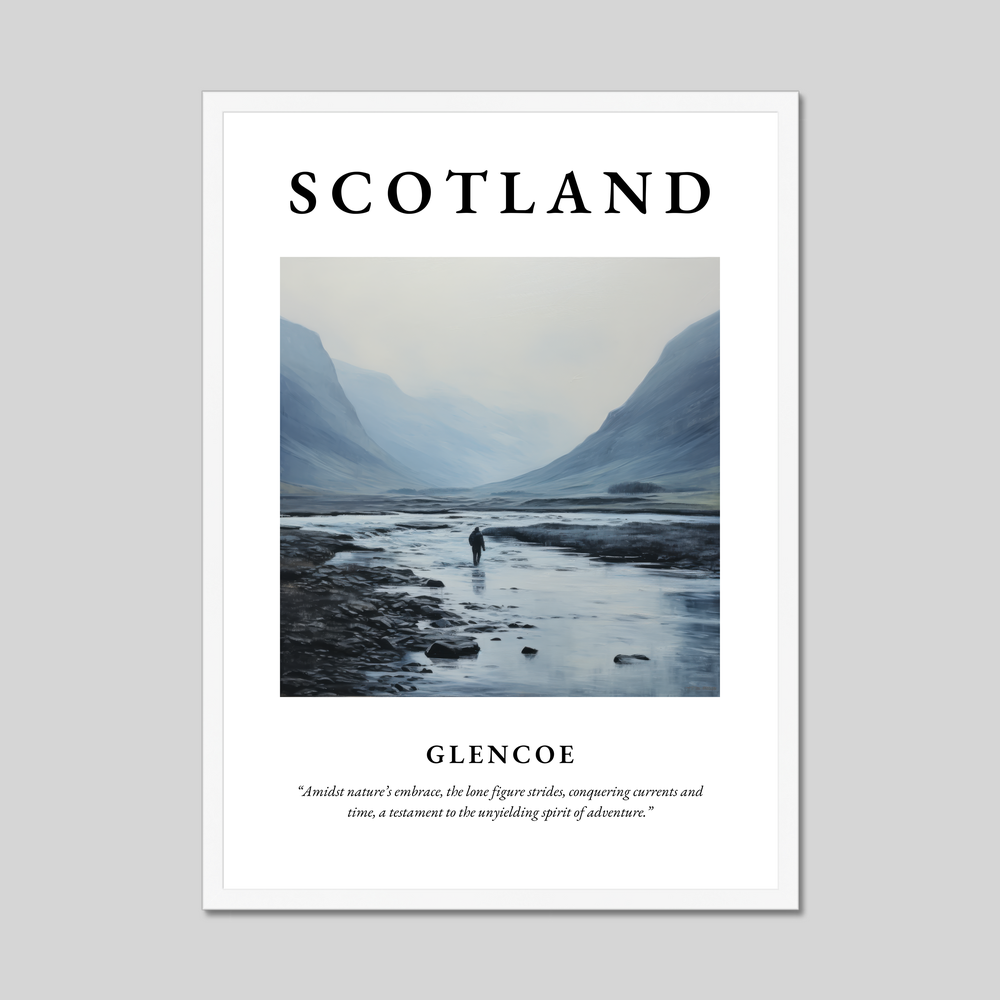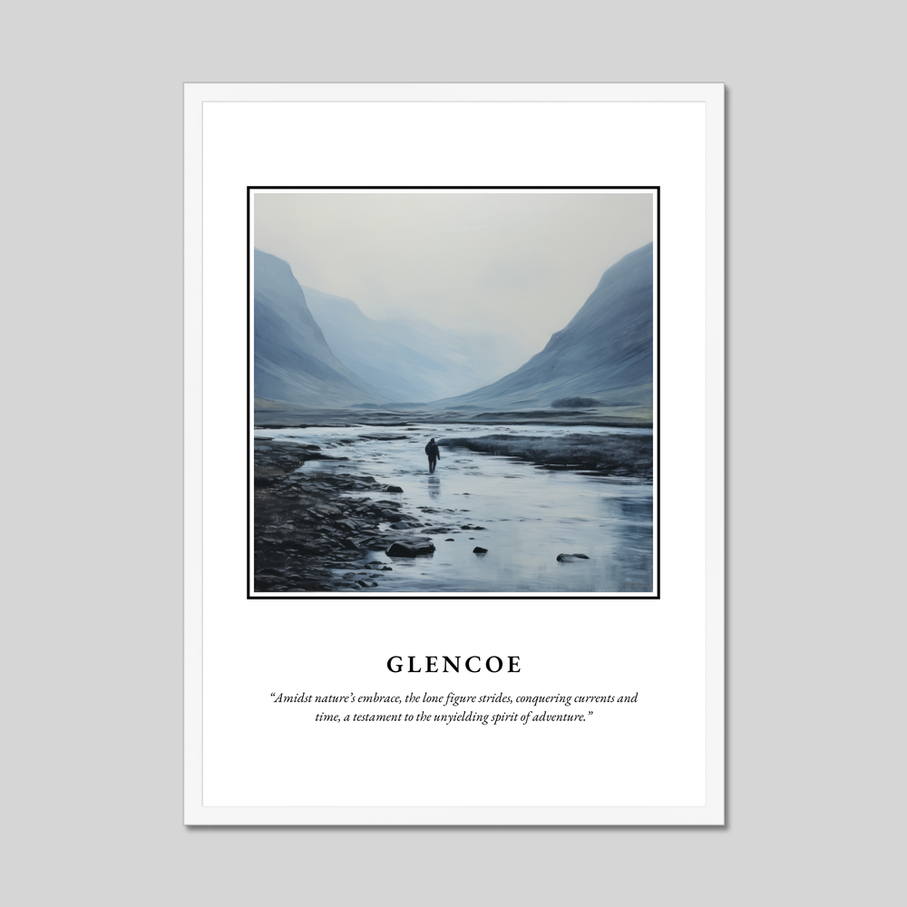 At the heart of this poster is a minimalistic painting of Glencoe. The tranquil scene captures the essence of this majestic landscape with delicate brushstrokes that convey a sense of serenity and solitude. Against a backdrop of towering mountains and serene waters, a lone figure strides, embodying the unyielding spirit of adventure. The timeless quote beneath—“Amidst nature’s embrace, the lone figure strides, conquering currents and time, a testament to the unyielding spirit of adventure”—echoes the feelings inspired by Glencoe’s dramatic vistas.