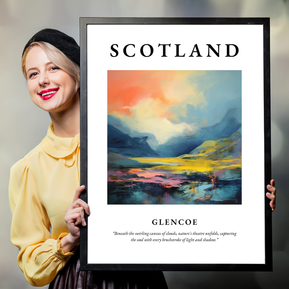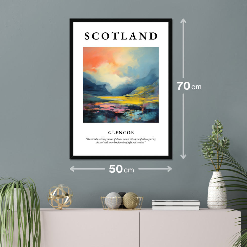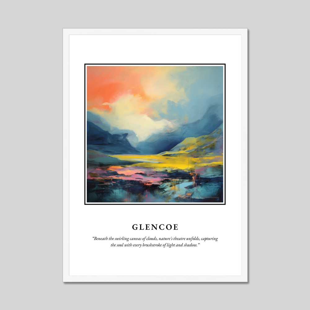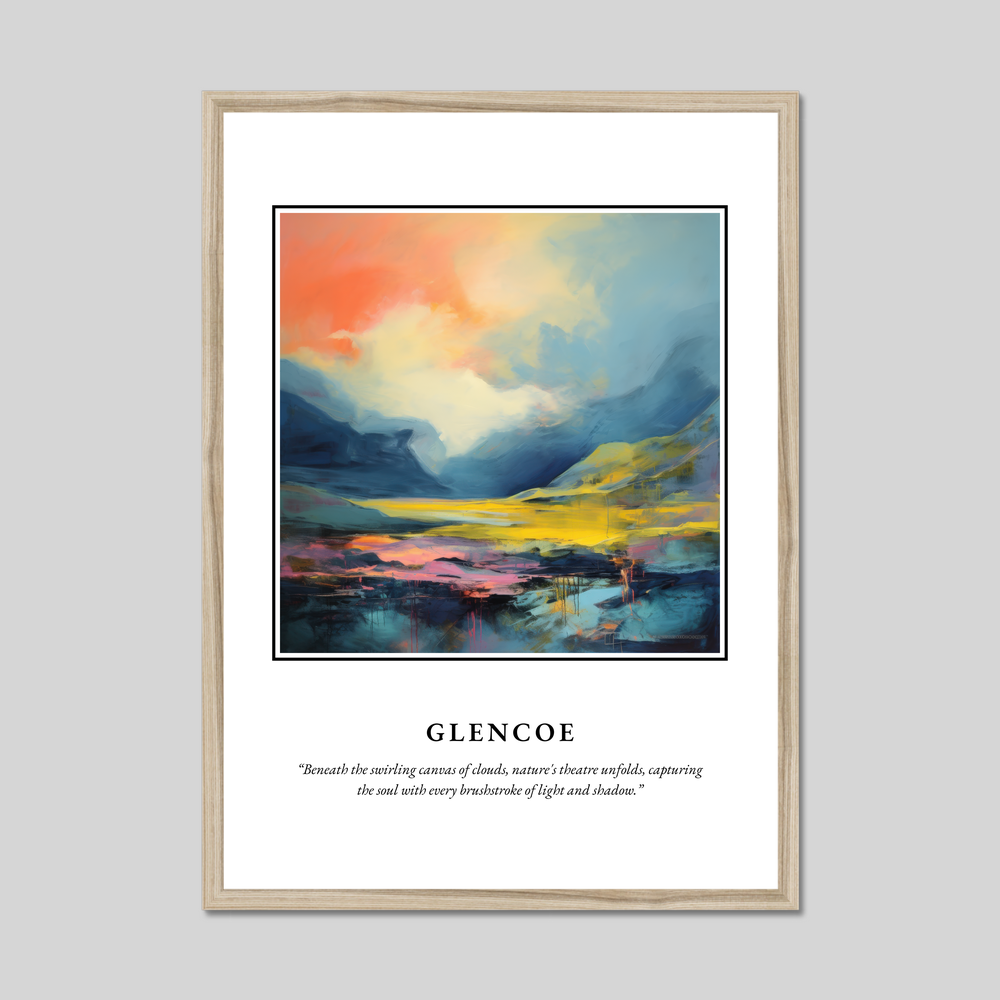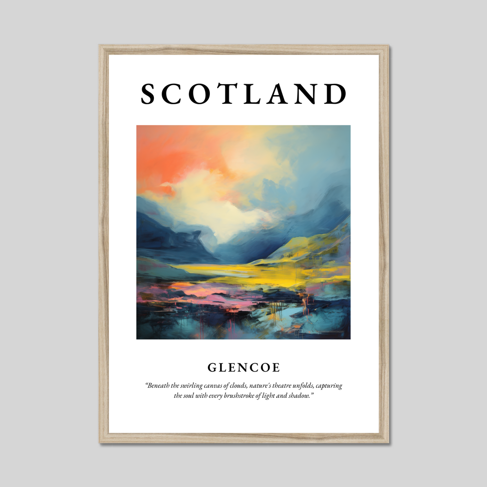 Capture the essence of Scotland with our stunning framed poster print, measuring an impressive 50cm x 70cm. Boldly featuring "SCOTLAND" across the top, it highlights an exquisite abstract painting of Glencoe. Beneath the breathtaking image, the poignant quote, “Beneath the swirling canvas of clouds, nature's theatre unfolds, capturing the soul with every brushstroke of light and shadow,” completes this captivating piece.