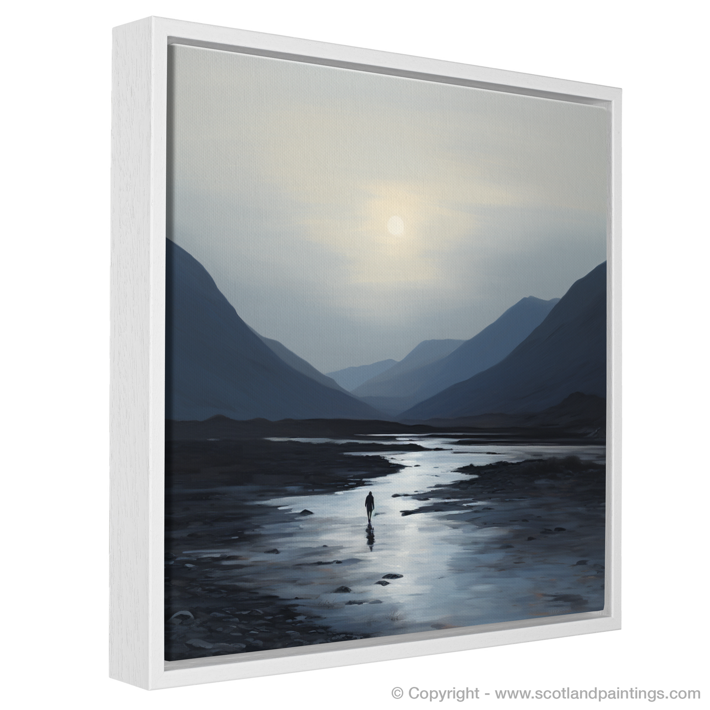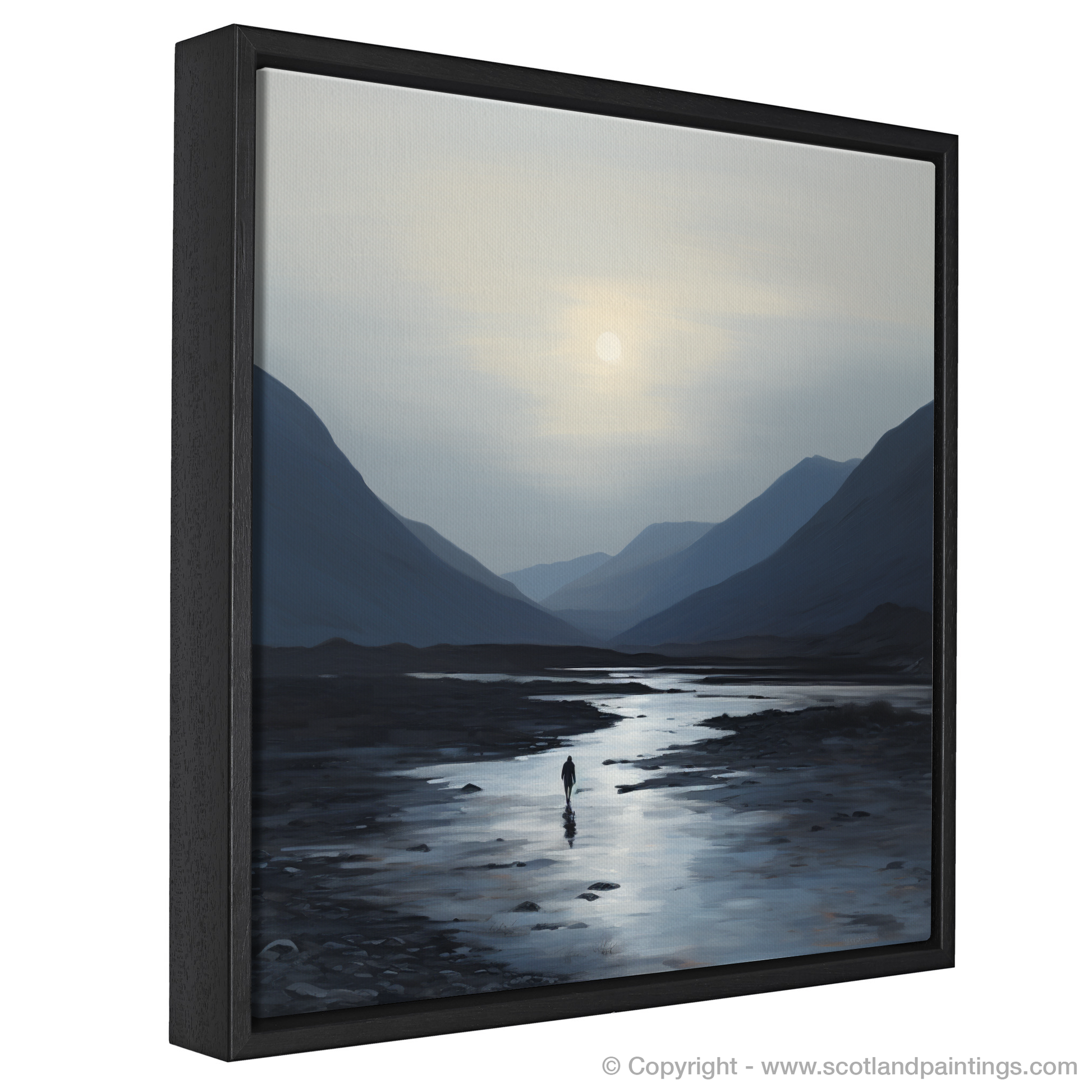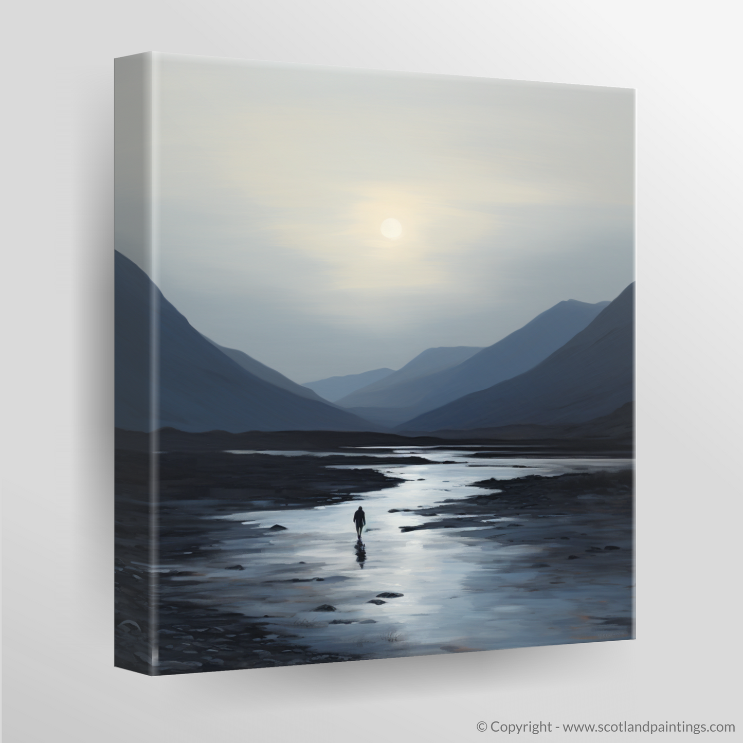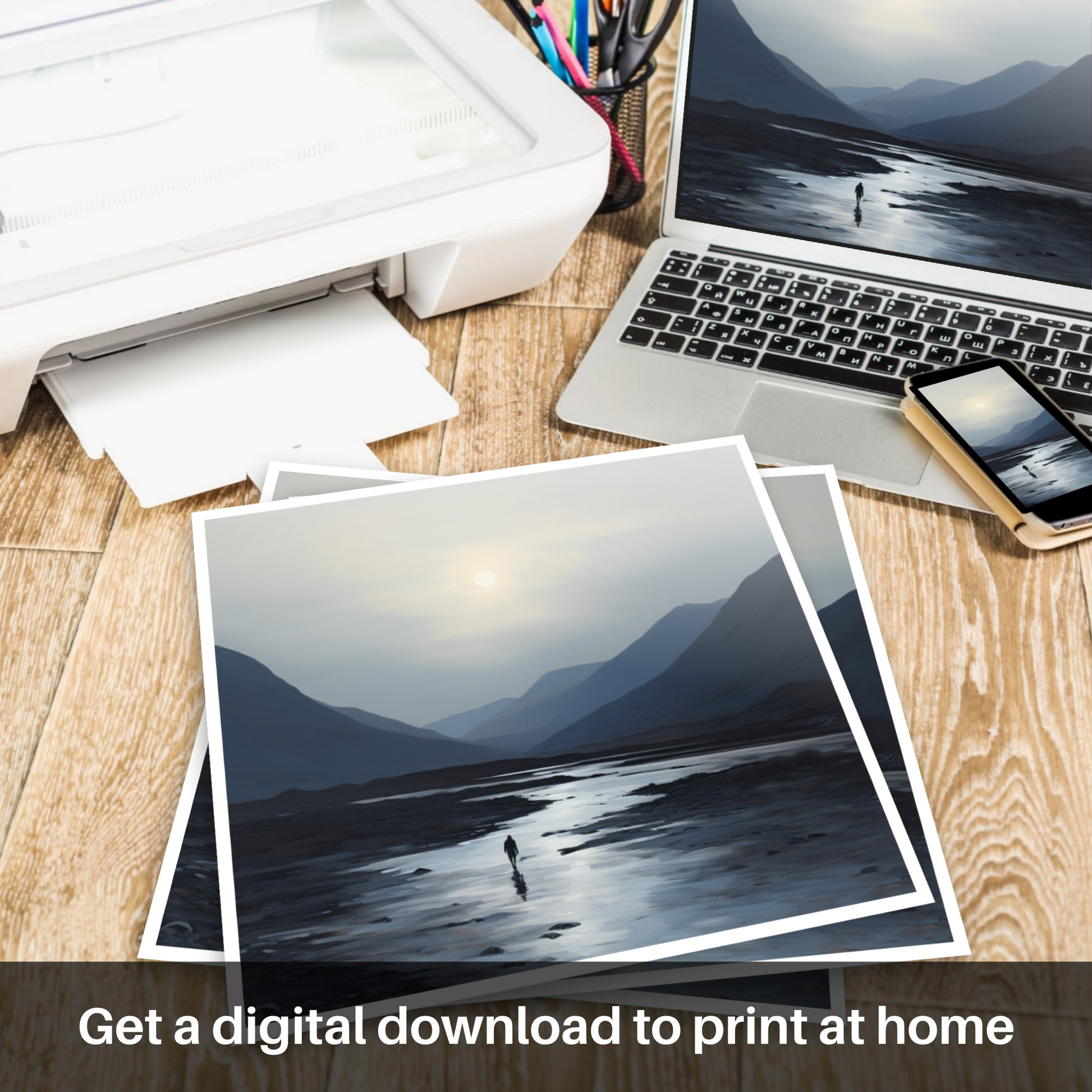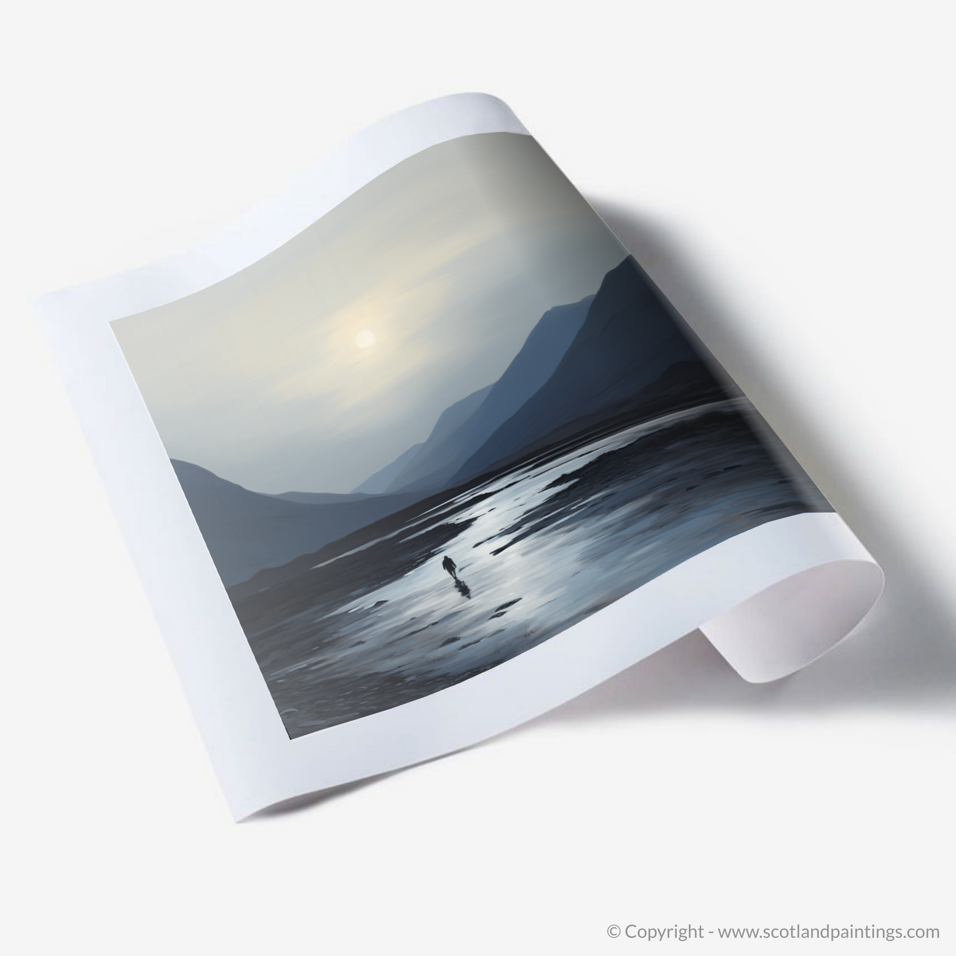 As the day ebbs into twilight, this evocative print captures a solitary figure traversing the tranquil expanse of Glencoe, their form mirrored in the water's gentle ripples. The serene palette of dusky blues and gentle greys, punctuated by the soft glow of the setting sun, conjures a sense of solitude and introspection. Starkly beautiful, the minimalist approach strips the landscape to its bare essence, allowing the raw beauty of the Scottish Highlands to resonate with the viewer.