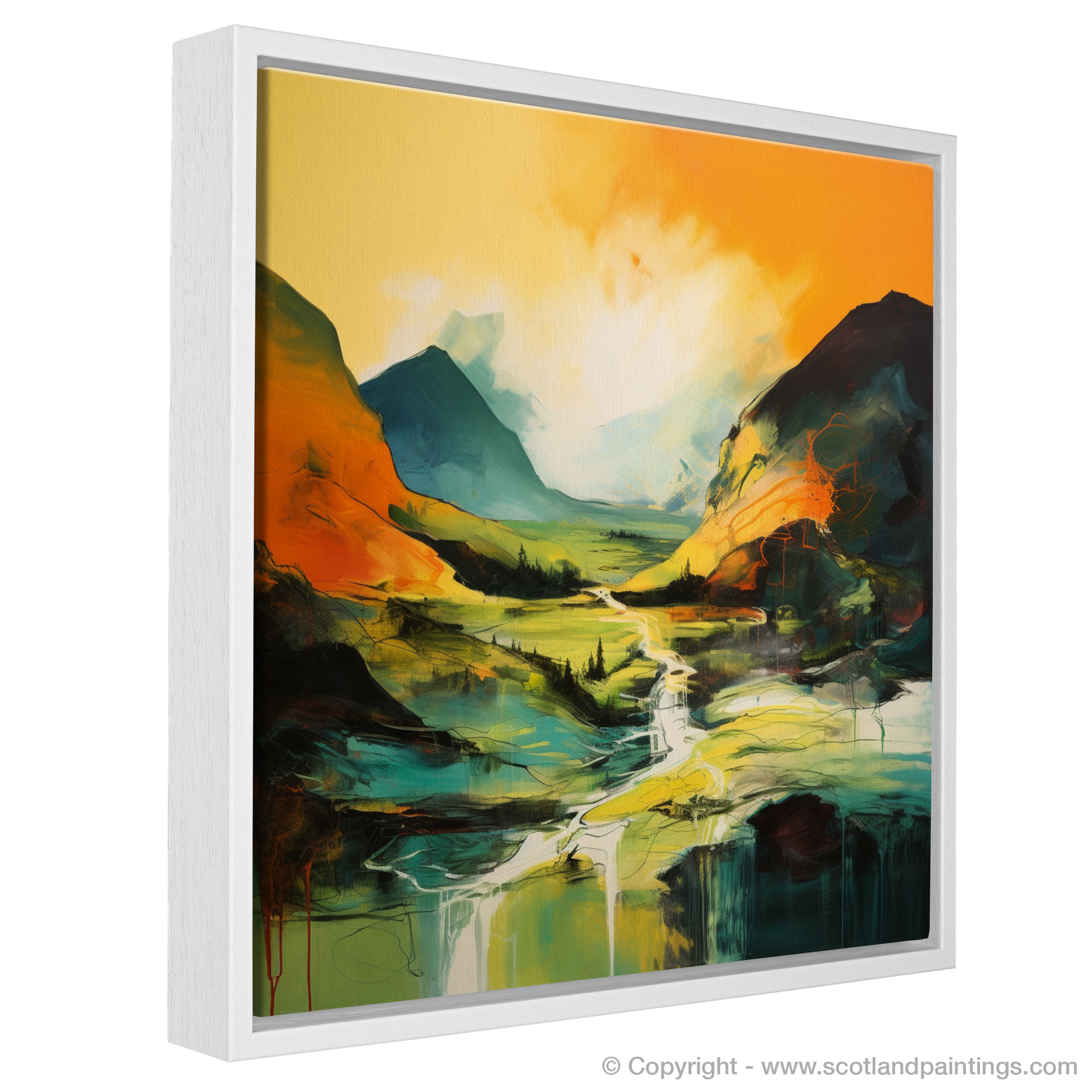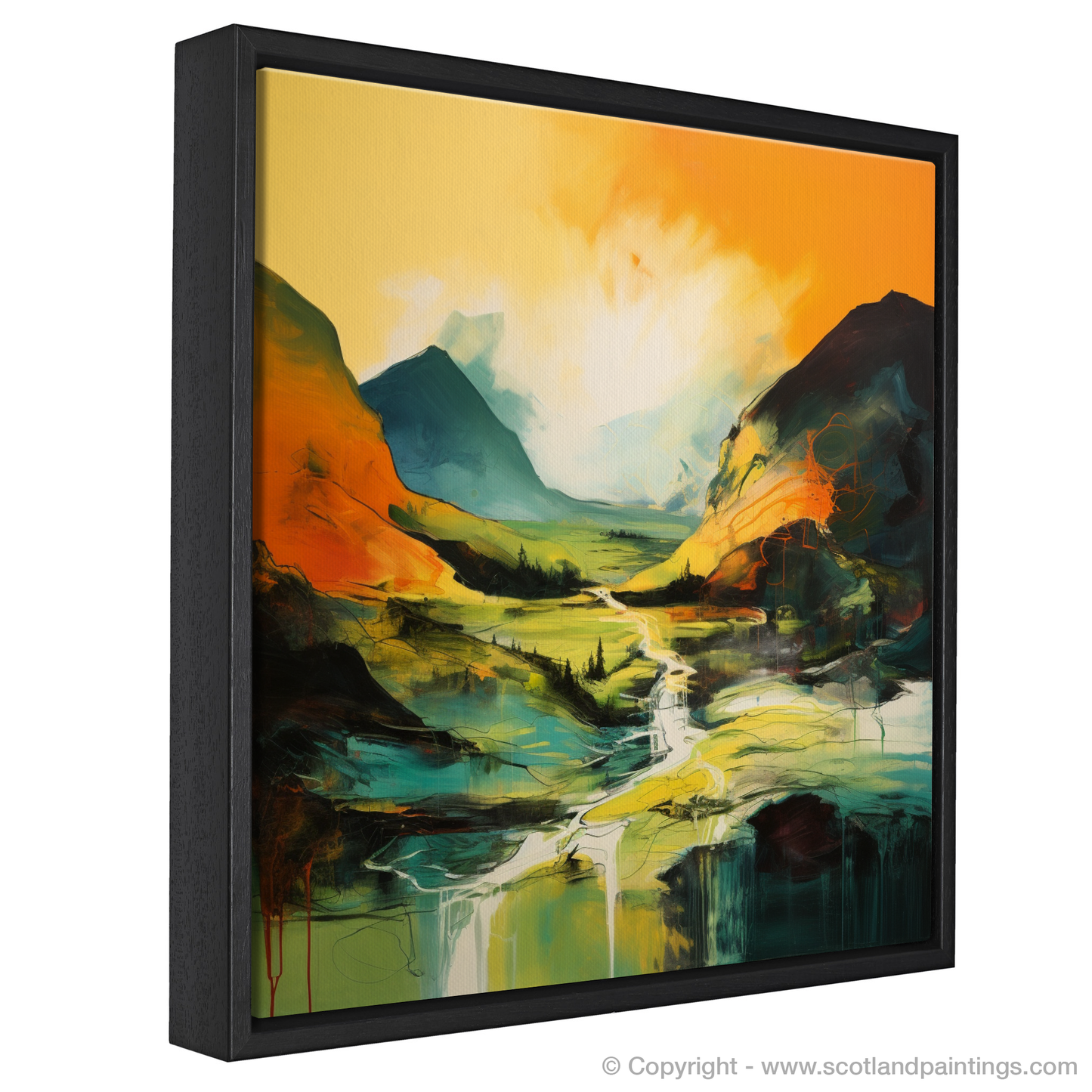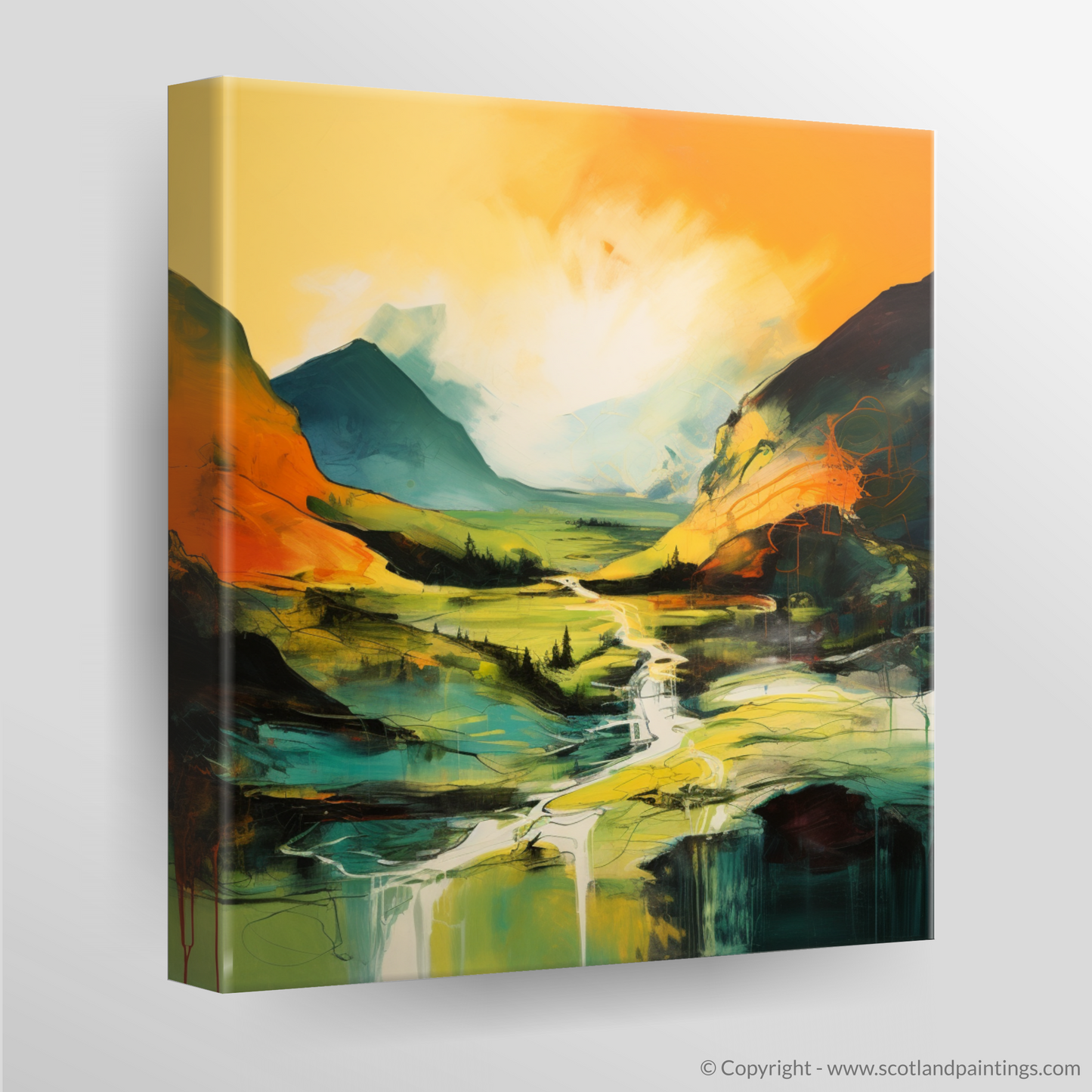 Immerse yourself in the captivating aura of a Glencoe glen as the day concludes with our enchanting abstract print. This piece masterfully encapsulates the ephemeral beauty of a sunset cascading over the rugged landscape, using a vibrant palette to evoke the extraordinary interplay between light and nature.