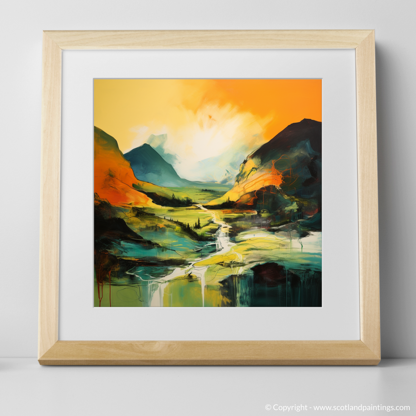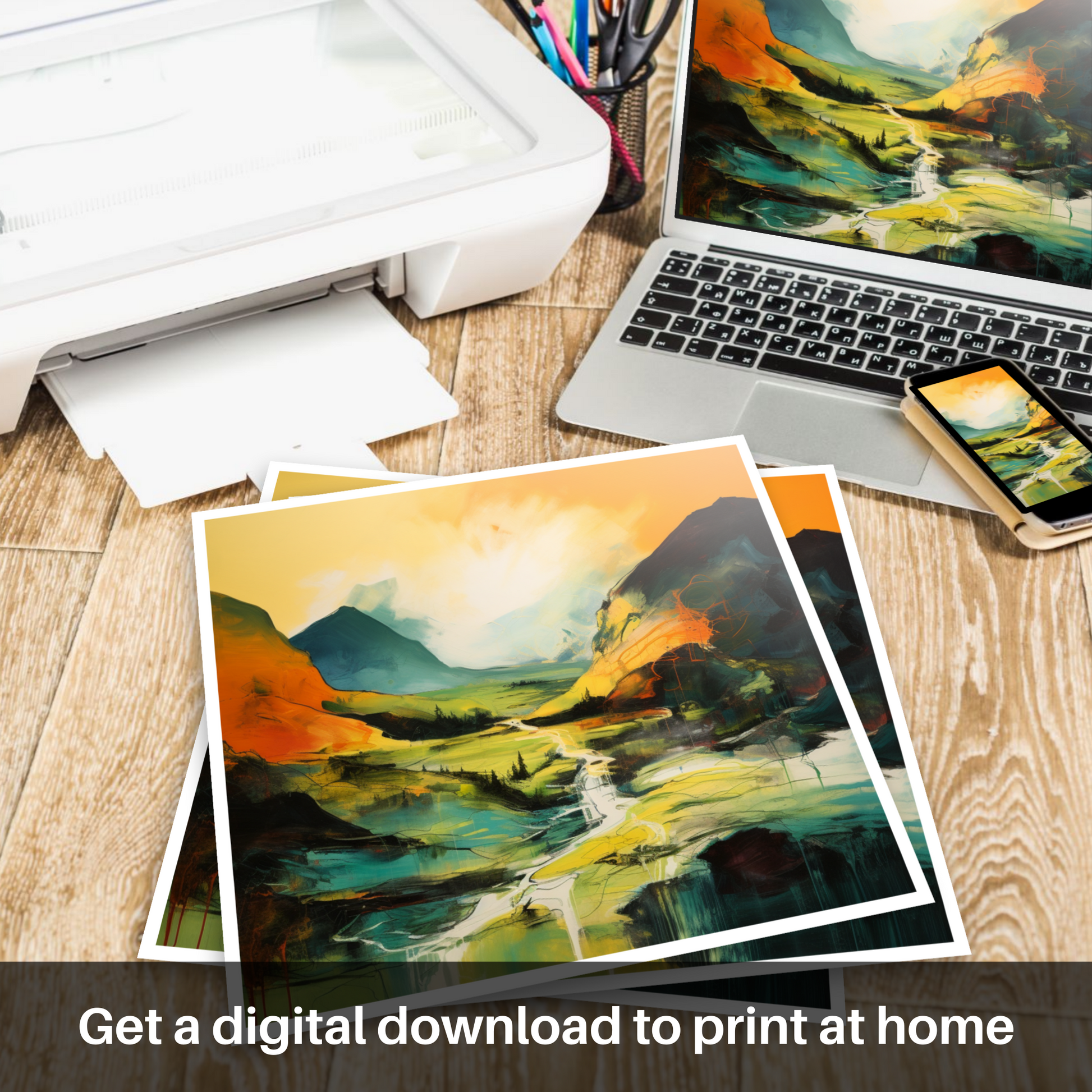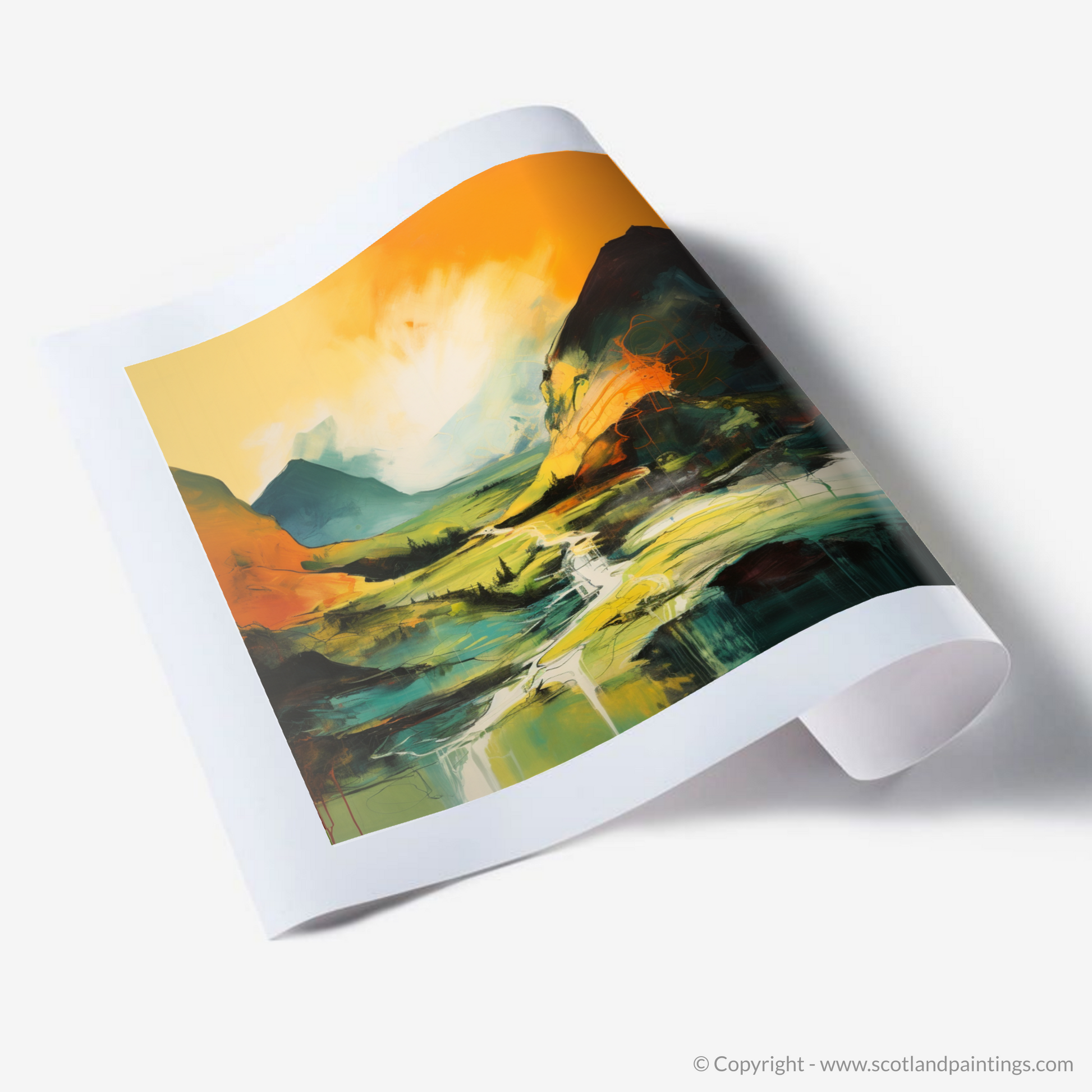 This print offers a contemporary interpretation of Scotland's timeless beauty, making it a perfect piece for those who appreciate art that bridges the gap between the realistic and the interpretive. The dynamic composition is sure to invoke discussion and introspection, fitting seamlessly with the modern interior while connecting admirers to the tranquillity and grandeur of Glencoe's verdant sunsets.