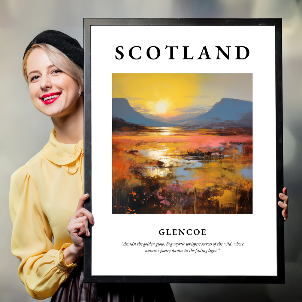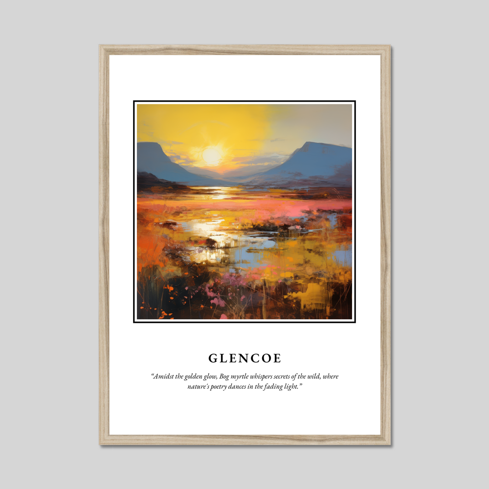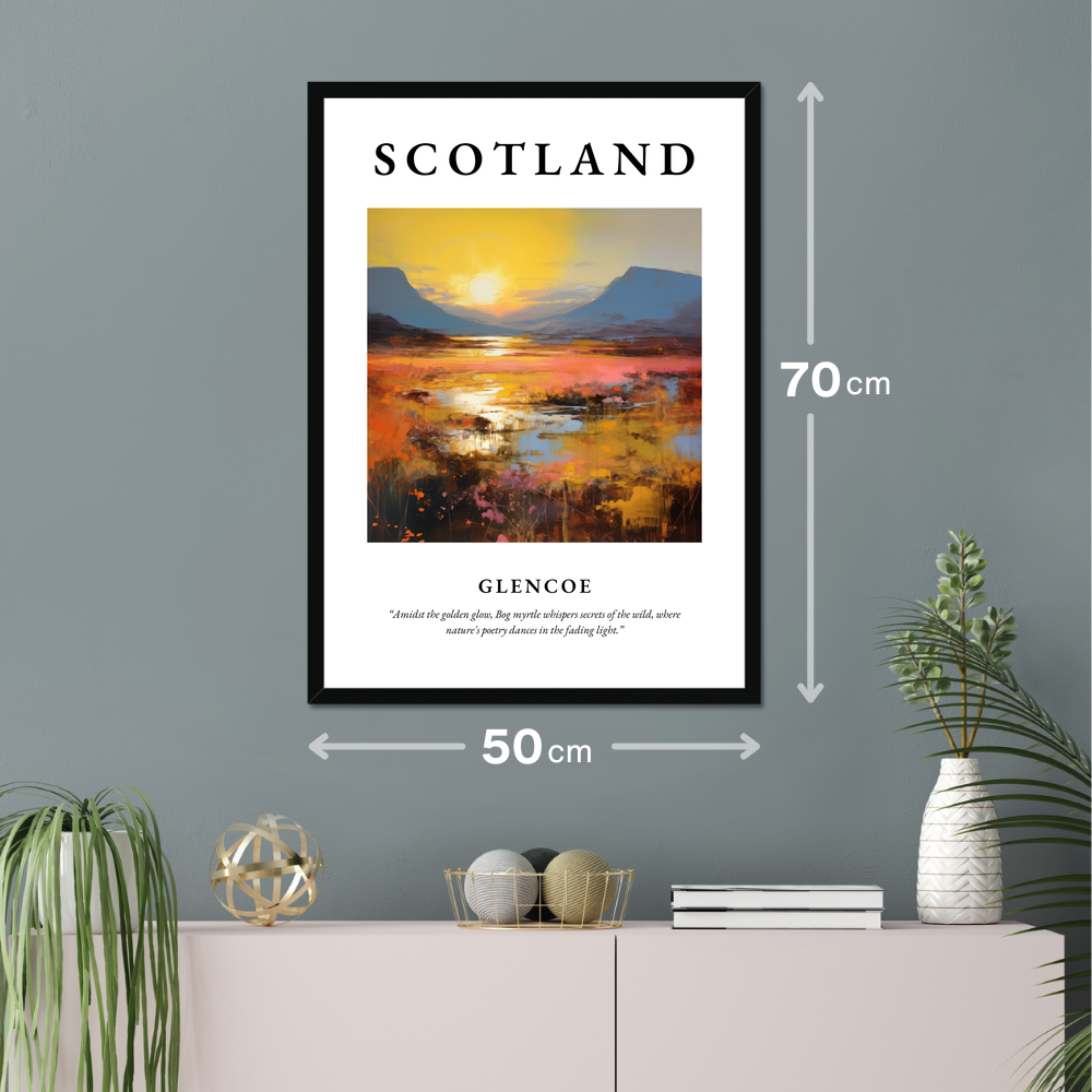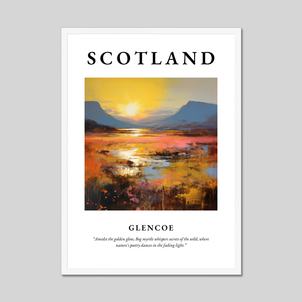 Capture the essence of Scotland's rugged beauty with our stunning framed poster print, measuring an impressive 50cm x 70cm. Available in a choice of black, white, or a natural wood-effect frame, this large artwork is an affordable way to bring an expansive, visually arresting piece into your home. The poster features the word "SCOTLAND" in bold lettering, embodying the pride and spirit of this majestic land. Delve into the heart of the country with the enchanting abstract painting of Glencoe, and let the poetic quote below whisk you away: “Amidst the golden glow, Bog myrtle whispers secrets of the wild, where nature's poetry dances in the fading light.”