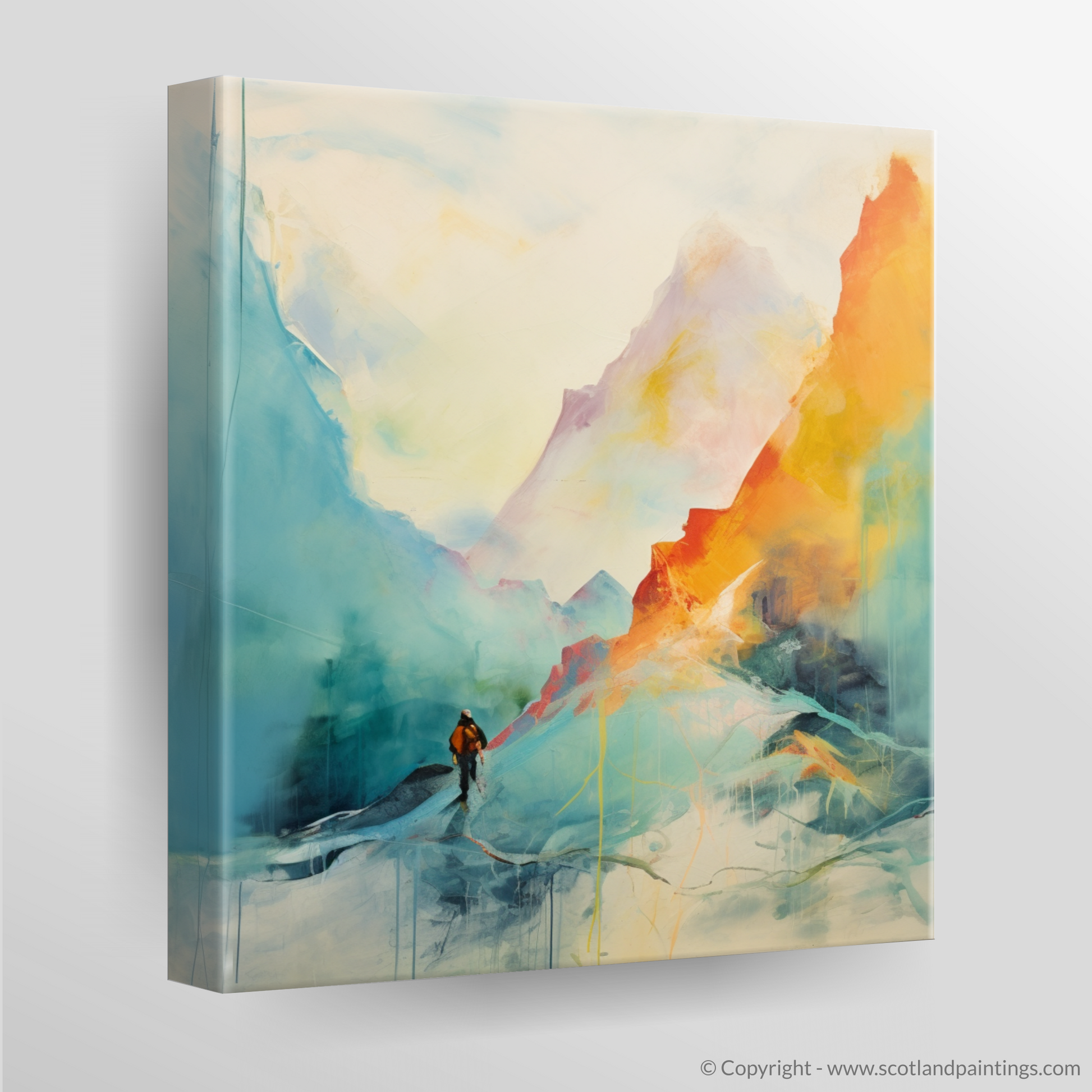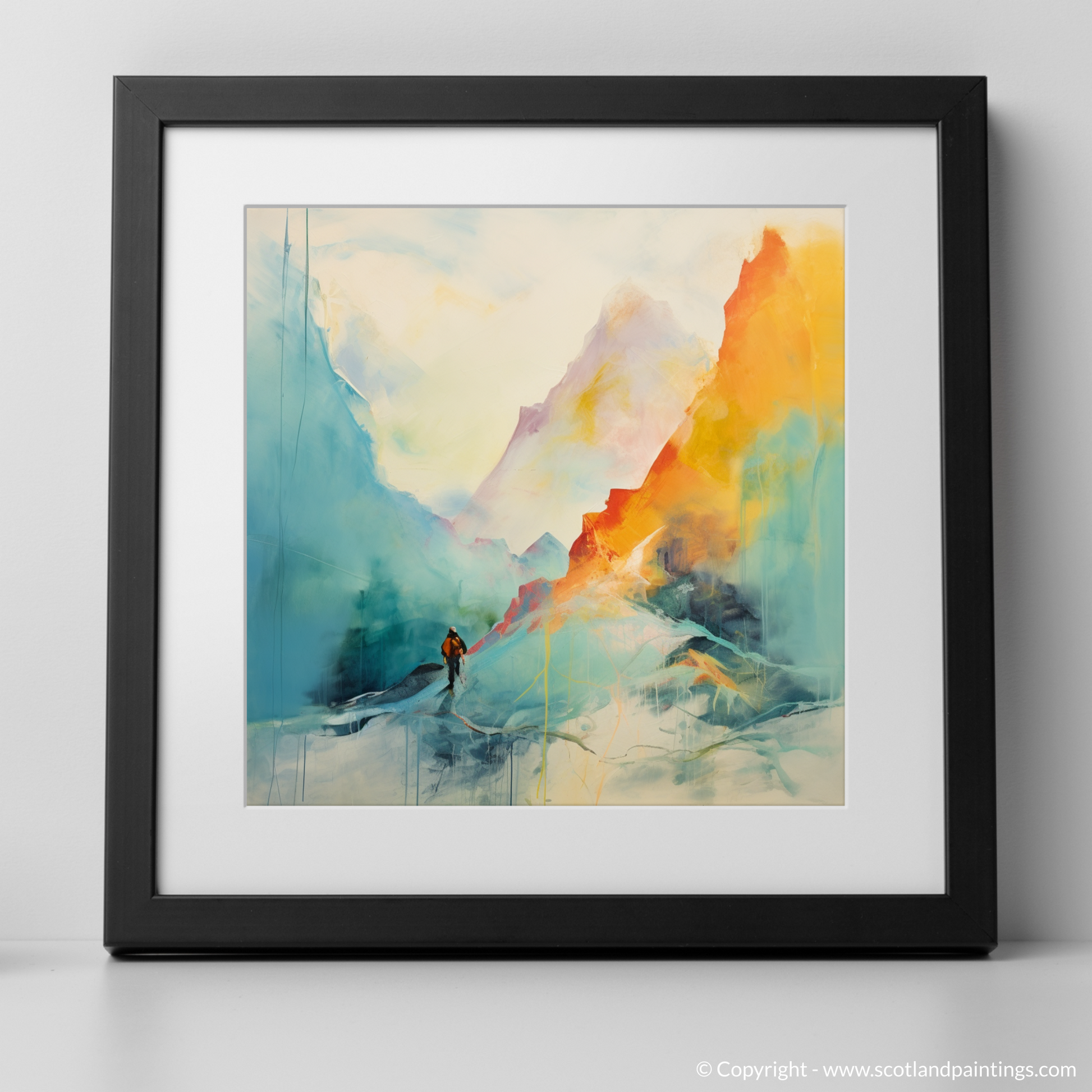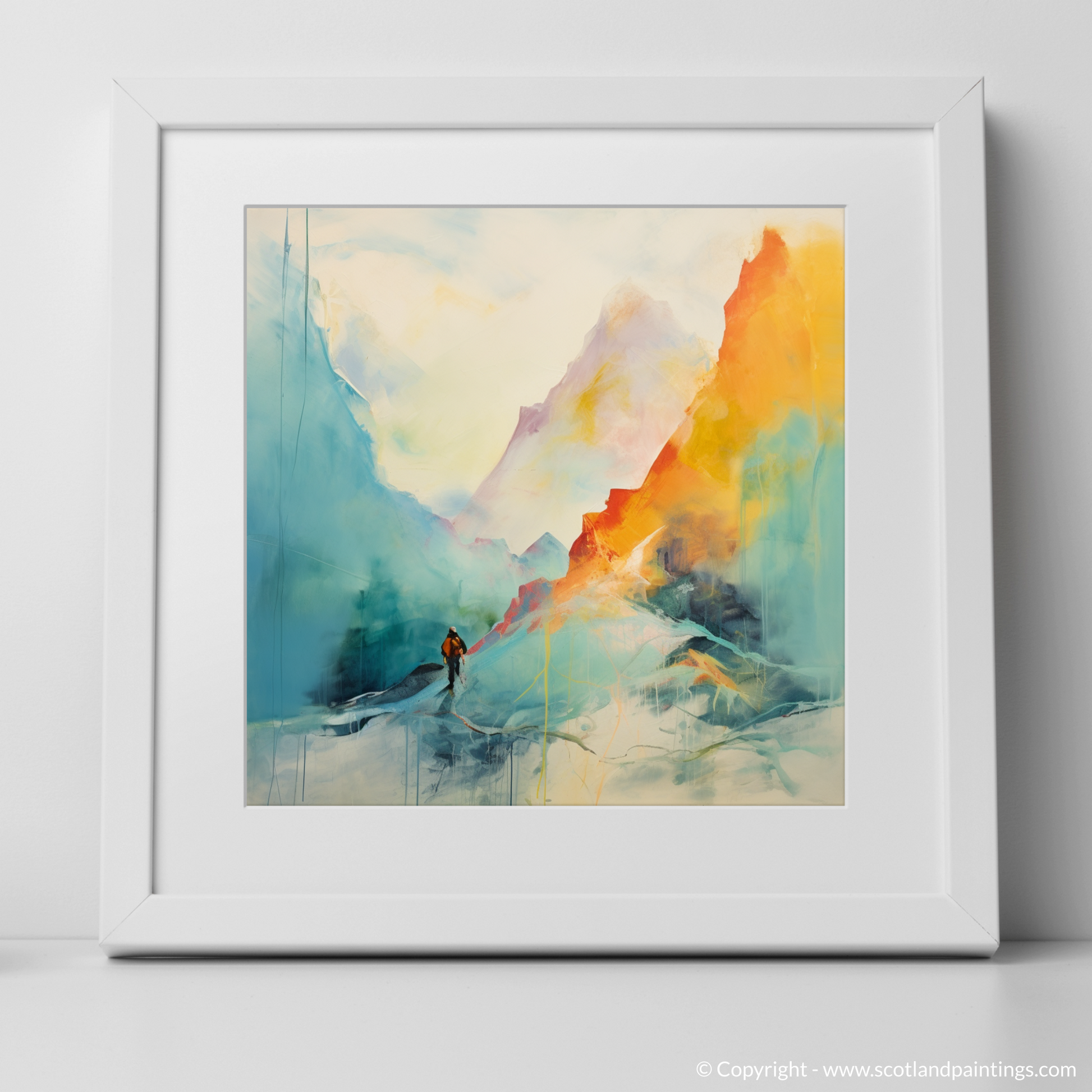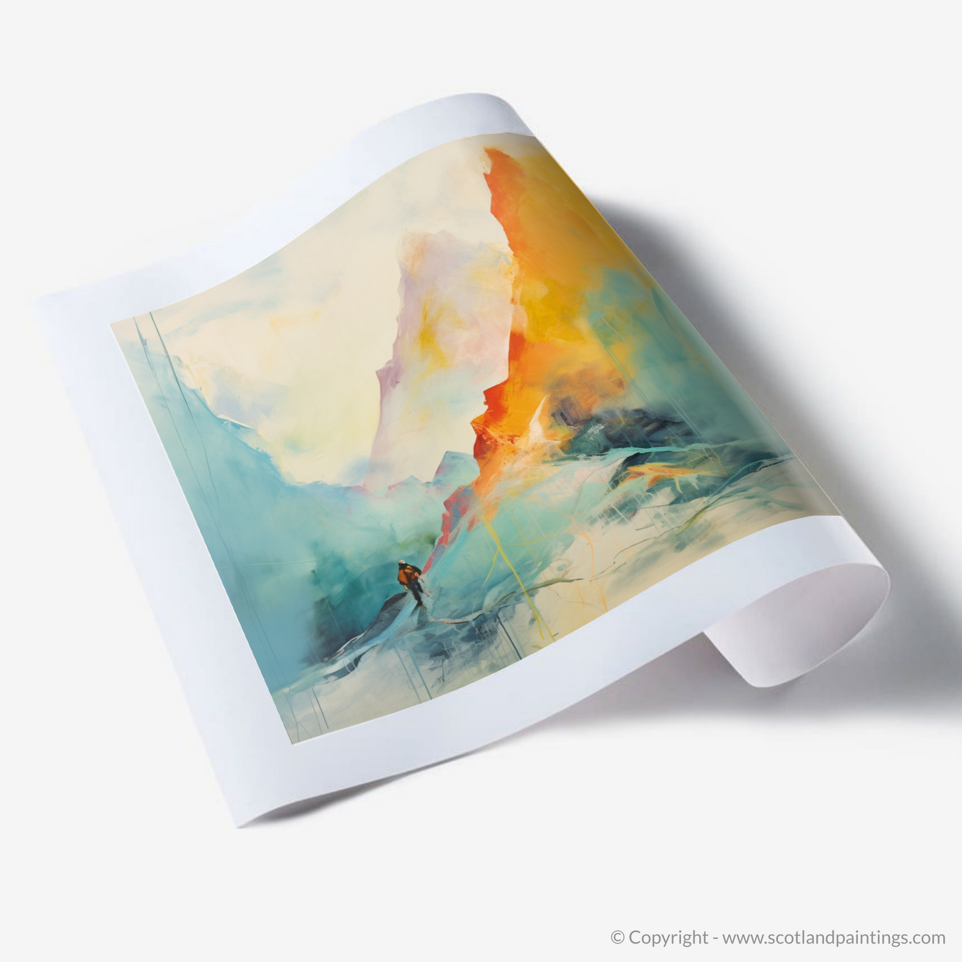 Immerse yourself in the ethereal beauty of Glencoe with this evocative abstract print, a tribute to the intrepid spirit of exploration. This piece masterfully captures a climber's solitary ascent amidst the misty crags and peaks of one of Scotland's most majestic landscapes.
