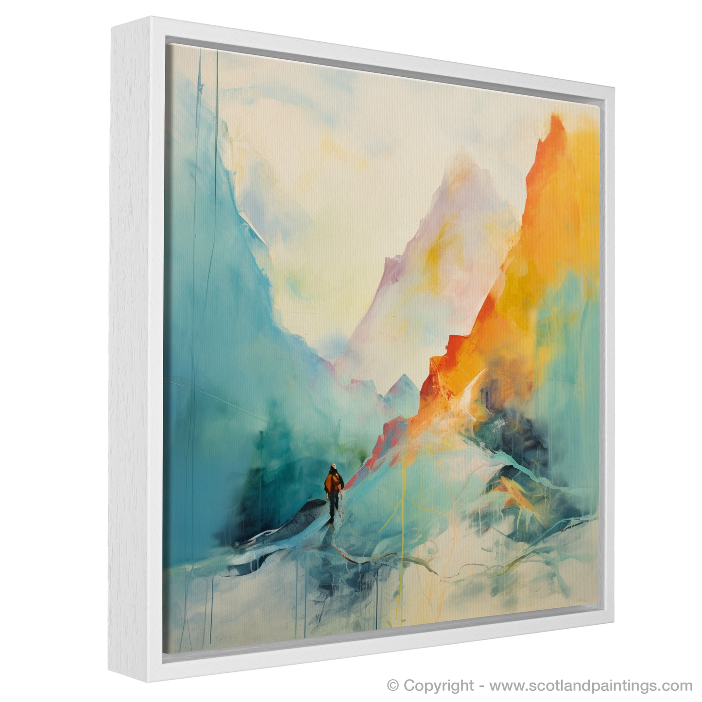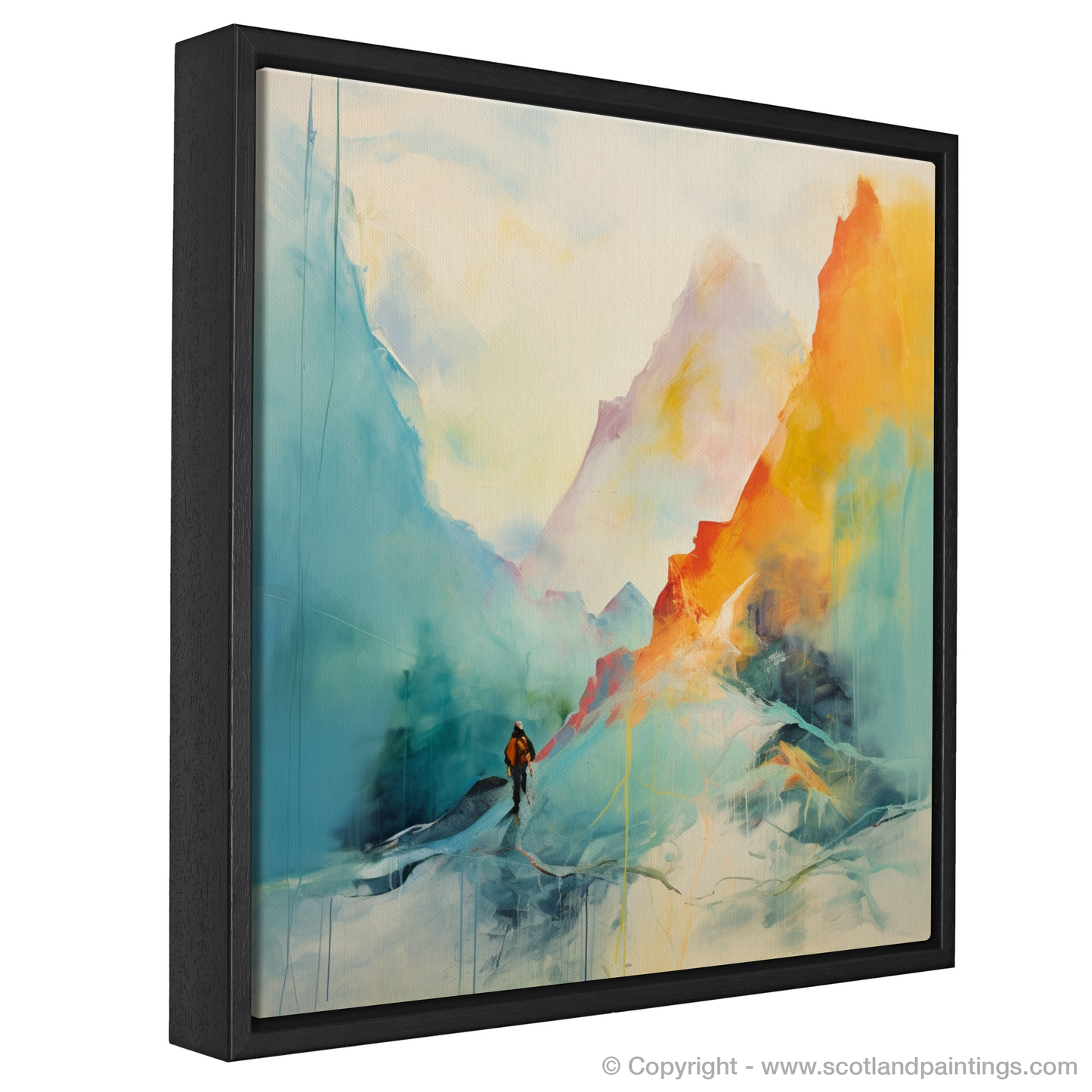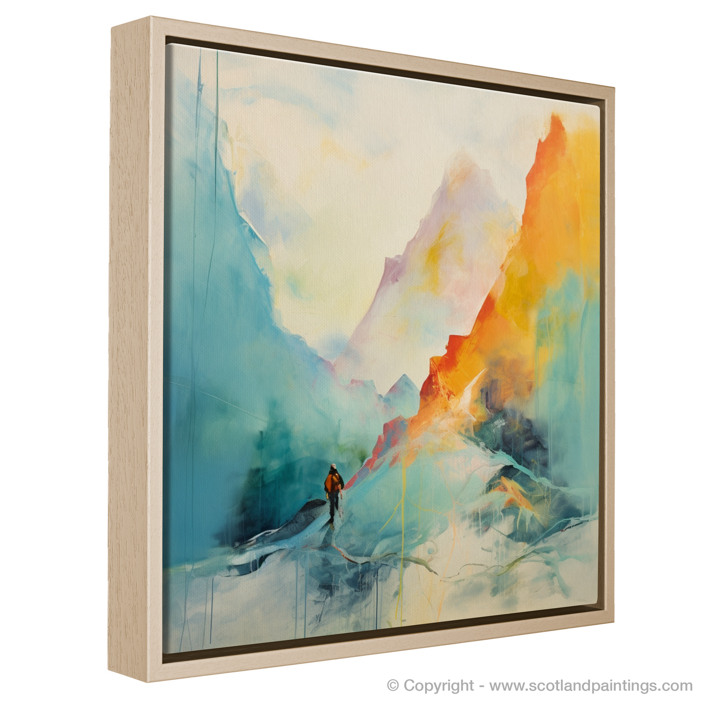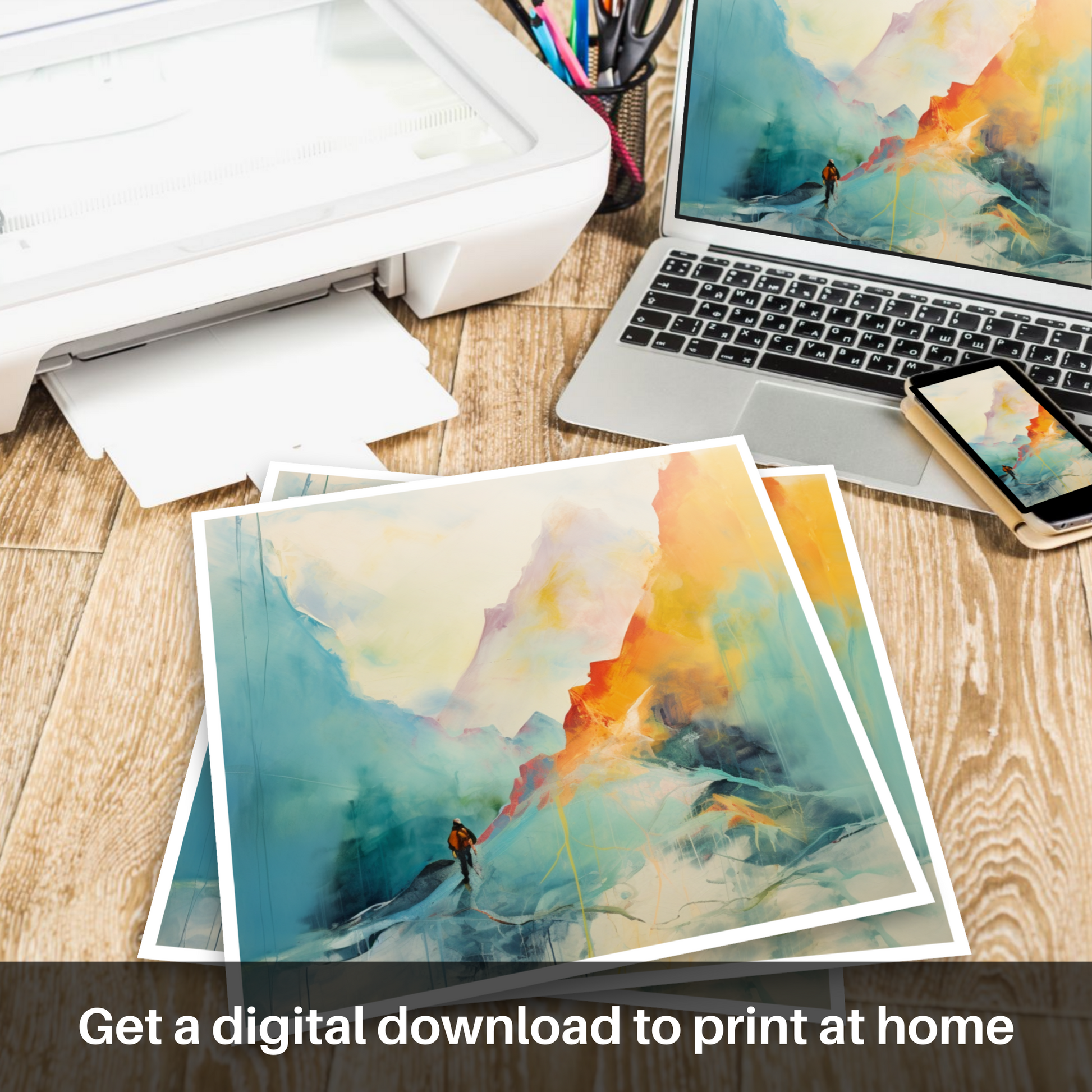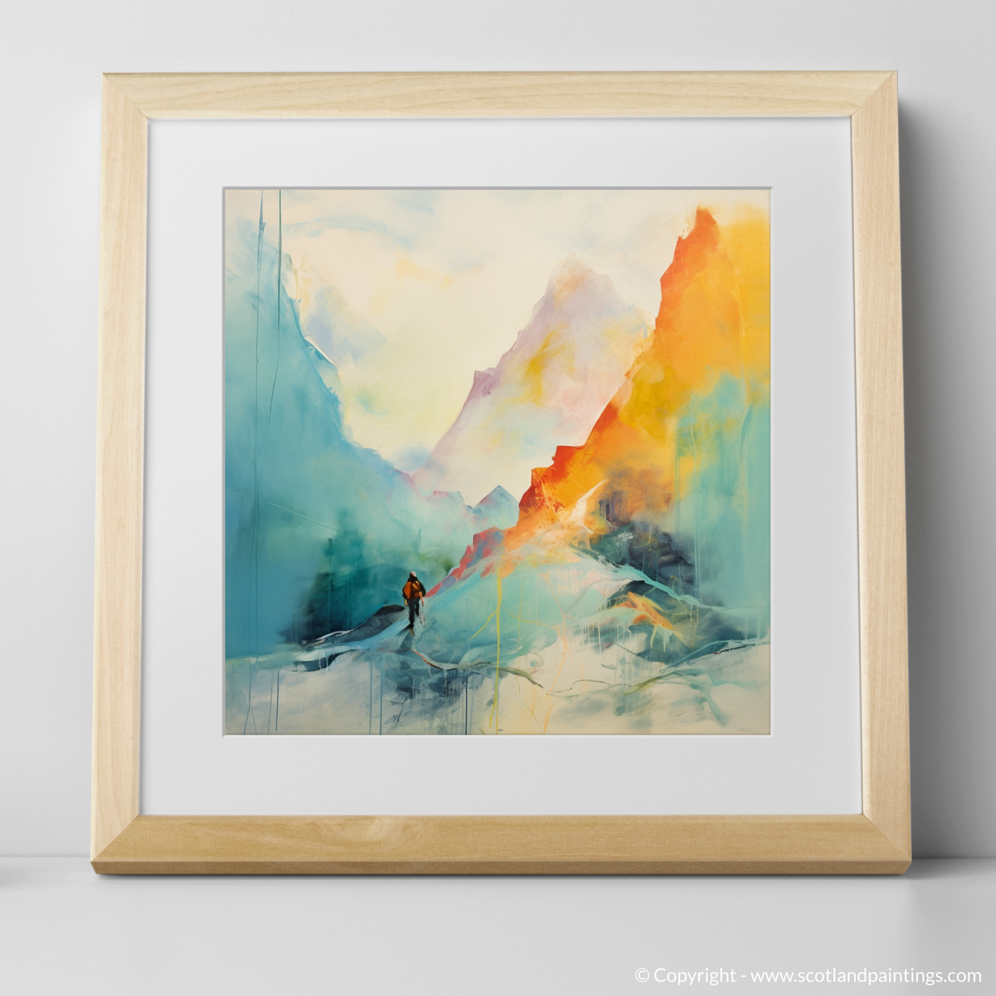 Immerse yourself in the ethereal beauty of Glencoe with this evocative abstract print, a tribute to the intrepid spirit of exploration. This piece masterfully captures a climber's solitary ascent amidst the misty crags and peaks of one of Scotland's most majestic landscapes.