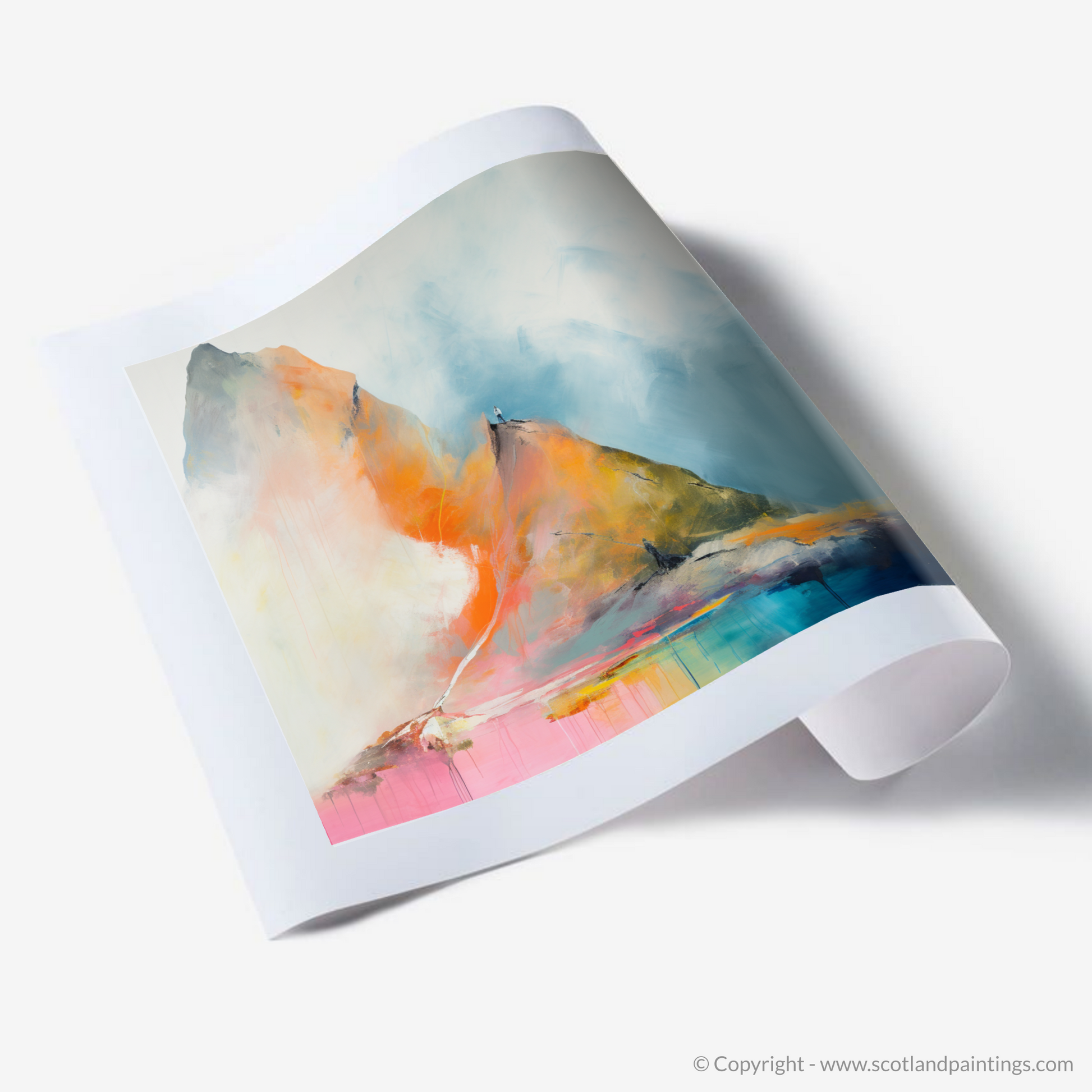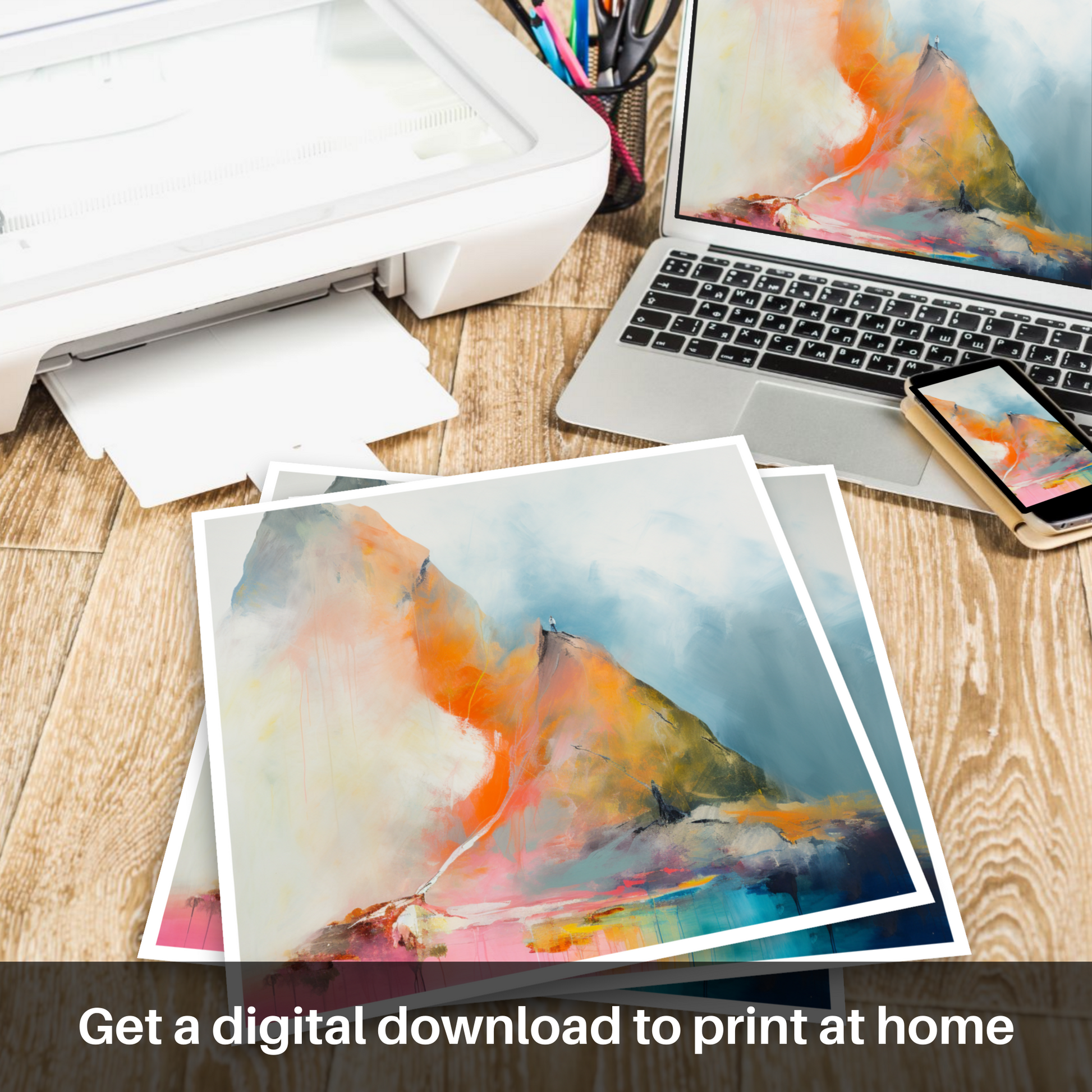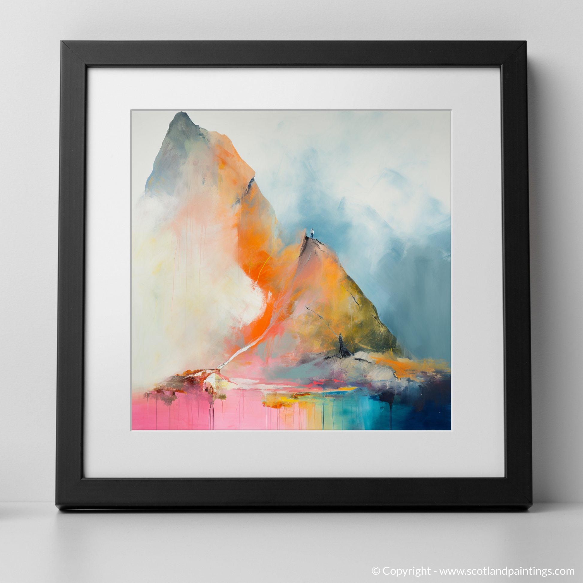 Immerse yourself in the atmospheric allure of Glencoe with this evocative abstract print. The essence of the Highlands has been masterfully captured through a bold symphony of vibrant hues and sweeping brushstrokes. Dominated by an enigmatic misty peak, the composition portrays a solitary climber reaching the summit, symbolising both isolation and triumph against the awe-inspiring backdrop.