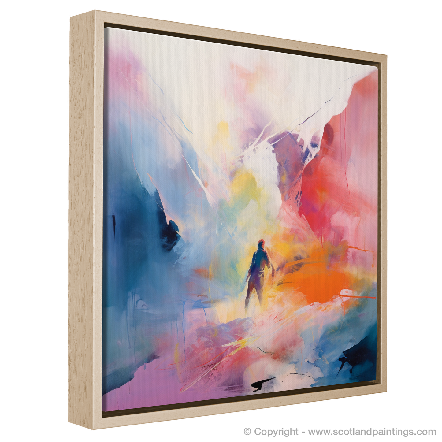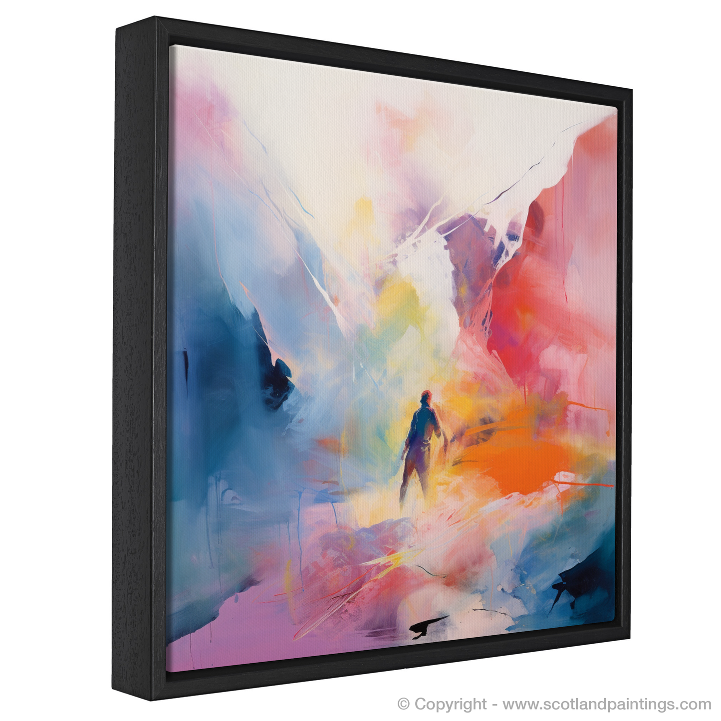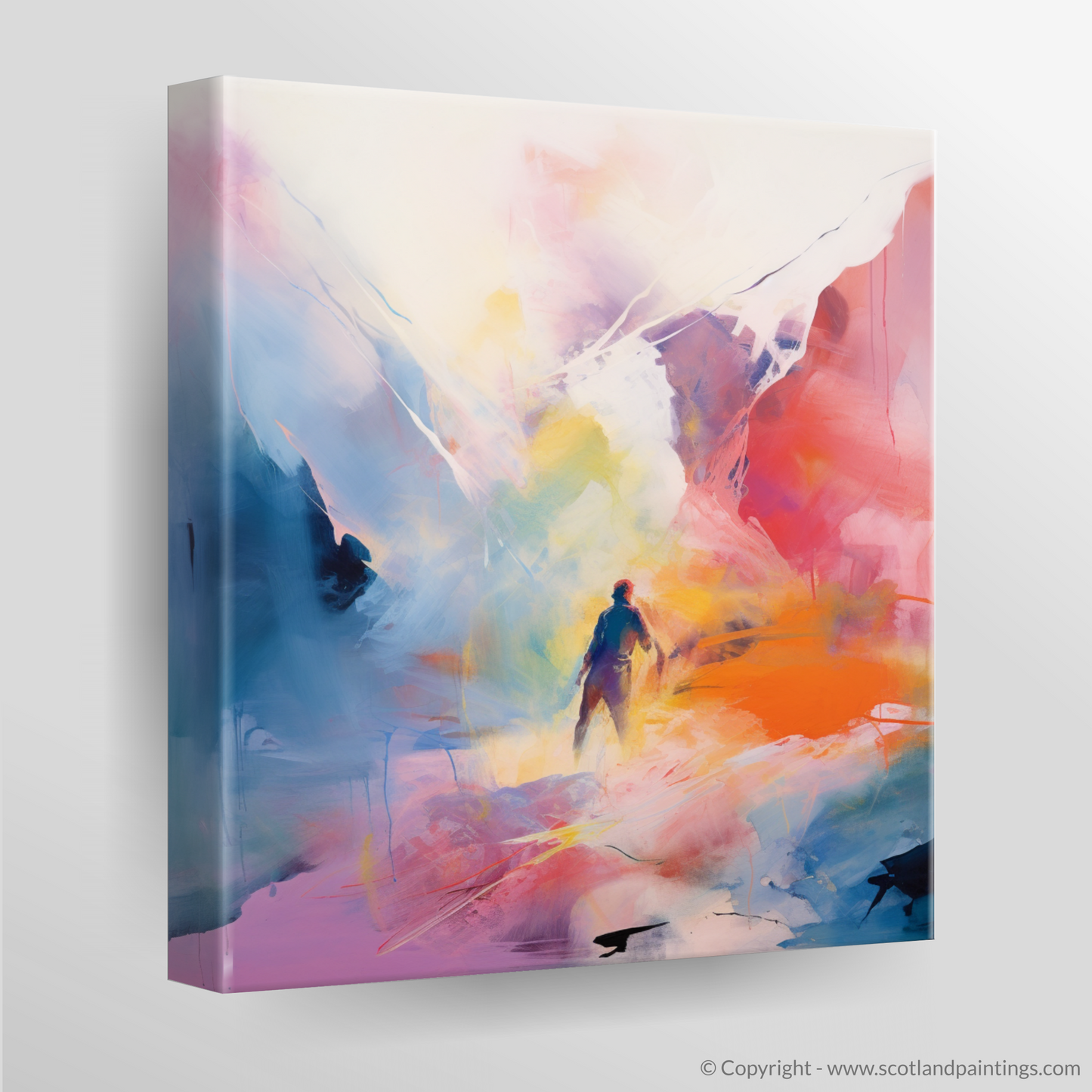 Capturing the ethereal beauty of Glencoe with bold strokes and a vibrant palette, this piece transports viewers to a realm where bold colours blend and dance like the swirling mists around a solitary climber. The ascent is told through an explosion of colour, with shades of crimson, sapphire, and sun-kissed yellows converging into a visual symphony of abstract beauty that invites the mind to wander and the spirit to soar.