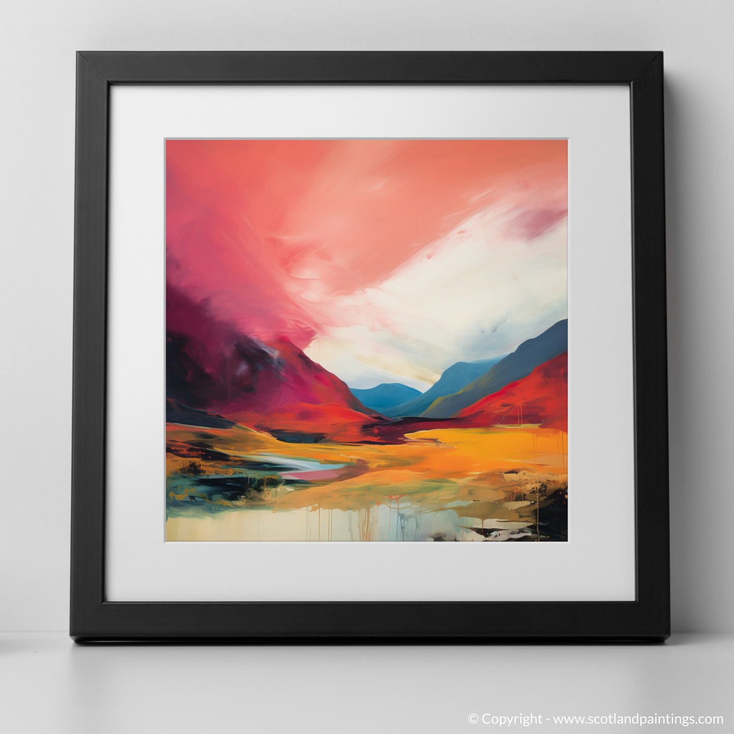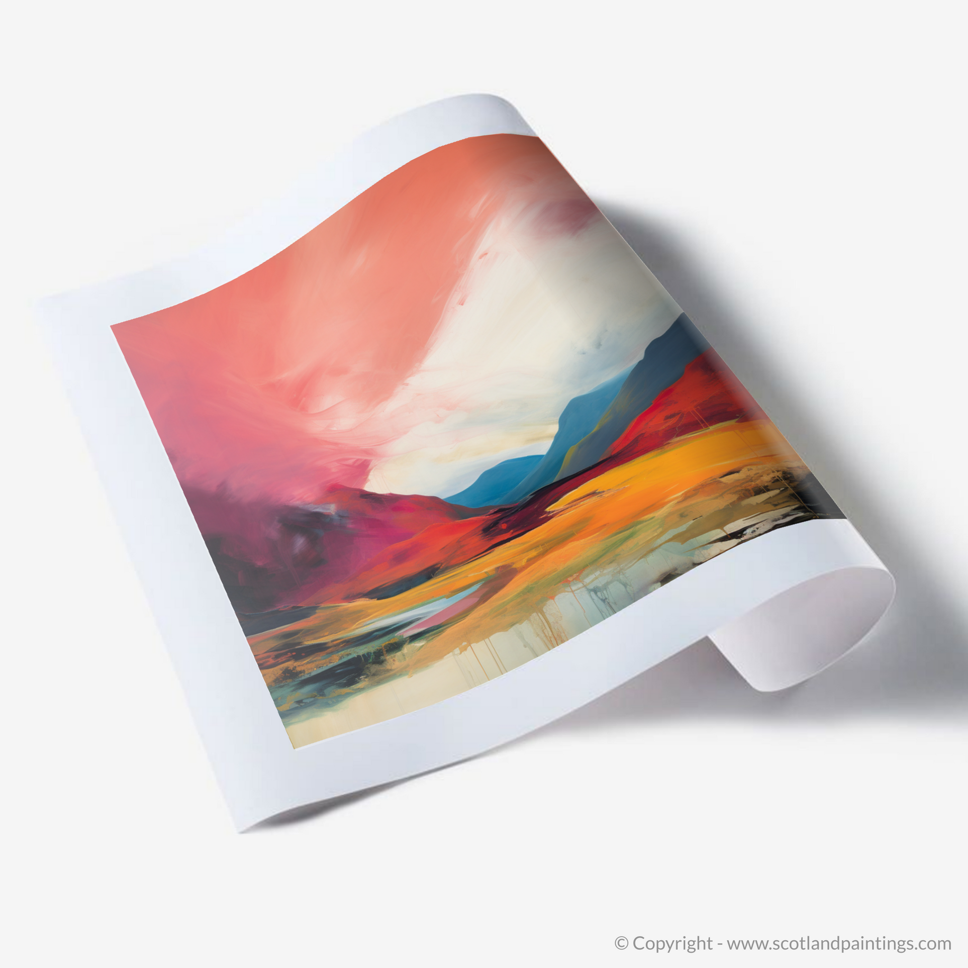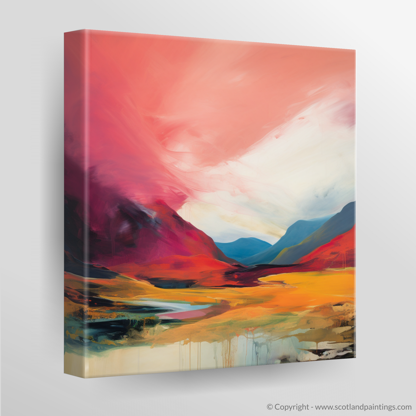 Immerse yourself in a dreamscape of vibrant colours and emotions with this abstract representation of Glencoe's stunning scenery. The captivating composition invites onlookers into a world where crimson and blush hues burn fiercely in the sky, melting into a tranquil yet lively concoction of tones below. A fusion of warm yellows, oranges, and reds echo the intense beauty of a valley bathed in the glow of an otherworldly sunset.