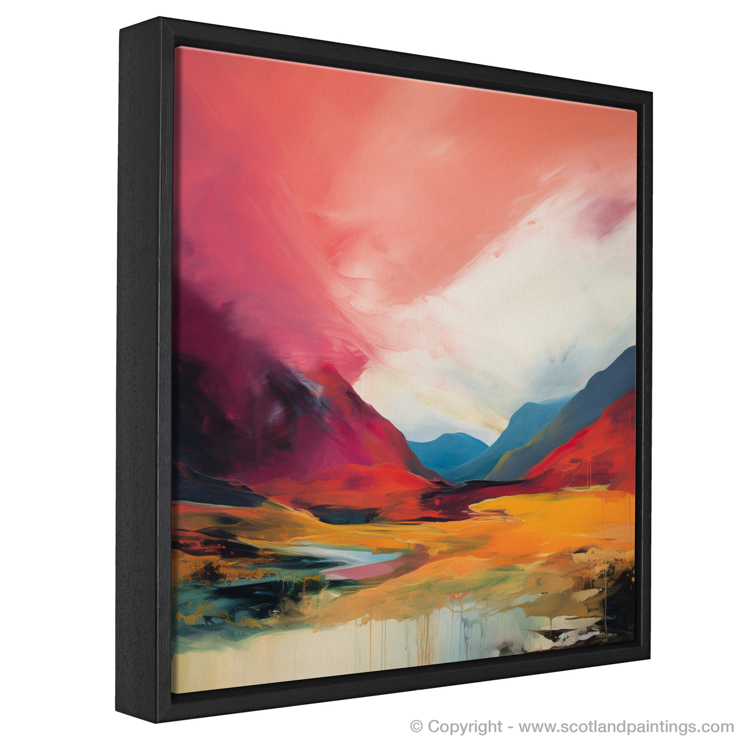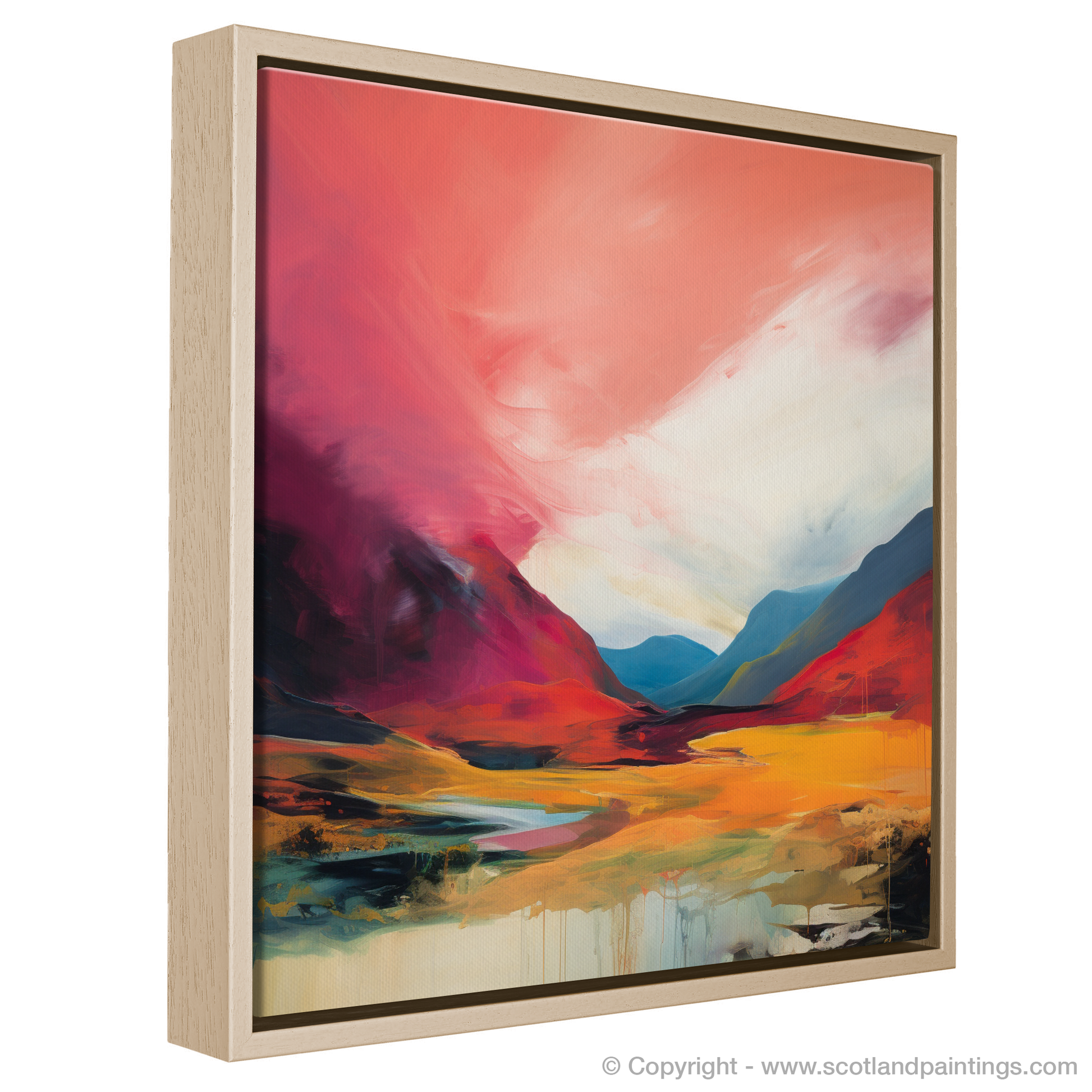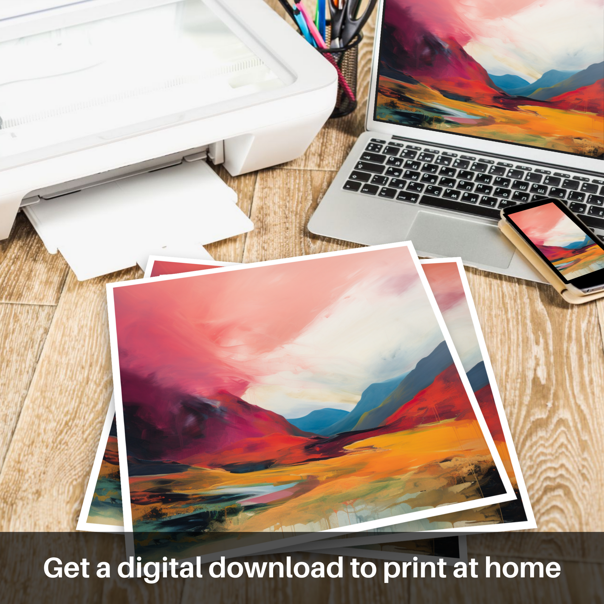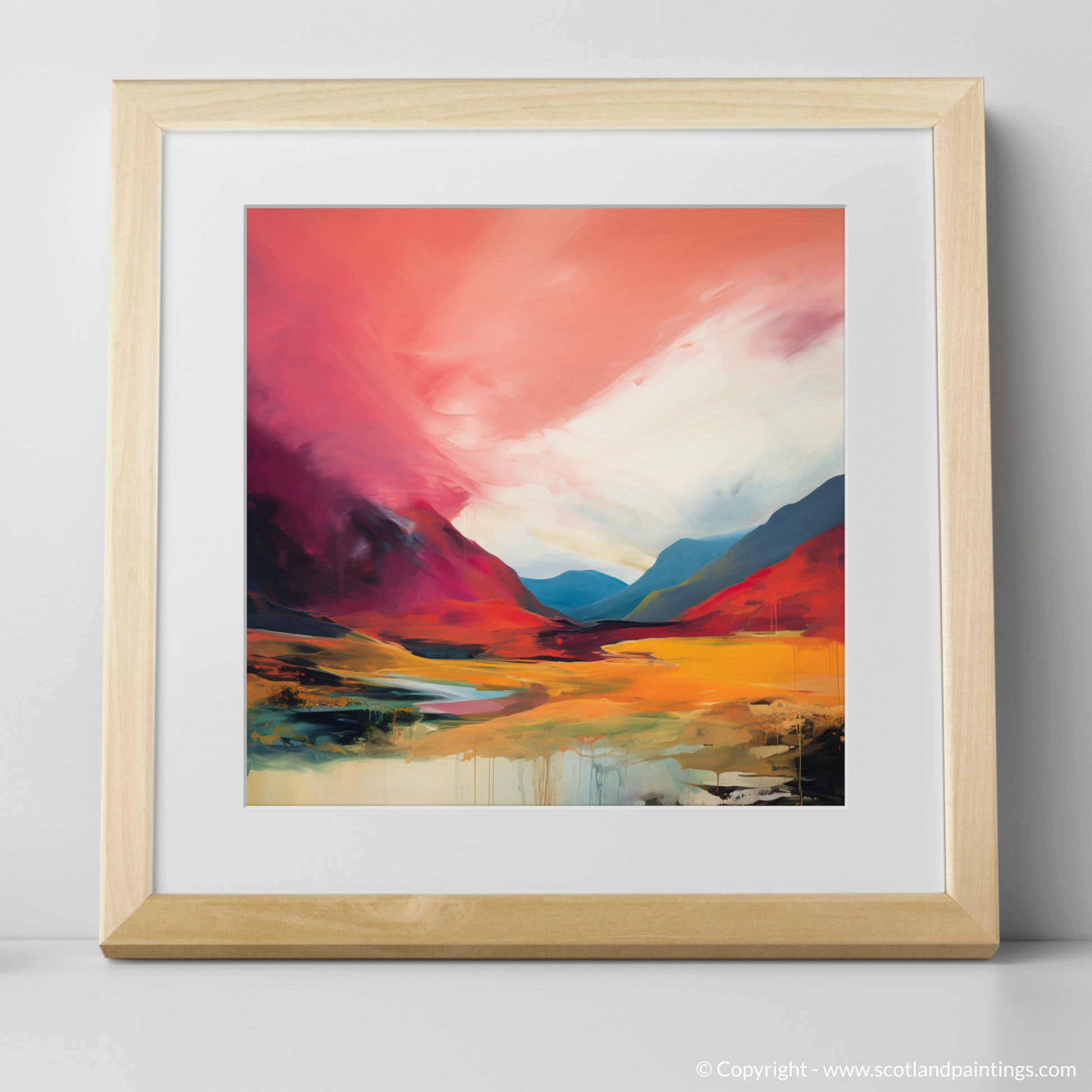 Immerse yourself in a dreamscape of vibrant colours and emotions with this abstract representation of Glencoe's stunning scenery. The captivating composition invites onlookers into a world where crimson and blush hues burn fiercely in the sky, melting into a tranquil yet lively concoction of tones below. A fusion of warm yellows, oranges, and reds echo the intense beauty of a valley bathed in the glow of an otherworldly sunset.