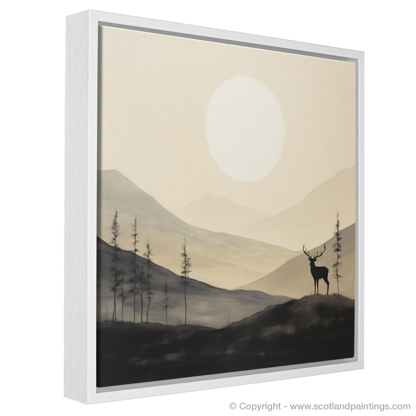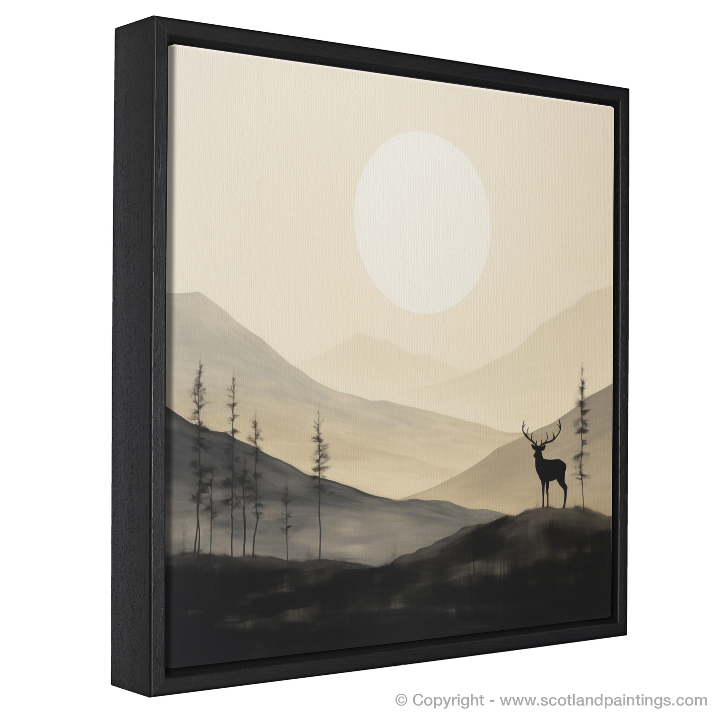 This visual symphony celebrates the quietude of nature, a stark contrast to the bustling of modern life, beckoning the observer into a moment of reflection and peace. The silhouetted stag, poised and regal, serves as a powerful focal point, a symbol of the untamed Scottish wilderness that commands attention amidst the subdued elegance of its surroundings.