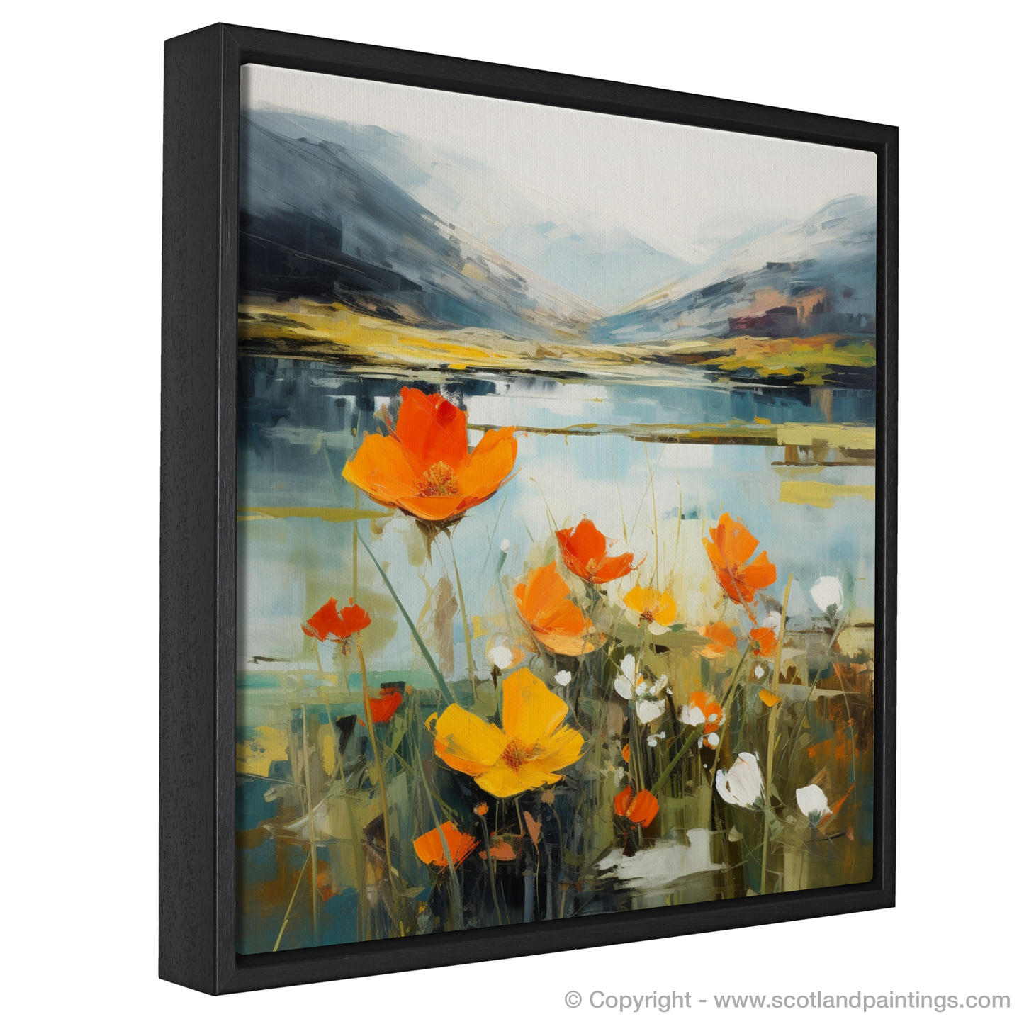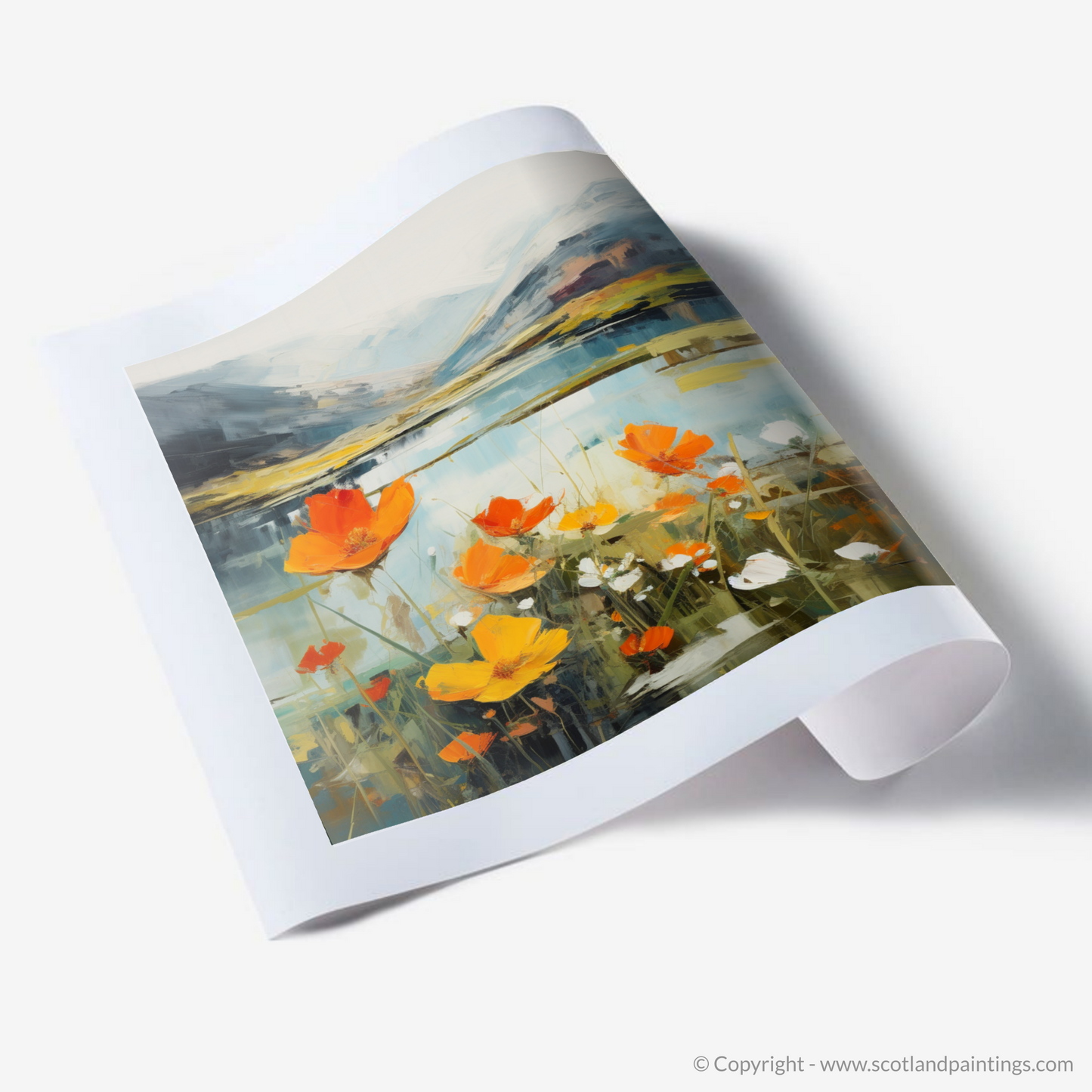 In the foreground, fiery Mountain avens boldly punctuate the canvas, their petals depicted with vivacious strokes of crimson and tangerine that seem to dance in an unseen breeze. Each flower, while abstracted, captures the wild spirit of Glencoe's flora, contrasting starkly with the cool, serene blues and greys of the lochan—a testament to the diversity of the area's natural palette.