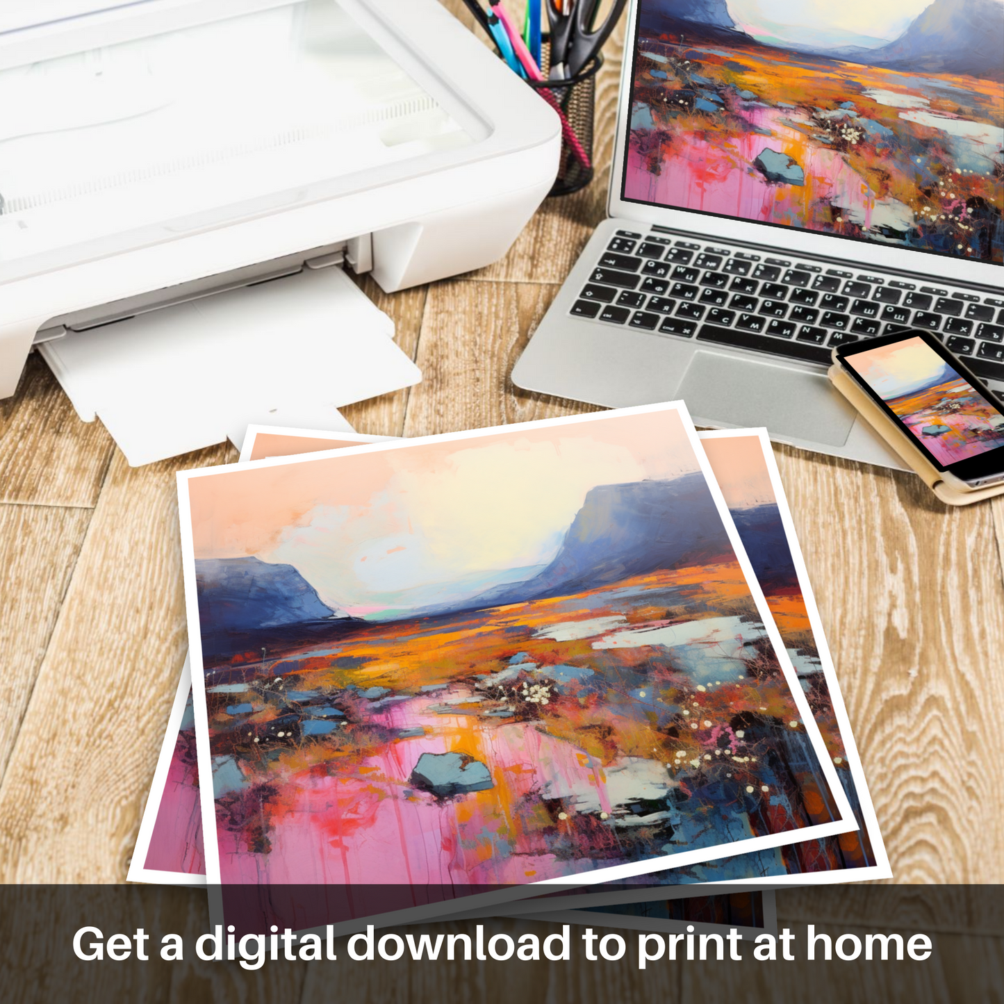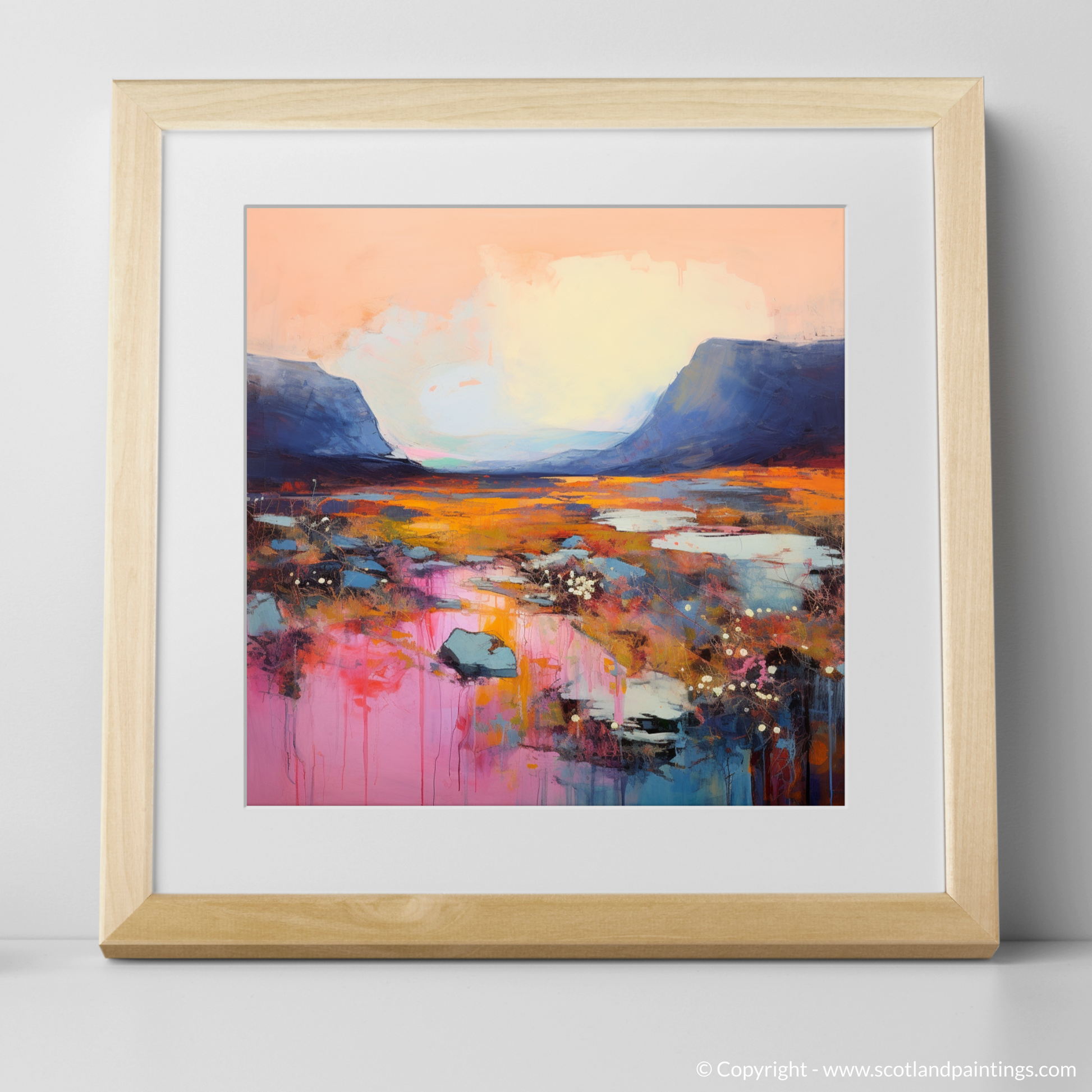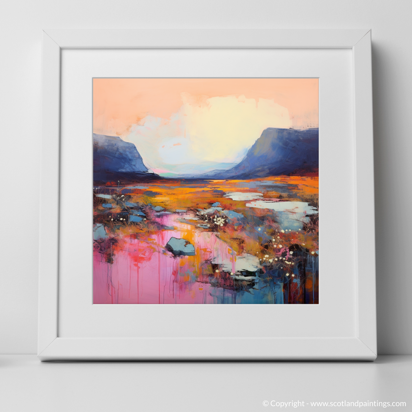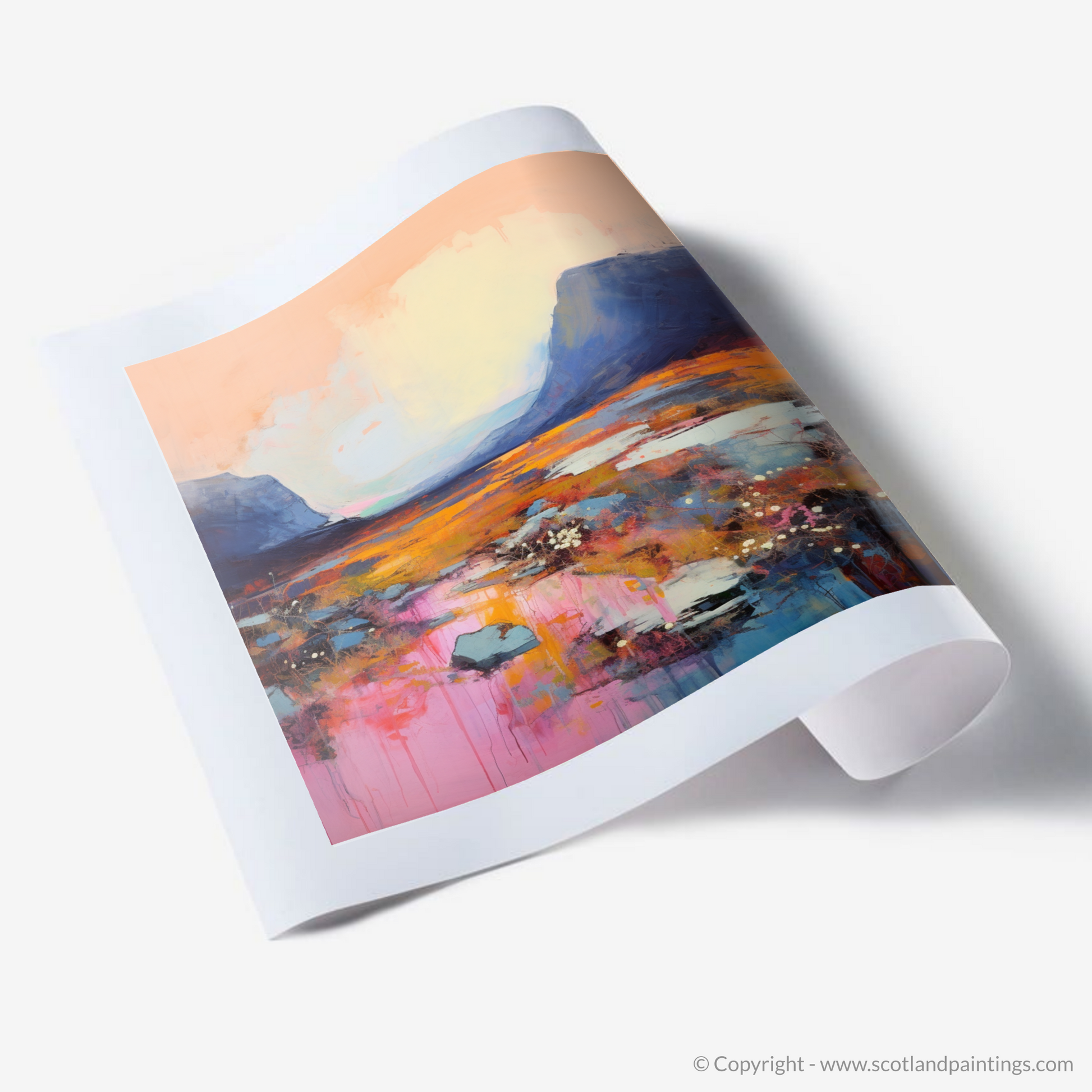 Immerse yourself in the ethereal beauty of Glencoe at twilight with this mesmerising abstract print. Capturing the essence of crowberry patches as daylight fades, the artwork swathes viewers in a tapestry of vibrant hues and expressive brushstrokes. Vivid oranges and fiery reds evoke the underbrush, juxtaposed with the cool, reflective blues and pinks indicating water - each stroke igniting the canvas with the dynamic interplay of light and shadow.