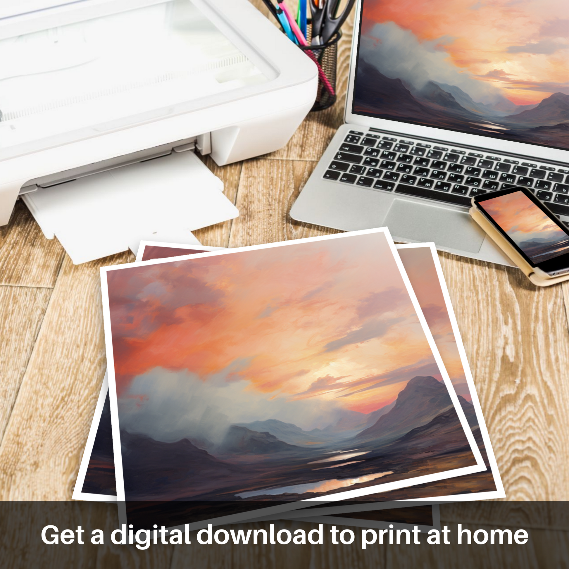 As the day yields to dusk, the ephemeral beauty of Glencoe is captured exquisitely in this minimalist depiction where the grandeur of nature speaks in whispers. The expansive canvas is dominated by a breathtaking skyscape, where swathes of moody clouds are set ablaze by the sun's dying embers, casting a melange of fiery orange, soft peach, and gentle lilac hues. The artfully restrained palette suggests the transient moments of sunset, where light and shadow dance in a synchronised ballet across the heavens.