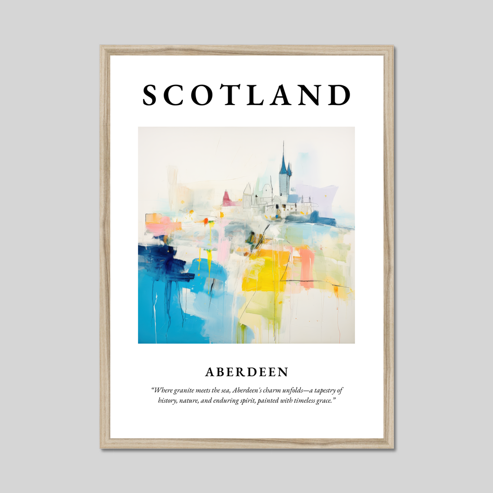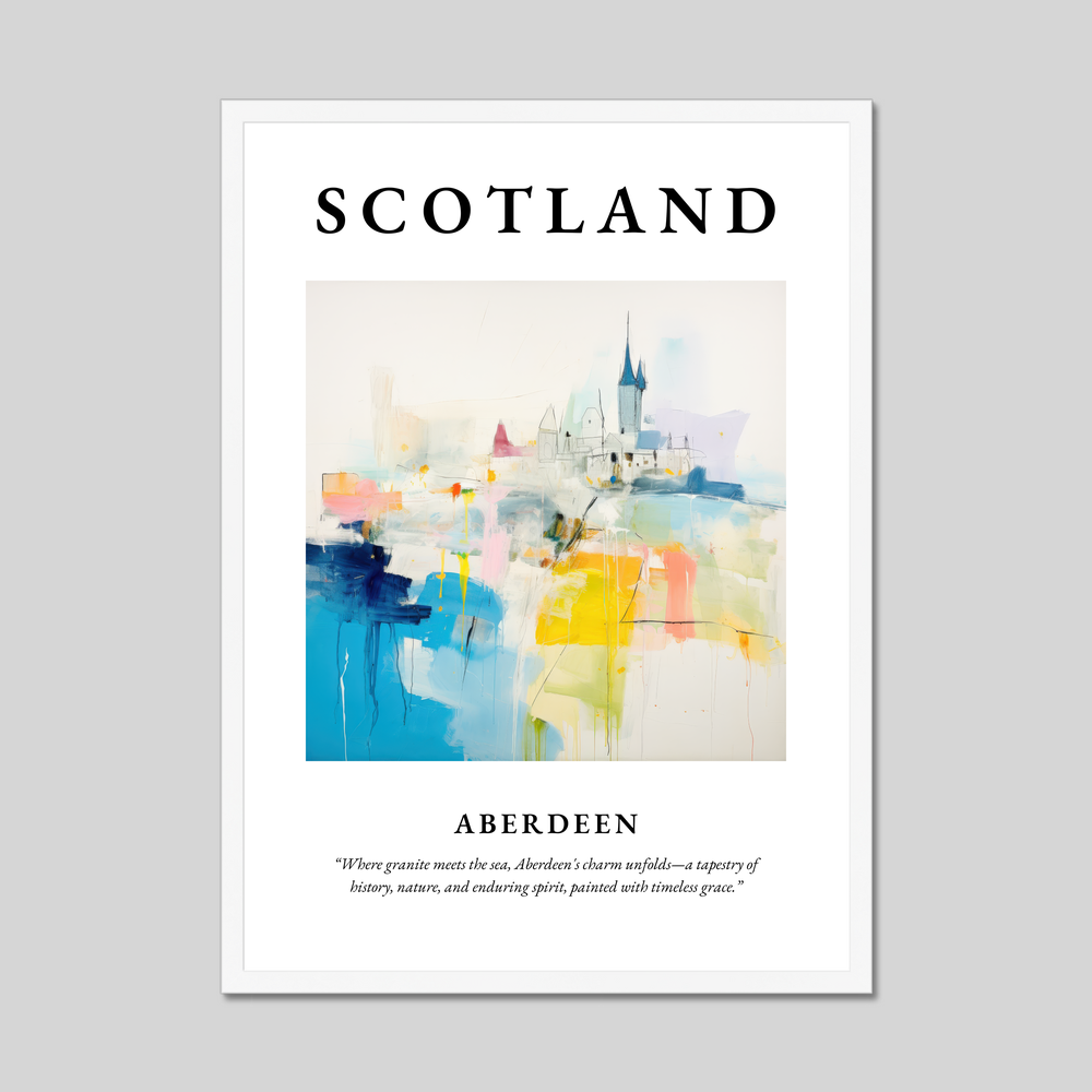 Underneath, the abstract painting of Aberdeen mesmerises with its mesmerising mix of colours and forms. The interplay of rich blues, warm yellows, and soft pastels creates a dynamic tapestry, perfectly echoing the city's blend of history, nature, and contemporary life. Complemented by the evocative quote, “Where granite meets the sea, Aberdeen's charm unfolds—a tapestry of history, nature, and enduring spirit, painted with timeless grace,” this poster is more than just a piece of art; it’s a heartfelt ode to a city beloved by many.