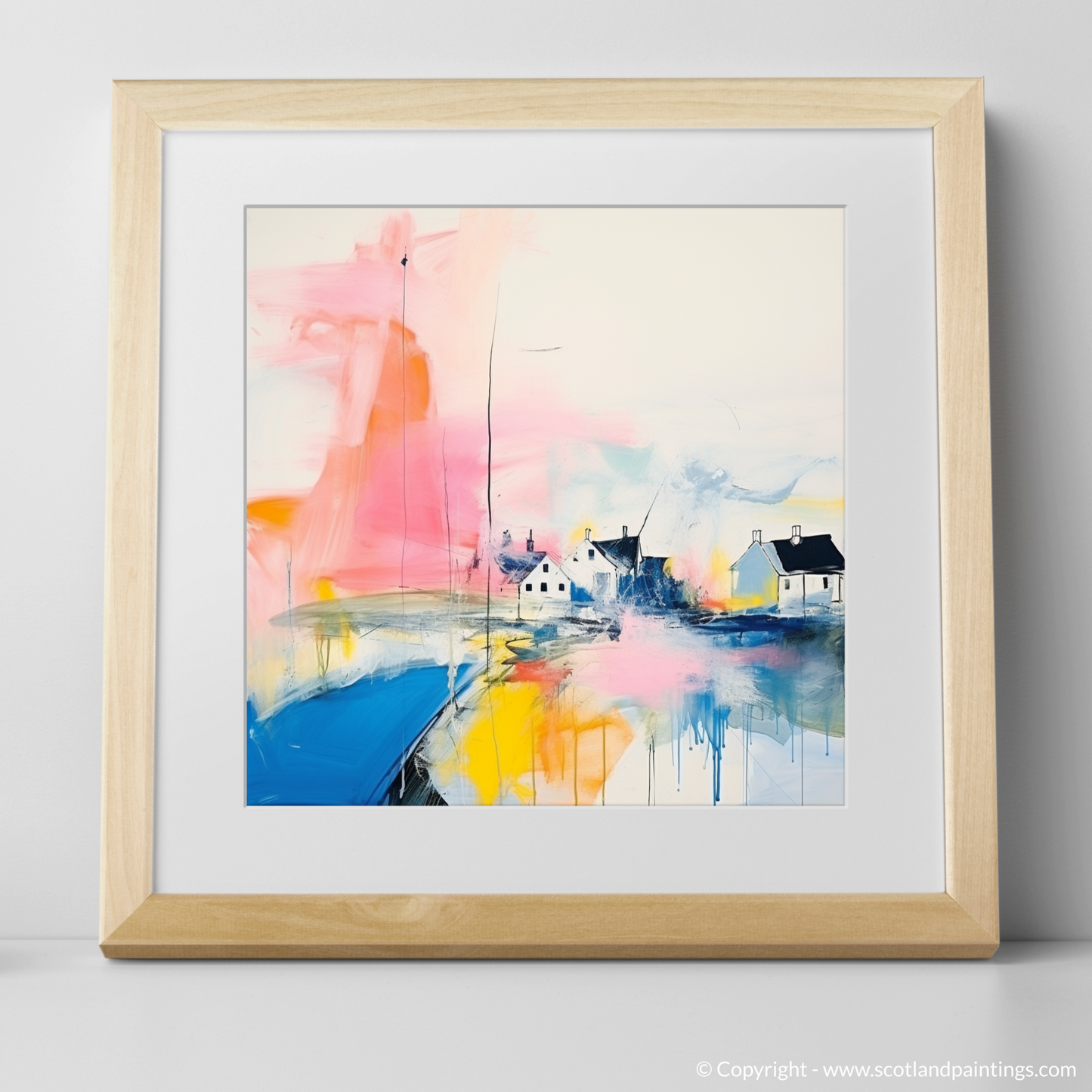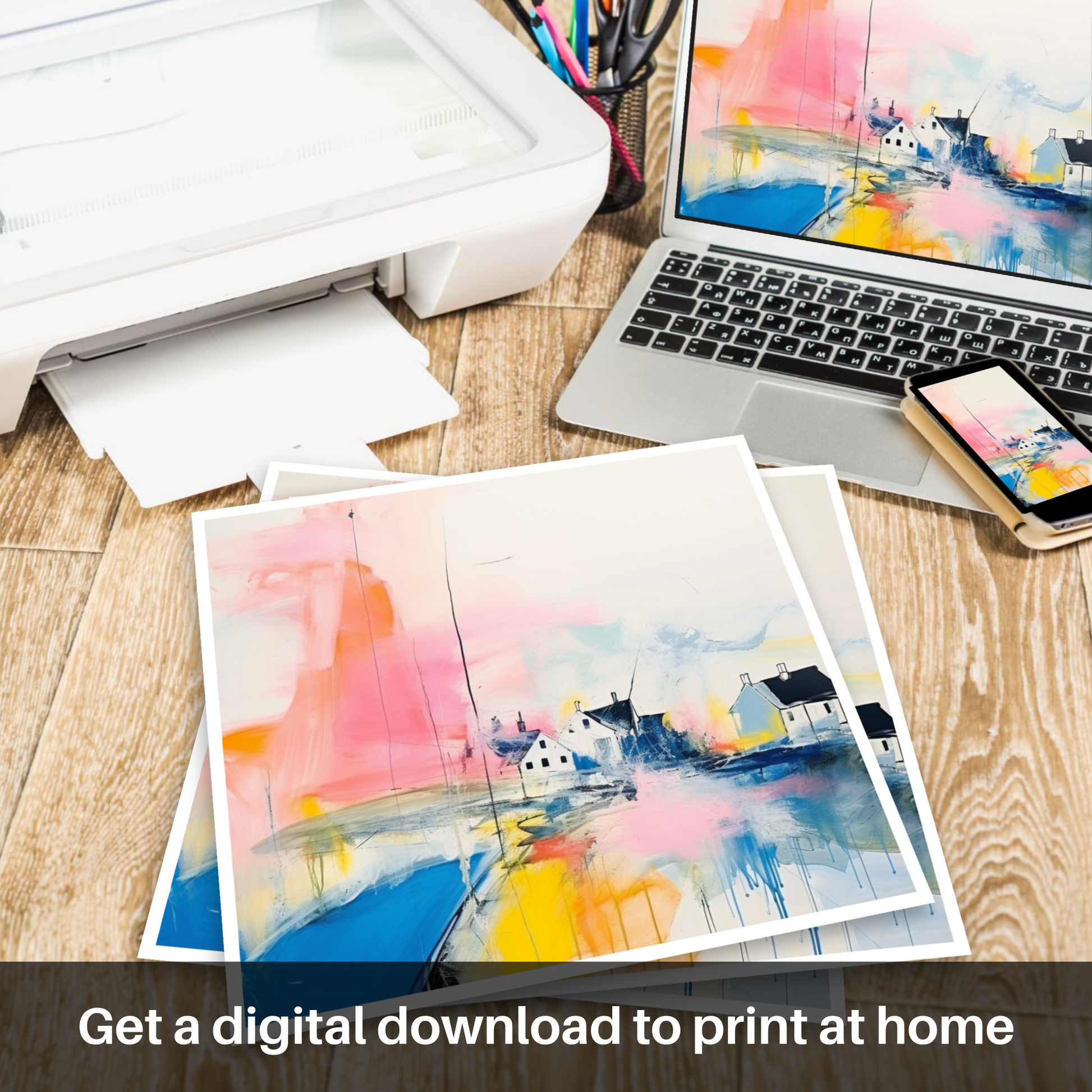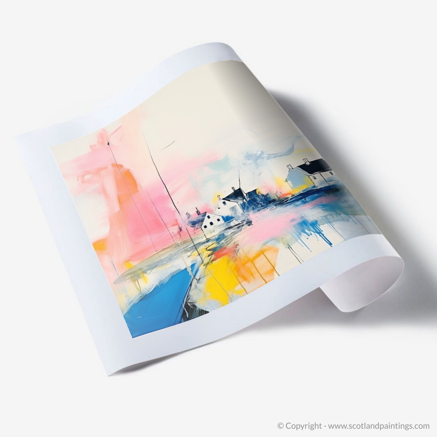 Immerse yourself in the vibrant essence of Aberdeen with this captivating abstract print, a spirited homage to the Granite City nestled in Aberdeenshire. Sweeping strokes of cerulean blue and bright yellow hues dance across the canvas, symbolizing the dynamic juxtaposition of the city's bustling harbour and the tranquil, golden sands of its beach. Bold splotches of coral and pink infuse the piece with the warmth of a sunset bathing the city's historic architecture.