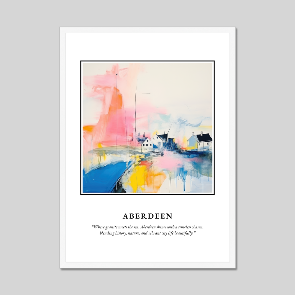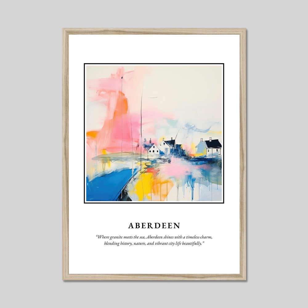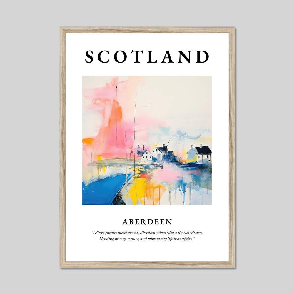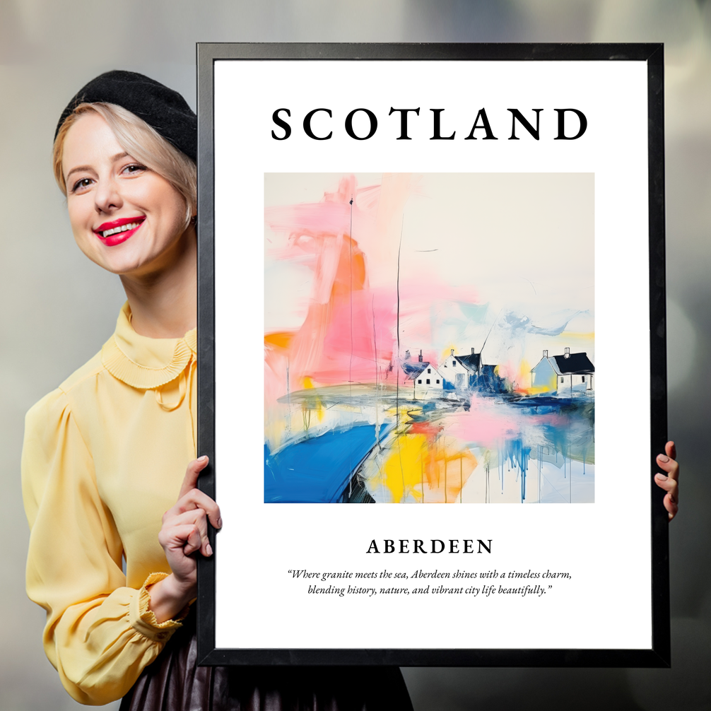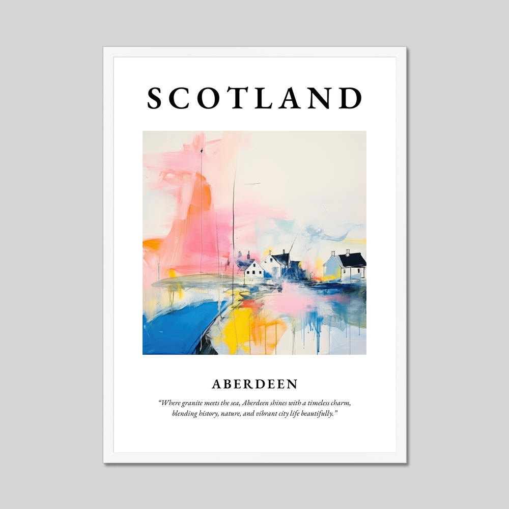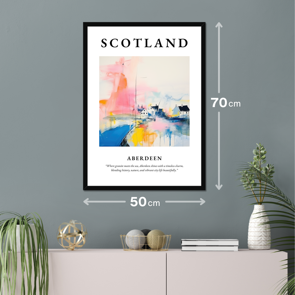Immerse yourself in the captivating allure of Scotland with our stunning framed poster print, celebrating the enchanting city of Aberdeen. Measuring an impressive 50cm x 70cm, this piece serves as a striking focal point in any room, proudly displaying the grandeur of Scottish charm without breaking the bank. It features "SCOTLAND" in bold at the top, perfectly framing a beautifully abstract interpretation of Aberdeen — a city where granite meets the sea, encapsulated in the quote: “Where granite meets the sea, Aberdeen shines with a timeless charm, blending history, nature, and vibrant city life beautifully.”