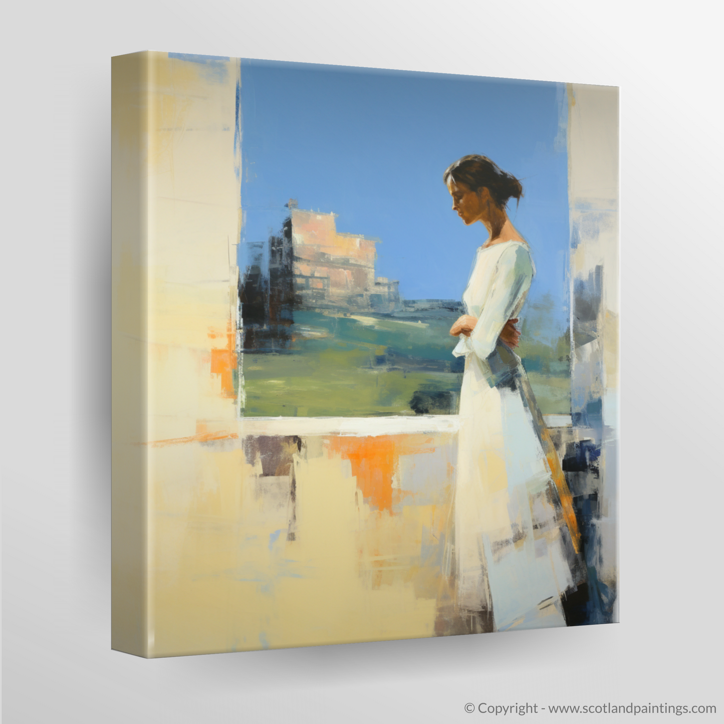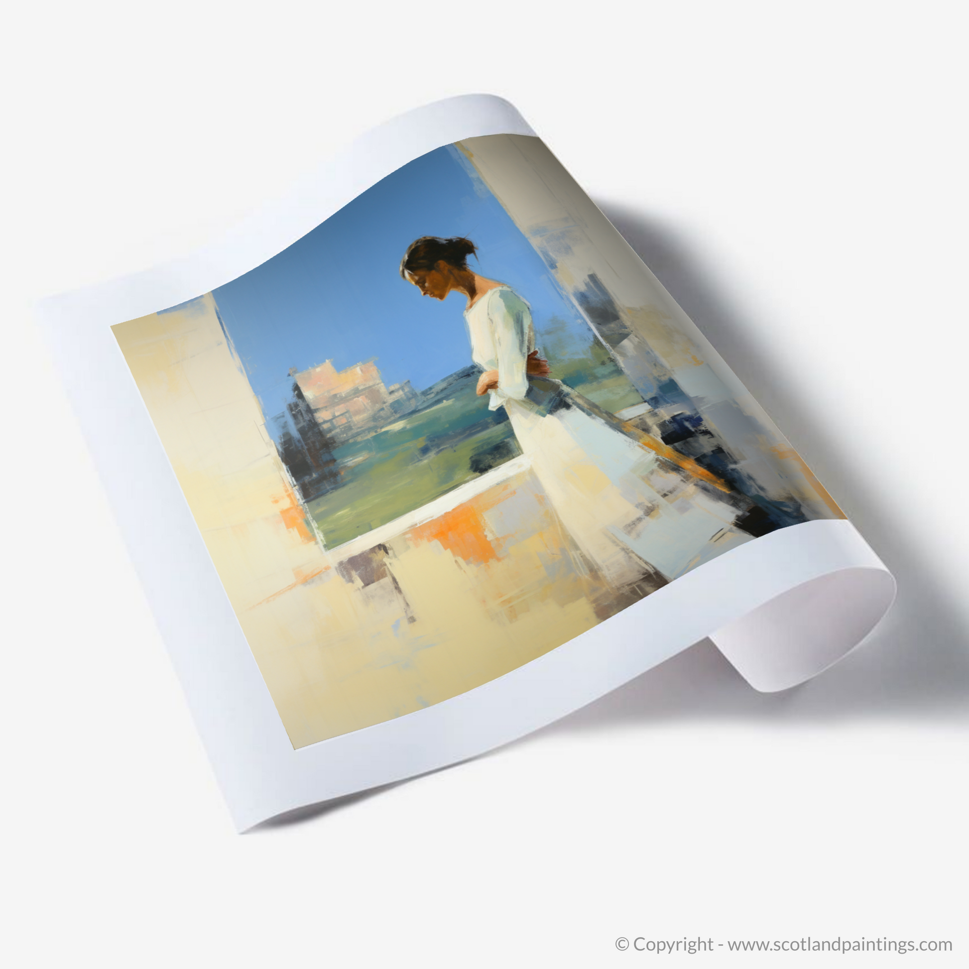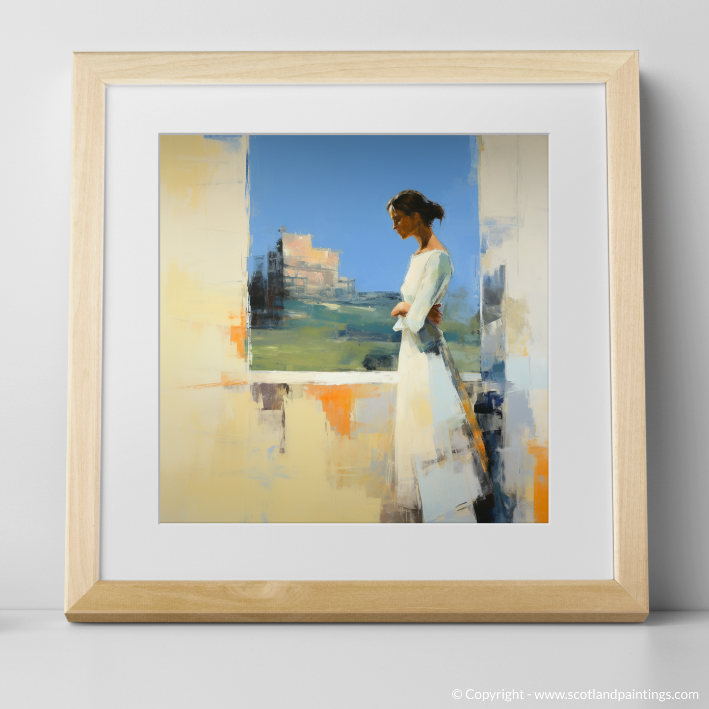 Capturing a moment suspended in time, this abstract print invites the viewer into a serene world where the past meets the present. At the heart of the composition is a contemplative woman adorned in a flowing white dress, exuding grace and poise. She is depicted in profile, gazing thoughtfully at the majestic Stirling Castle, which emerges from the canvas in a symphony of textured brushstrokes and a mosaic of colour.