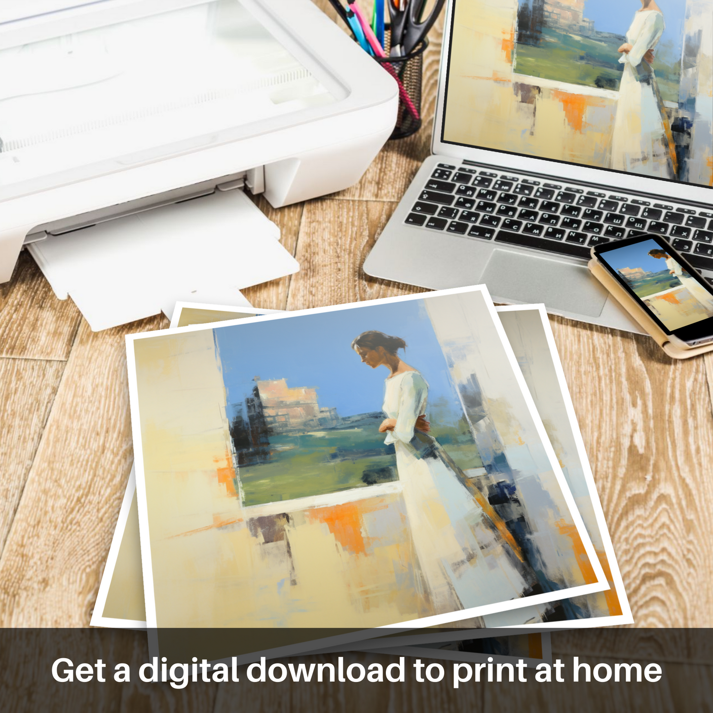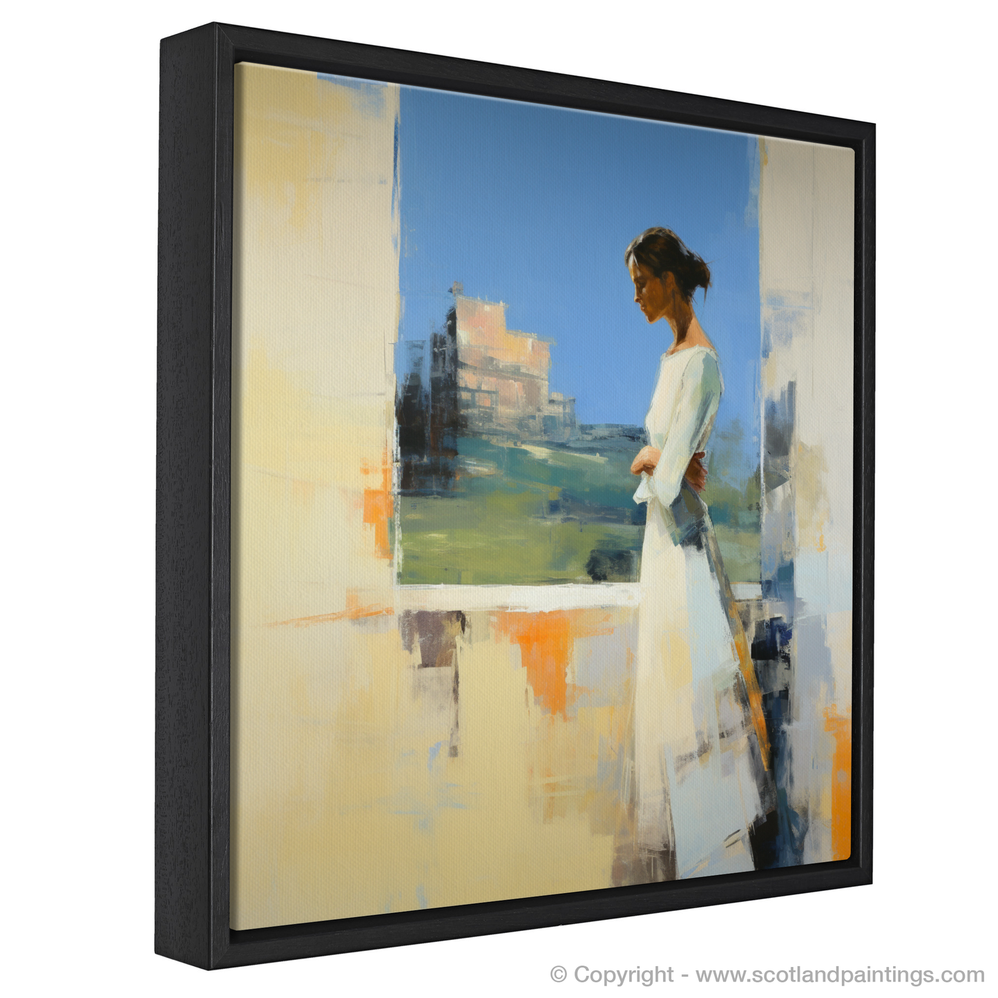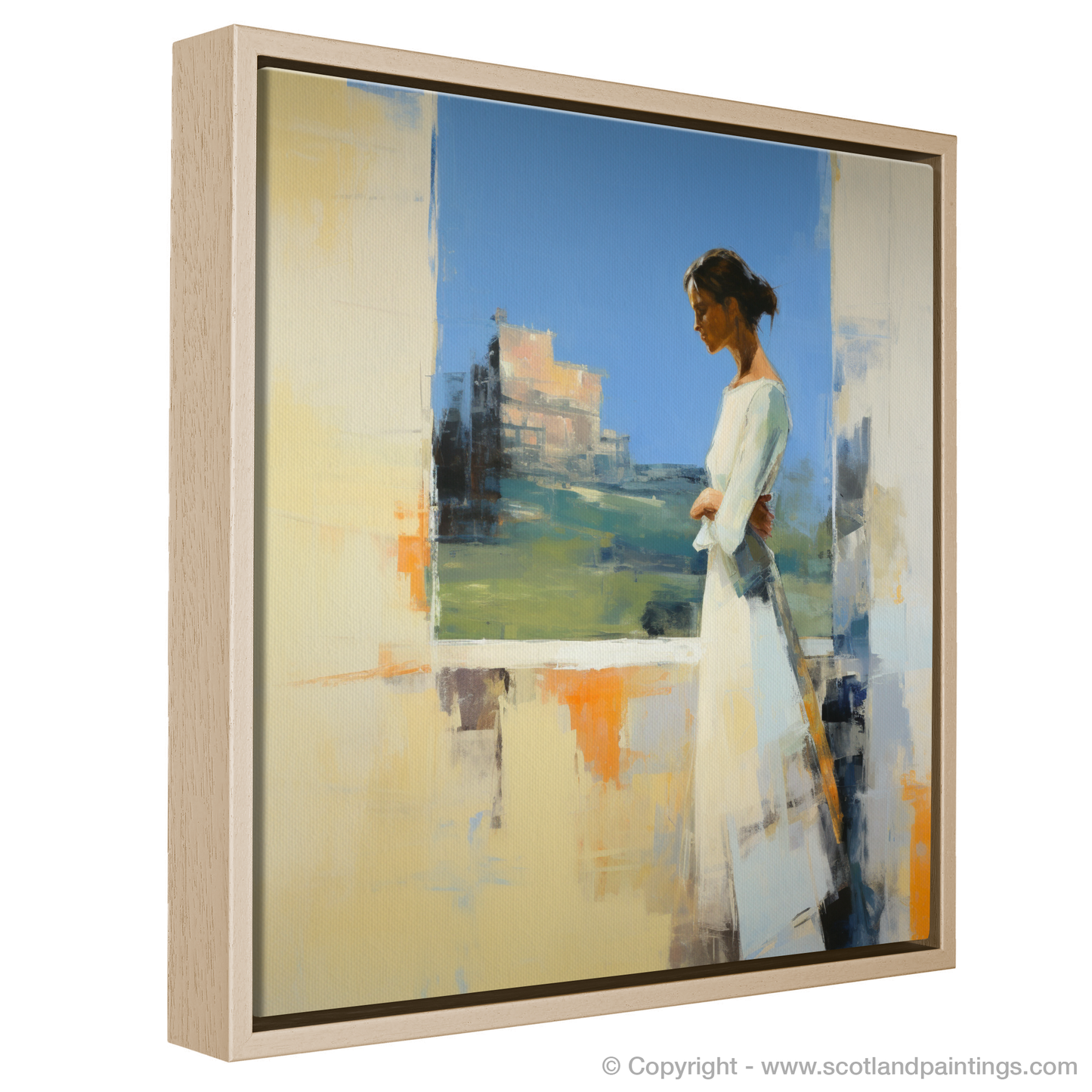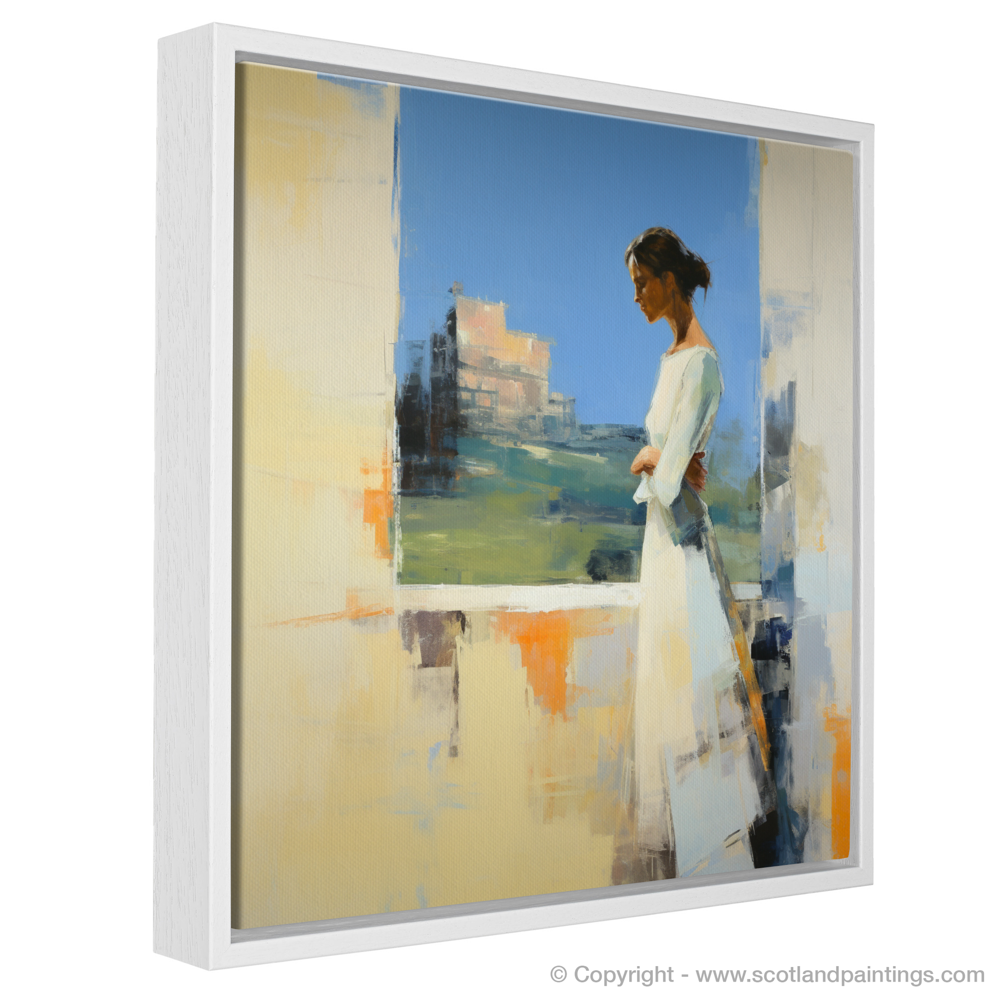 Capturing a moment suspended in time, this abstract print invites the viewer into a serene world where the past meets the present. At the heart of the composition is a contemplative woman adorned in a flowing white dress, exuding grace and poise. She is depicted in profile, gazing thoughtfully at the majestic Stirling Castle, which emerges from the canvas in a symphony of textured brushstrokes and a mosaic of colour.