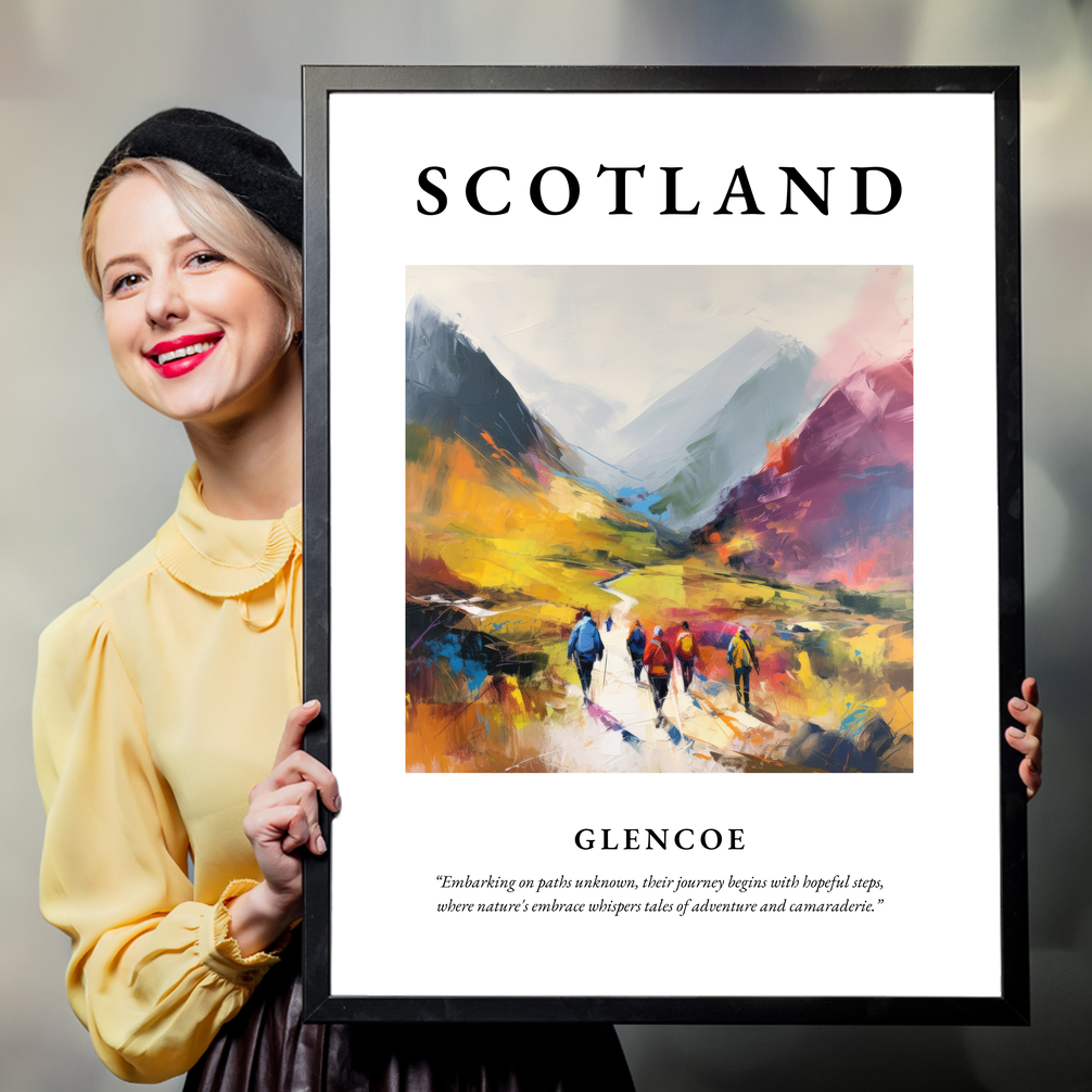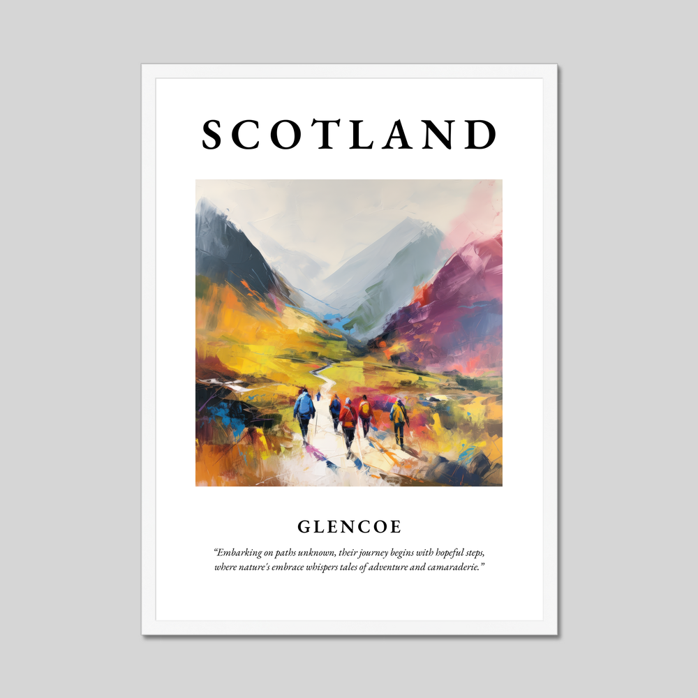 The poster boldly proclaims "SCOTLAND" in large, prominent lettering, immediately drawing the eye upwards before leading you down into the enchanting abstract landscape below. The painting is a rich tapestry of vivid colours, depicting the rugged beauty of Glencoe. Sweeping strokes of orange and yellow invoke the warmth of a Highland sunset, while cooler blues and striking purples add depth and drama to the scene. In its midst, a group of adventurers tread a winding path, embodying the spirit of exploration and camaraderie inscribed in the below quote: "Embarking on paths unknown, their journey begins with hopeful steps, where nature's embrace whispers tales of adventure and camaraderie."