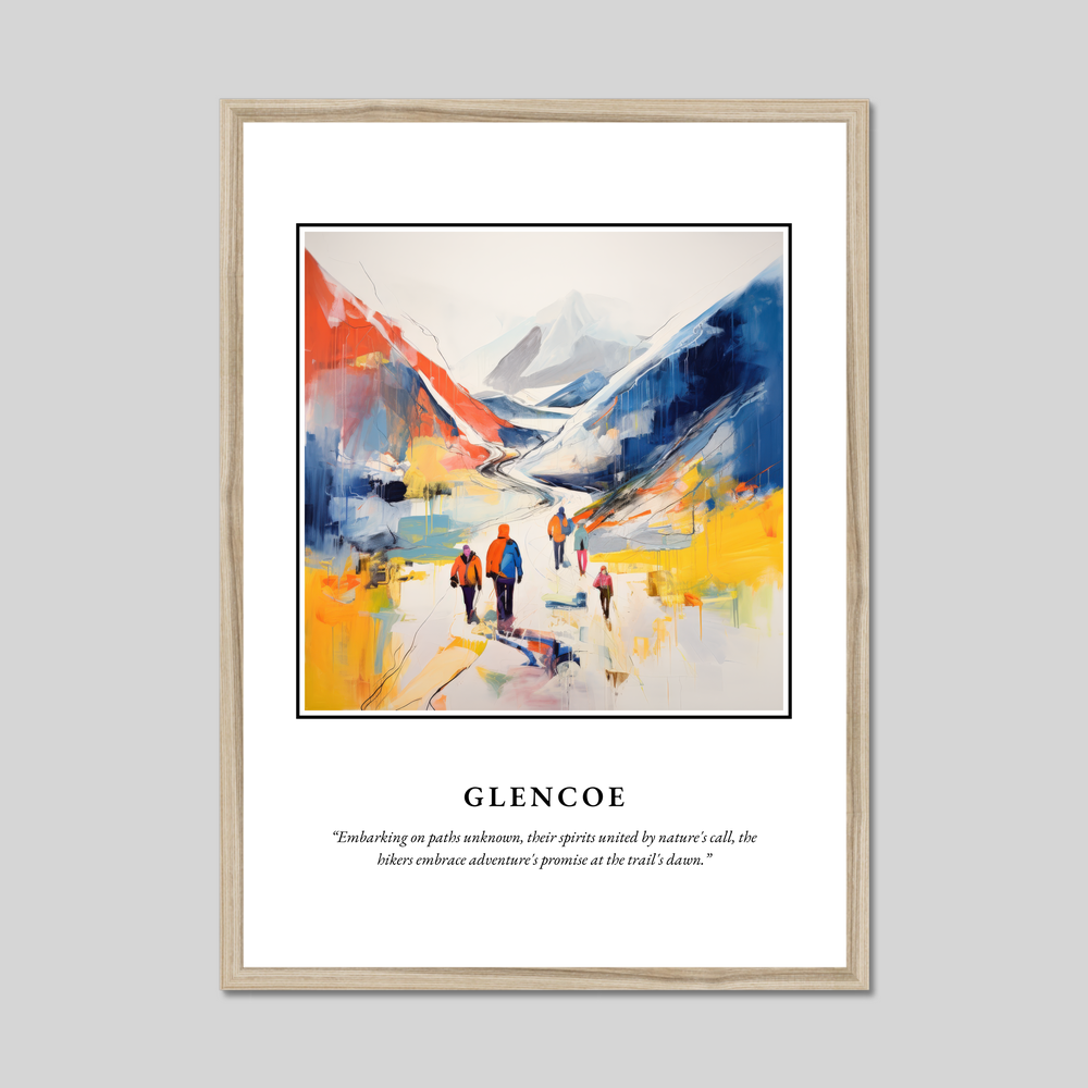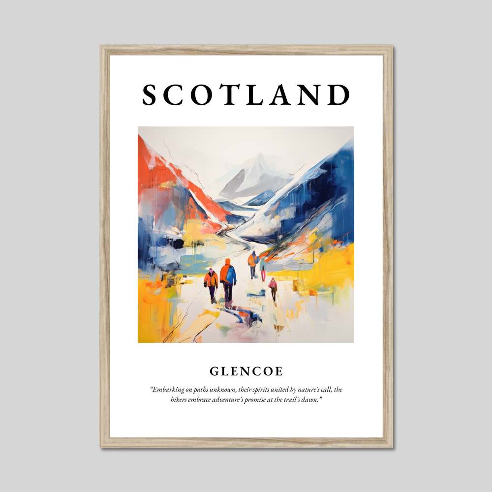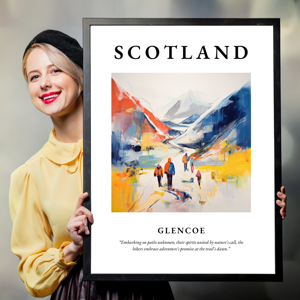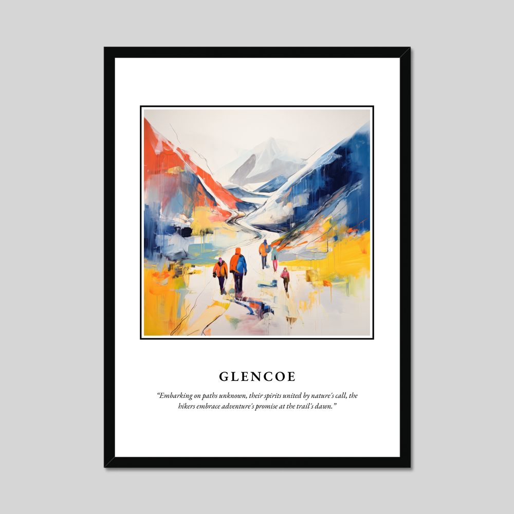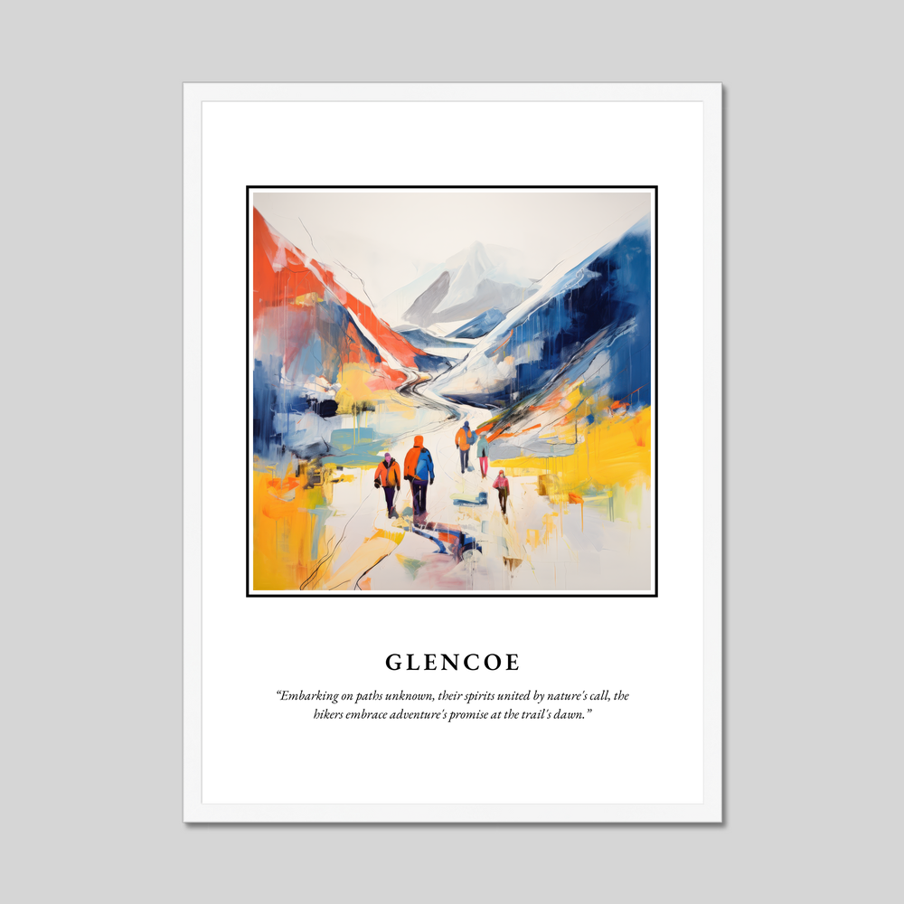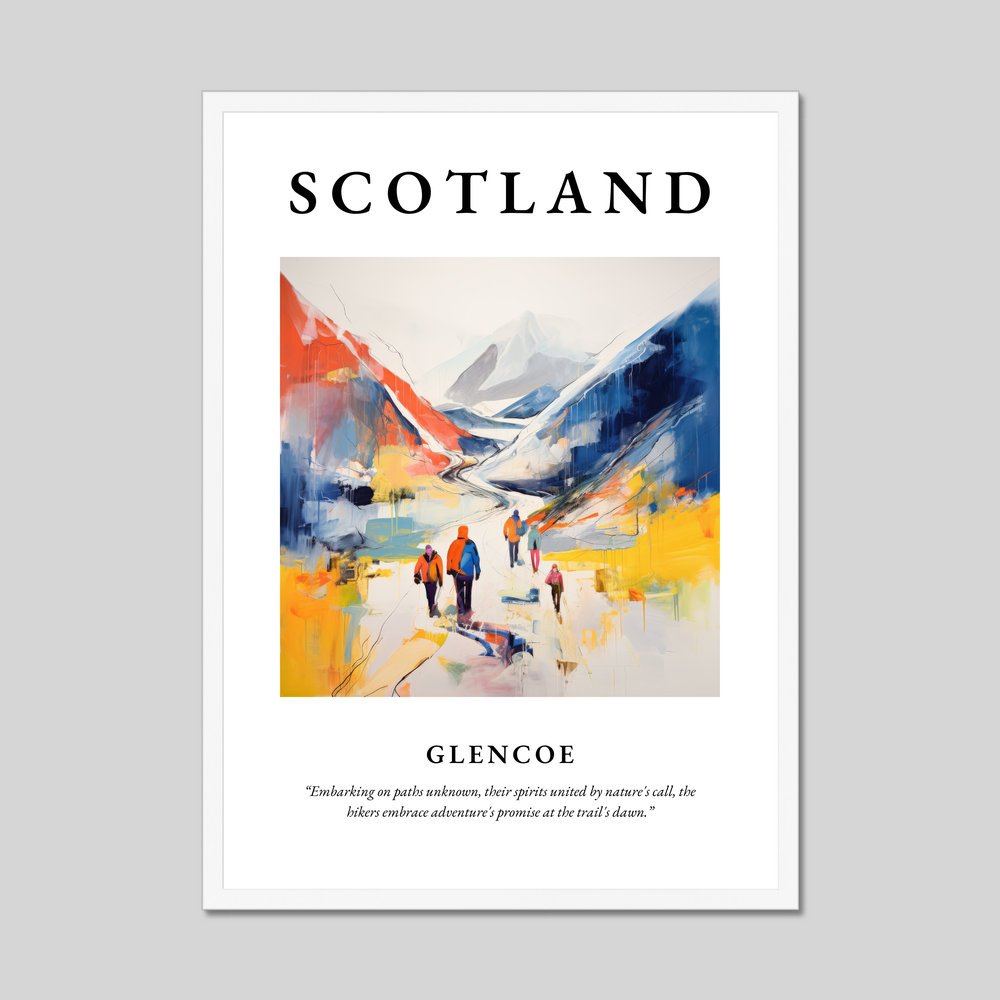 At the top, the word “SCOTLAND” commands attention in big bold lettering, setting the stage for the mesmerising scene below. A journey unfolds in the abstract depiction of Glencoe, where hikers tread paths awash with dynamic strokes and vibrant splashes. The artwork captures the harsh beauty and serene allure of the Scottish Highlands, evoking a sense of adventure and unity with nature. Beneath the painting, an inspiring quote invites you to embrace the promise of exploration: “Embarking on paths unknown, their spirits united by nature's call, the hikers embrace adventure's promise at the trail's dawn.”