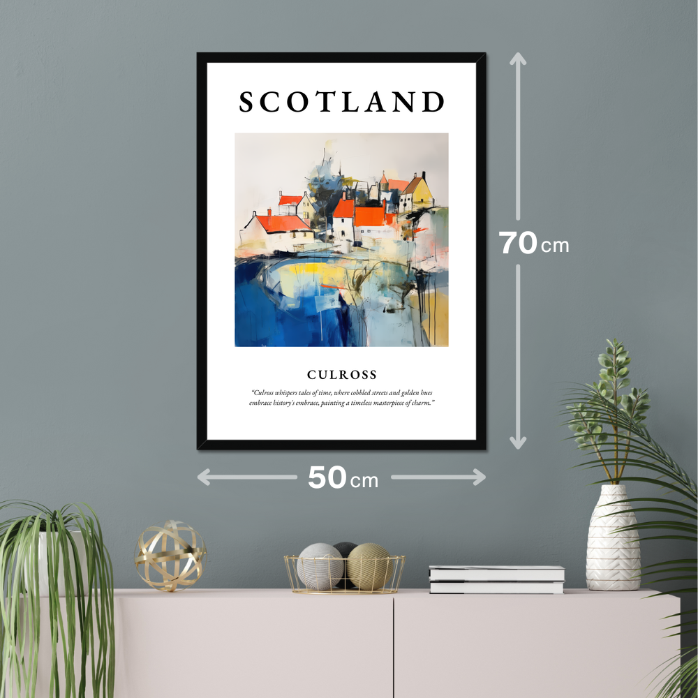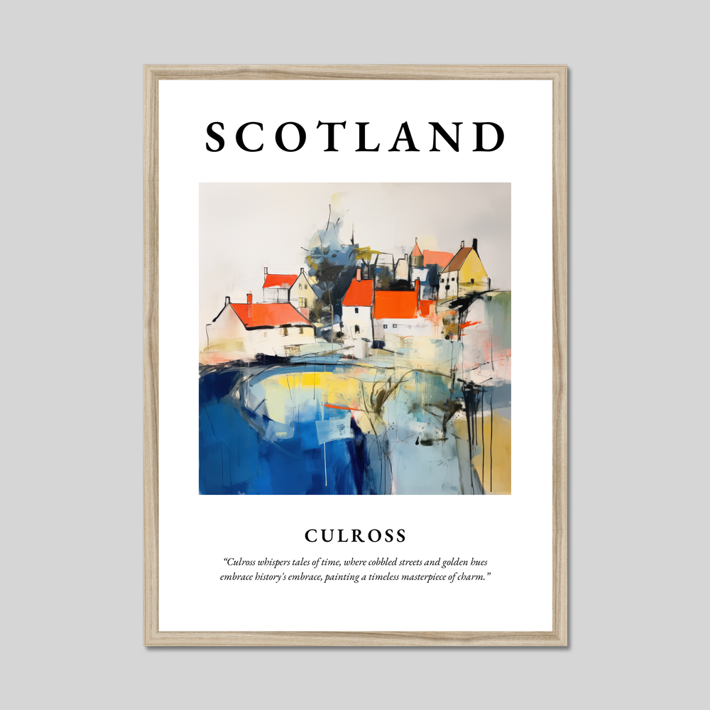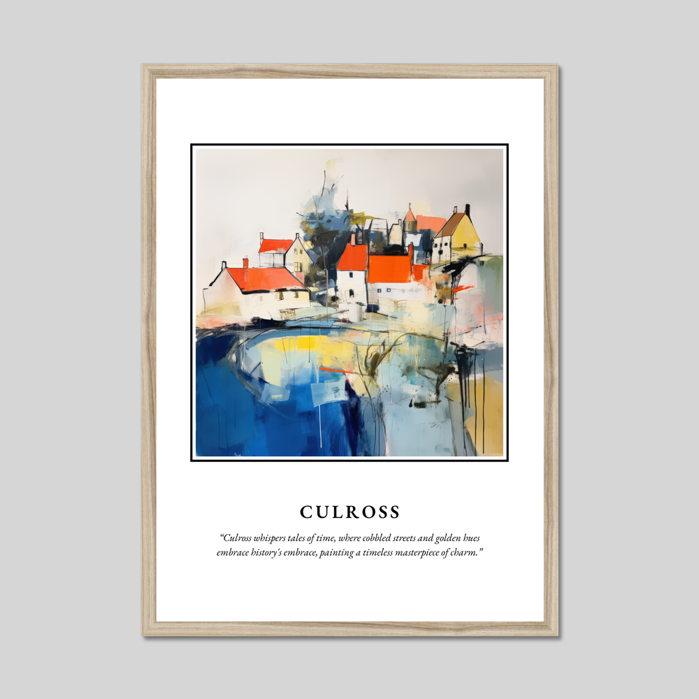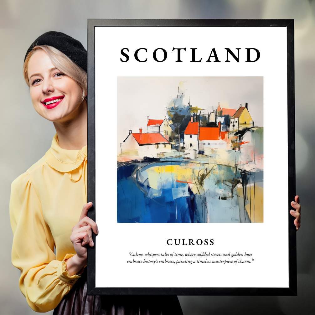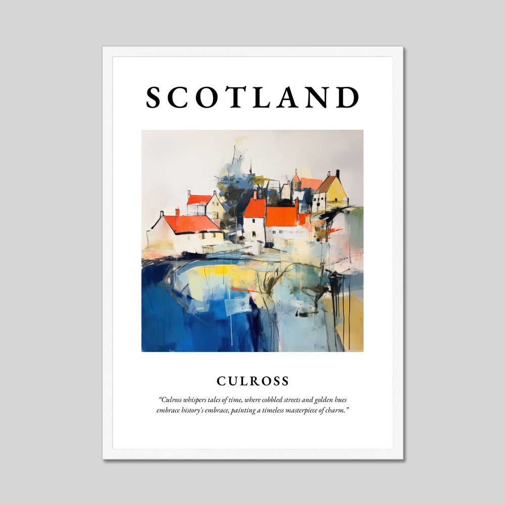 Embrace the essence of Scotland's captivating charm with our enchanting framed poster print, featuring the word “SCOTLAND” in bold splendour. At its heart lies a mesmerising abstract portrayal of Culross, a scenic gem nestled in the heart of Scotland's Fife region. Beneath the painting, in delicate lettering, the quote captures the spirit of this enchanting village: “Culross whispers tales of time, where cobbled streets and golden hues embrace history's embrace, painting a timeless masterpiece of charm.”