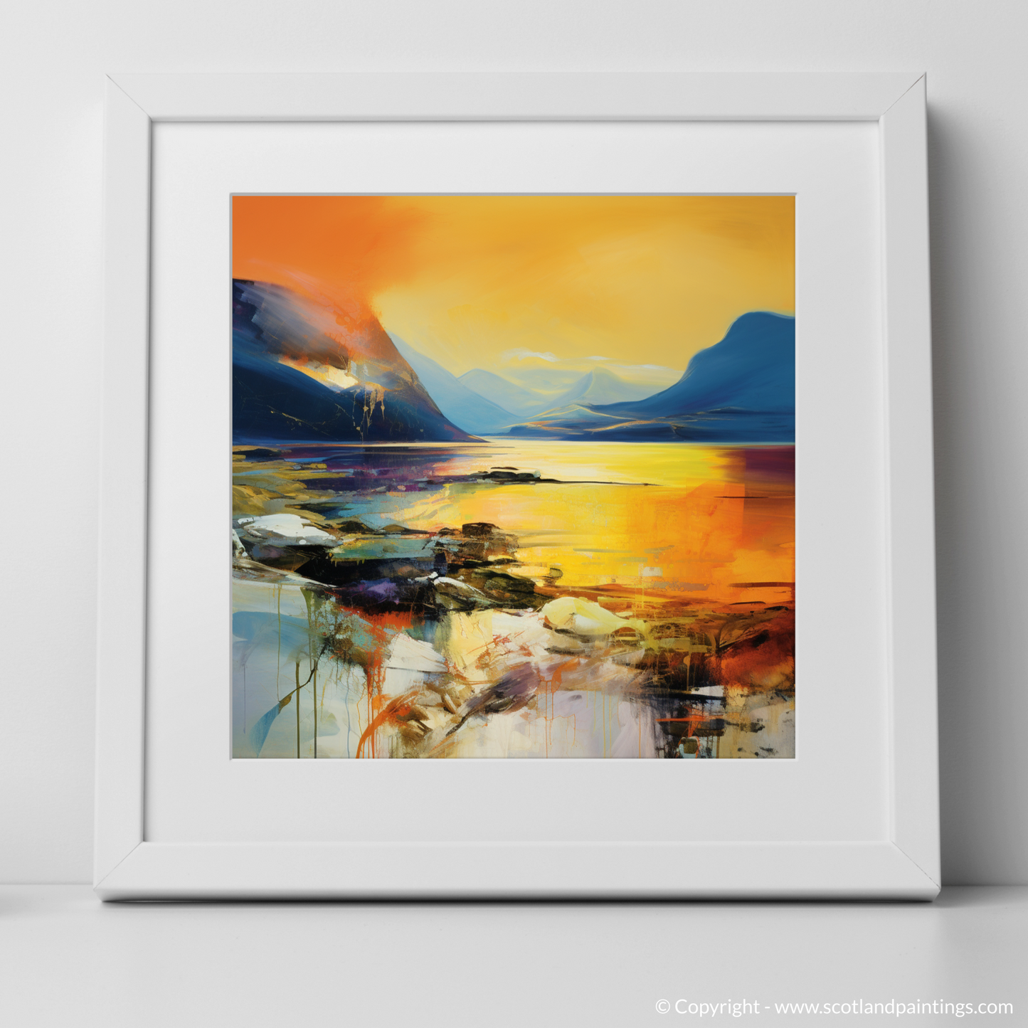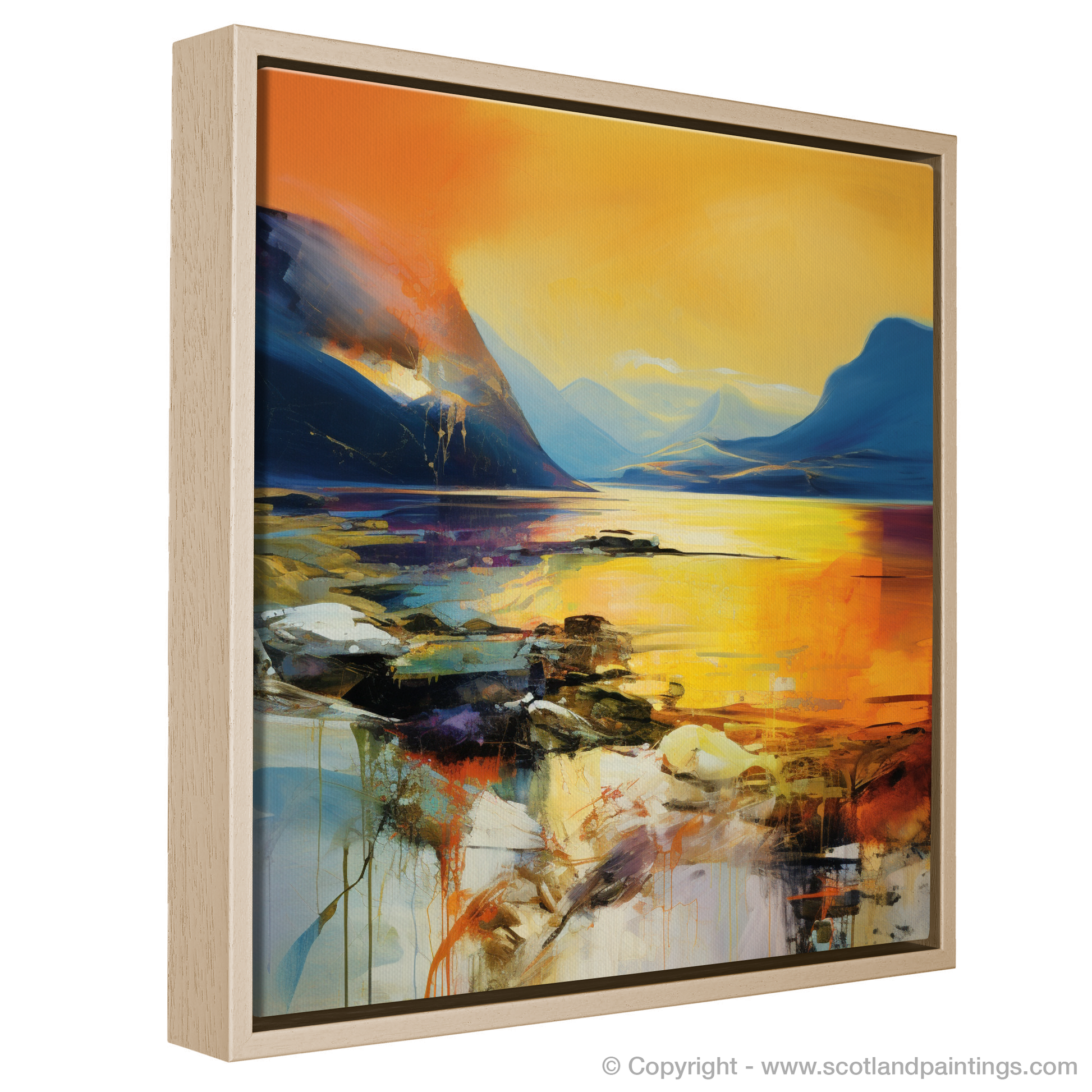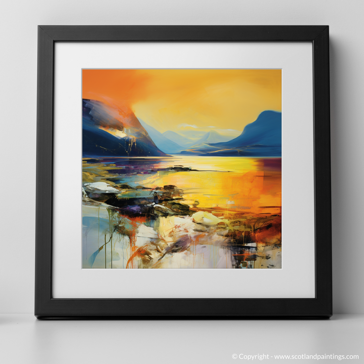 Immerse yourself in the abstract vibrancy of a Scottish cove at the most enchanting time of day. This evocative print captures the dramatic essence of Elgol Bay bathed in the molten glory of the golden hour. Swirls of rich amber, fiery orange, and deep blues dance across the canvas, embraced by the grandeur of shadowy mountain silhouettes that soar into a bleeding sunset.