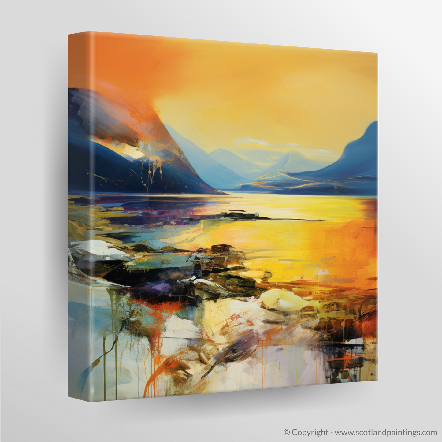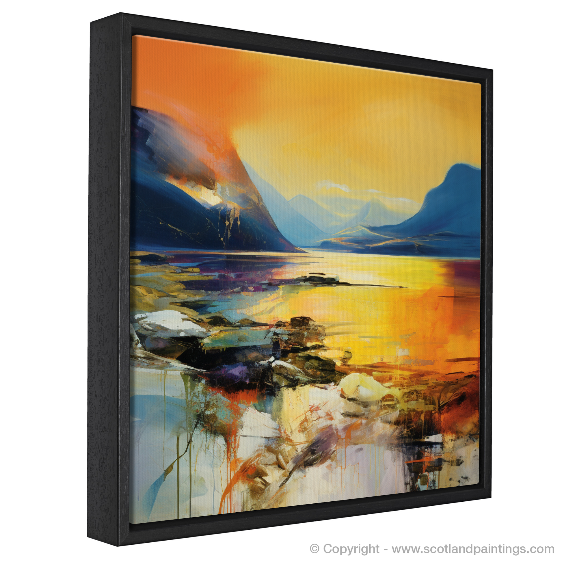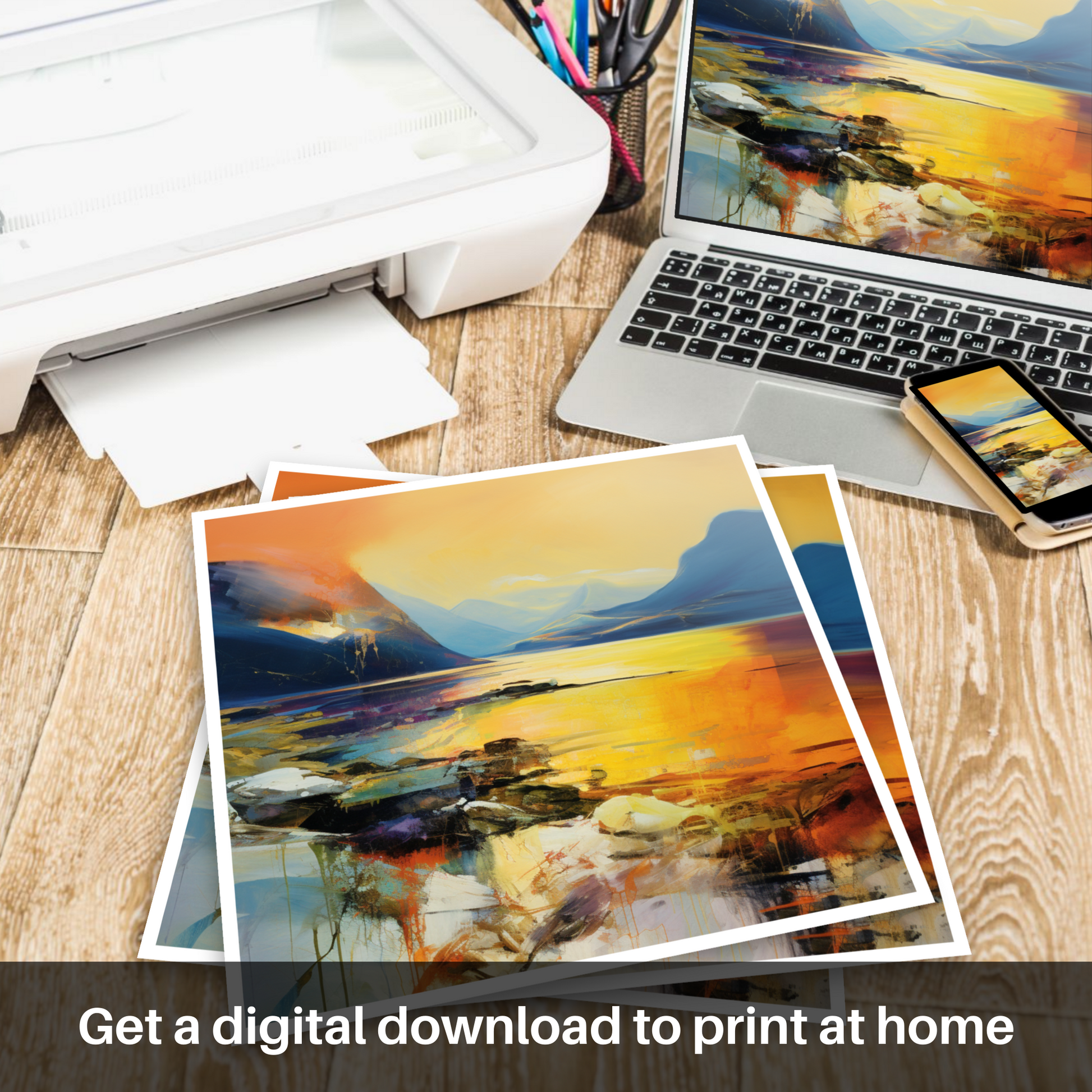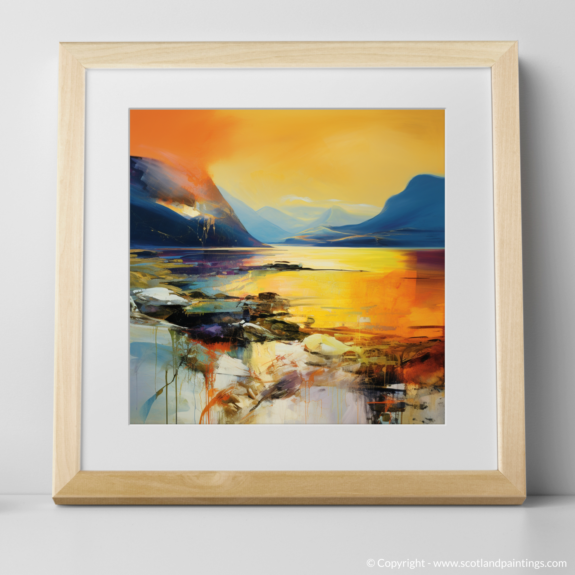 Immerse yourself in the abstract vibrancy of a Scottish cove at the most enchanting time of day. This evocative print captures the dramatic essence of Elgol Bay bathed in the molten glory of the golden hour. Swirls of rich amber, fiery orange, and deep blues dance across the canvas, embraced by the grandeur of shadowy mountain silhouettes that soar into a bleeding sunset.