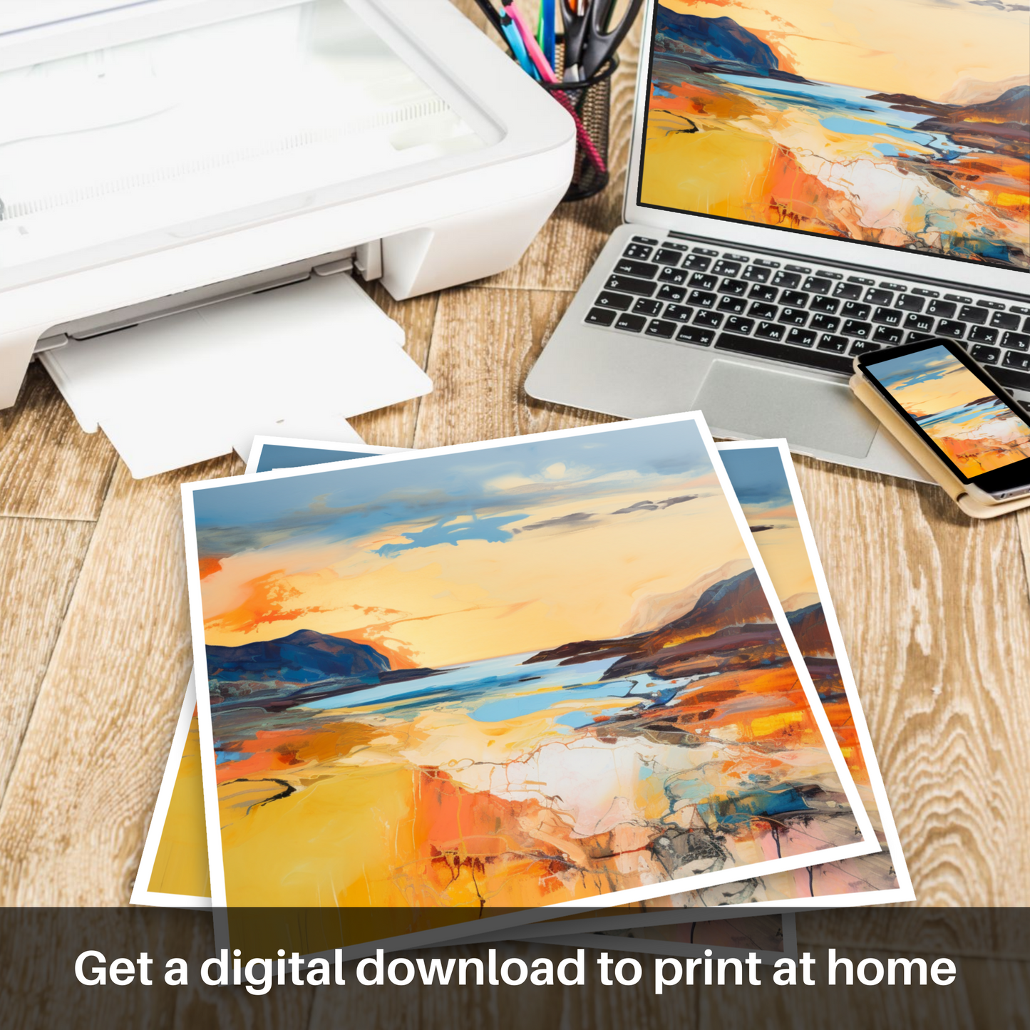 Immerse yourself in the serene splendour of Scotland’s natural beauty with this captivating abstract rendition of Achmelvich Bay at golden hour. The vivid hues of the setting sun bathe the landscape in a warm glow, as fiery oranges and radiant yellows melt seamlessly into the tranquil blues of the sea and sky, conjuring an atmosphere of peaceful reflection.