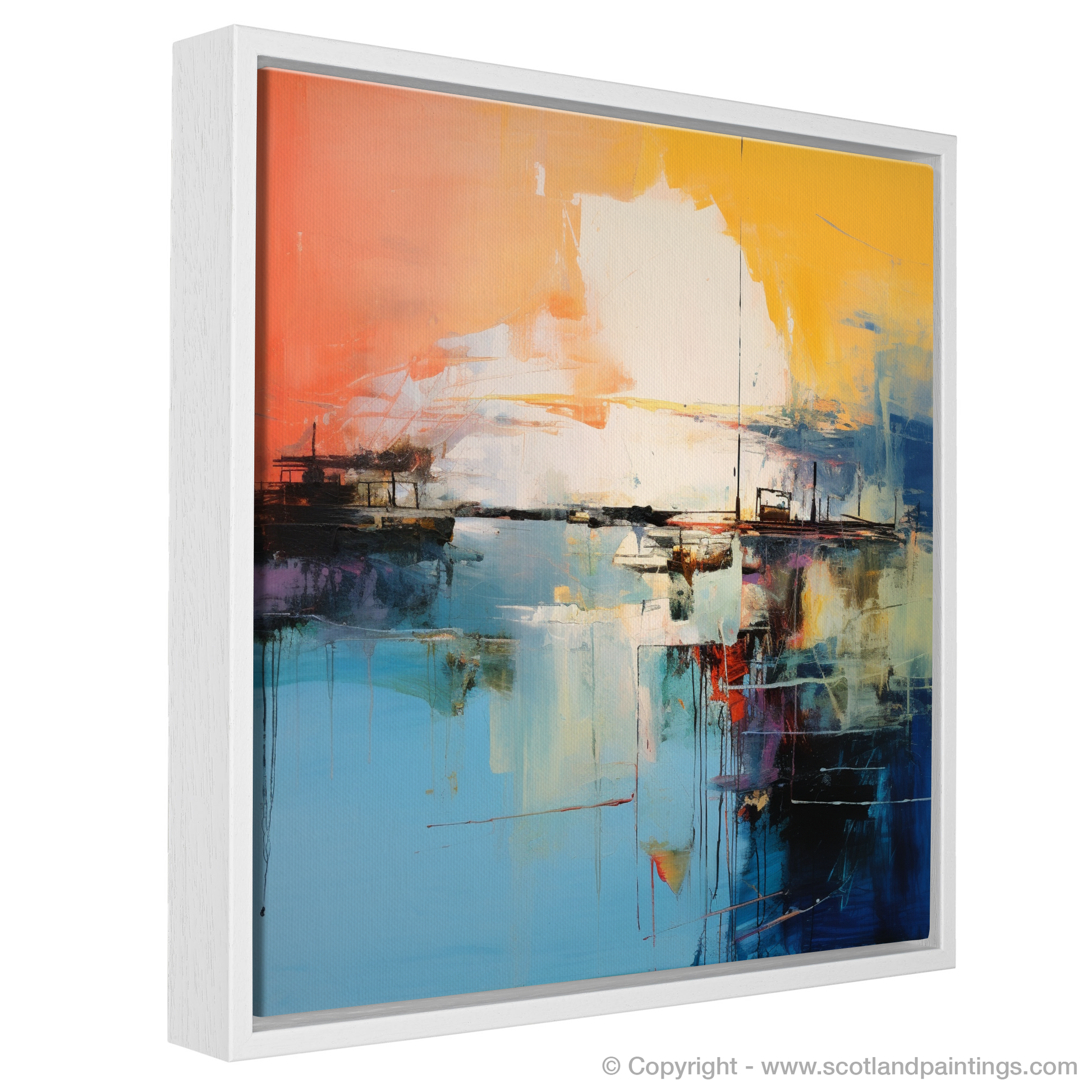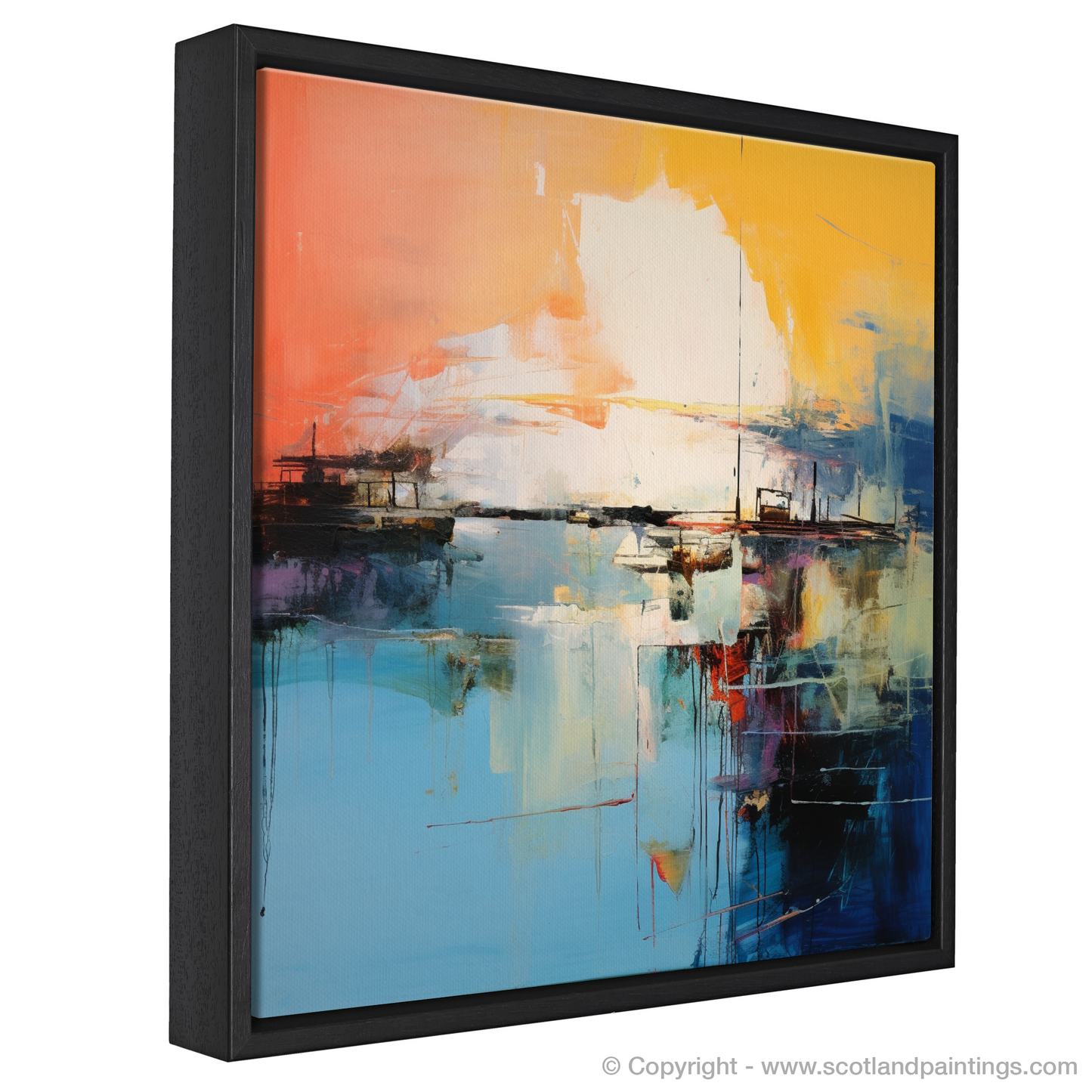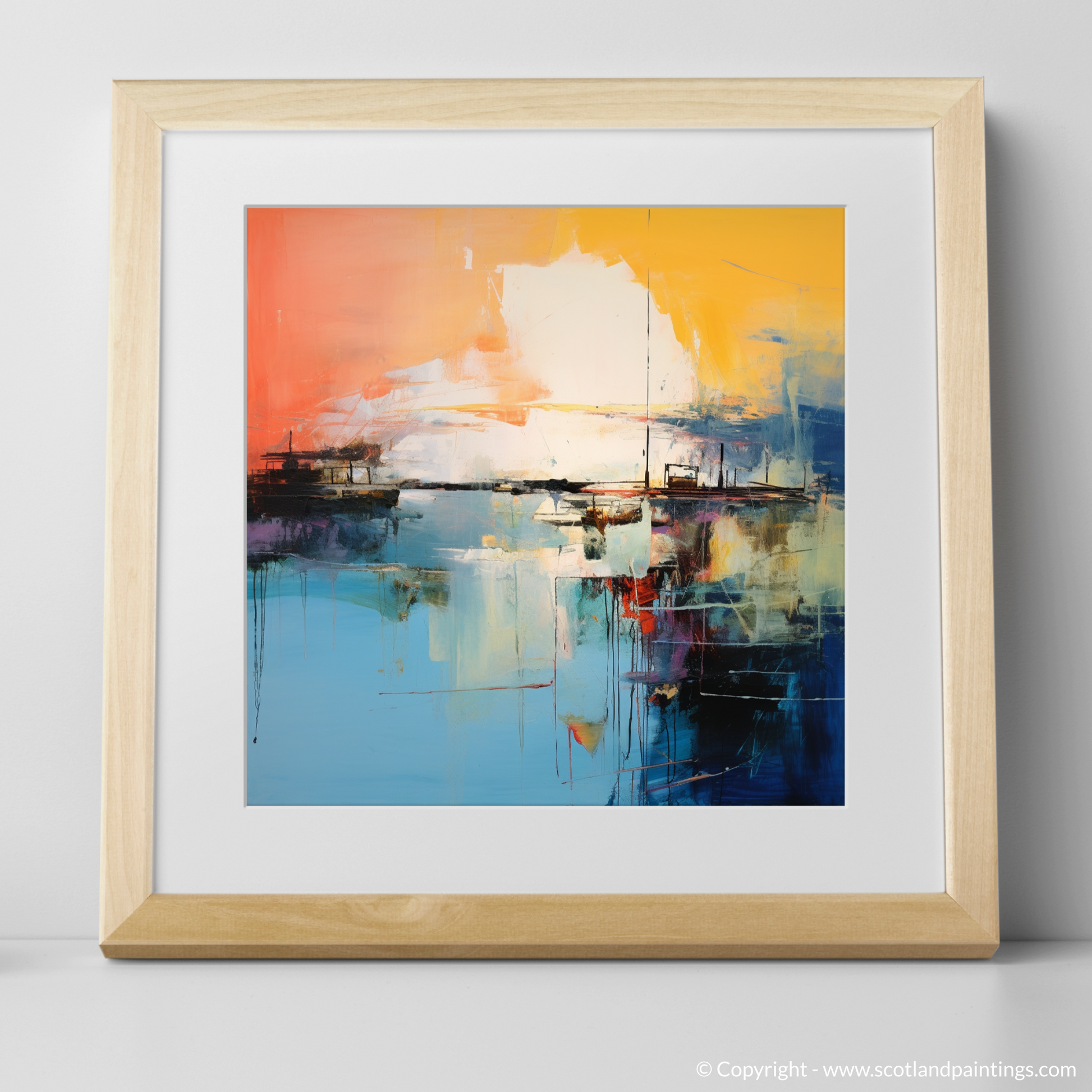 Imbued with the spirit of Cullen Harbour at the close of day, this evocative abstract print captures the enigmatic beauty of a Scottish harbour awash in the glow of sunset. Bold strokes of fiery orange and coral cascade across the canvas, mingling with serene blues and azure, suggestive of both the warmth of the setting sun and the cool tranquillity of the waters below.