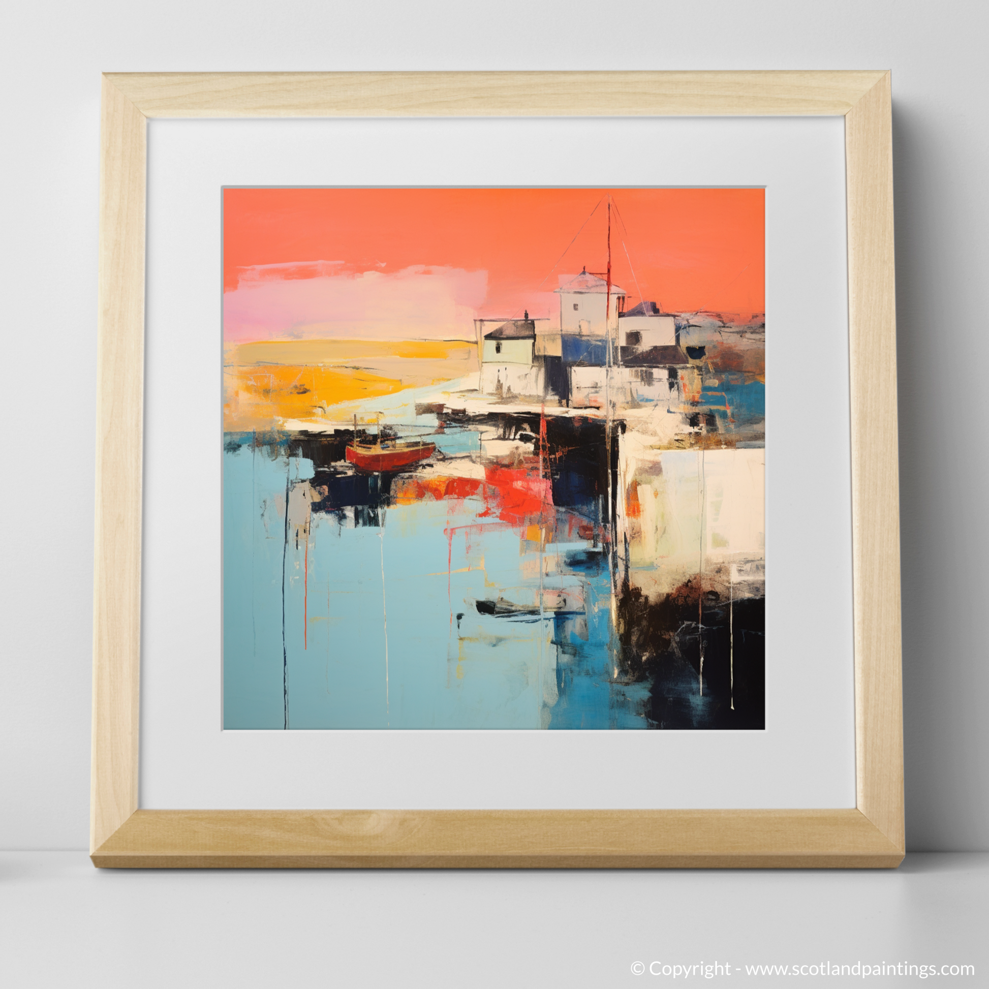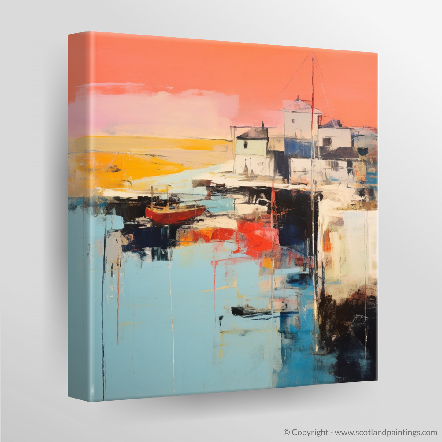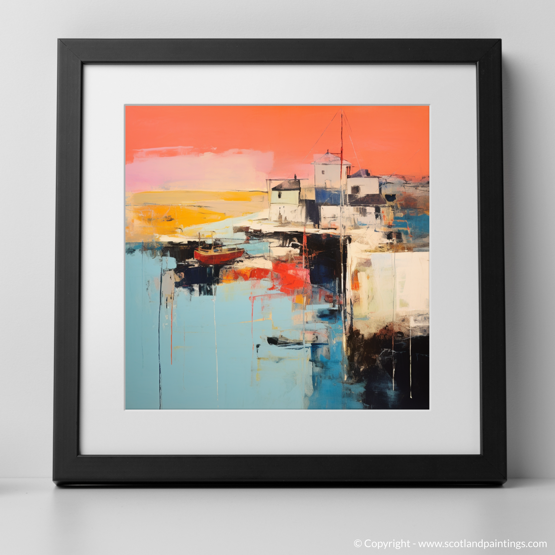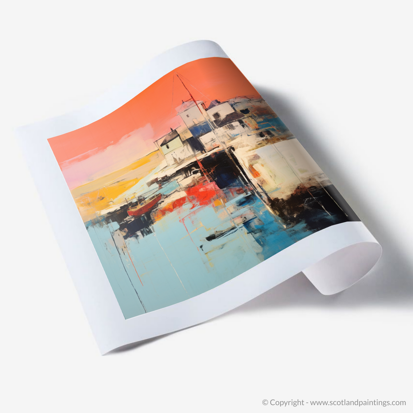 Capturing the ephemeral glow of twilight as it kisses the day's end, this evocative print brings the serene beauty of Cullen Harbour to life through a symphony of abstract splendour. The canvas is awash with a vivacious palette, where the boldness of fiery corals and oranges seamlessly transitions into the subdued whispers of pastel yellows, mirroring a sunset's fleeting dance across the horizon.