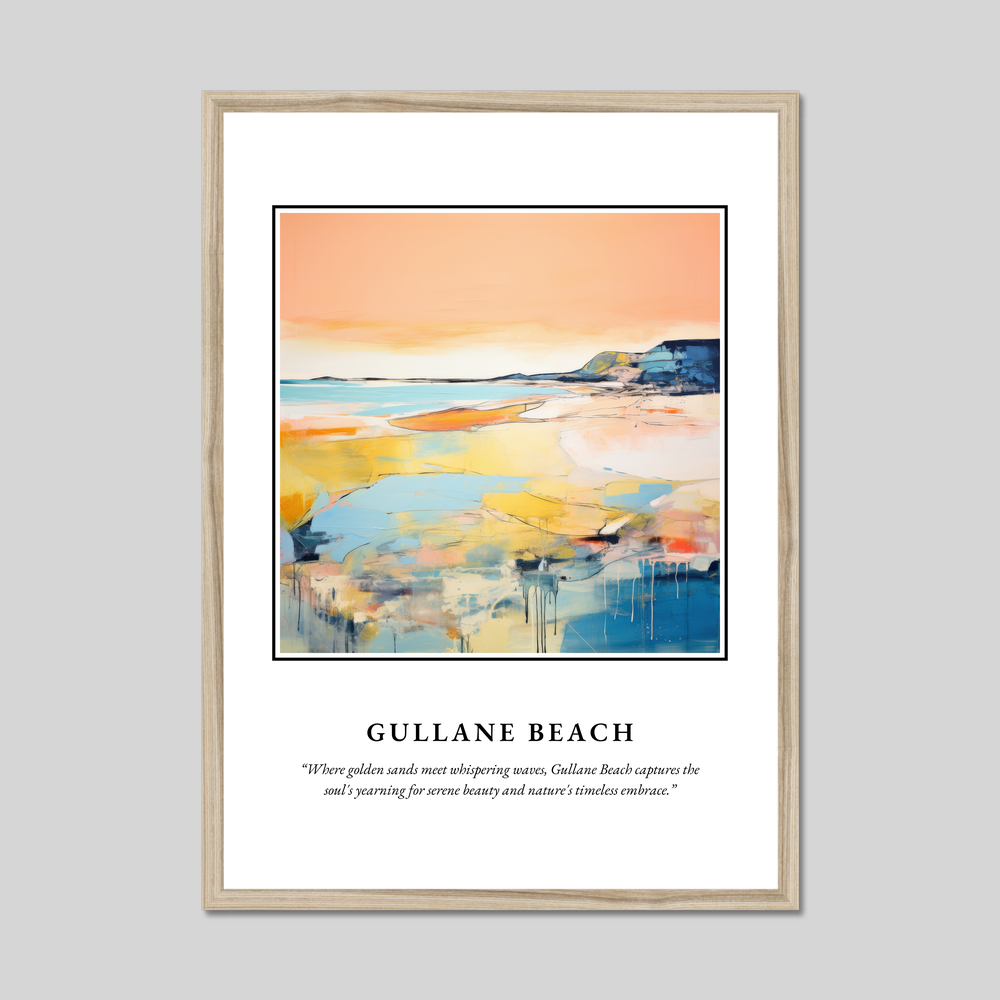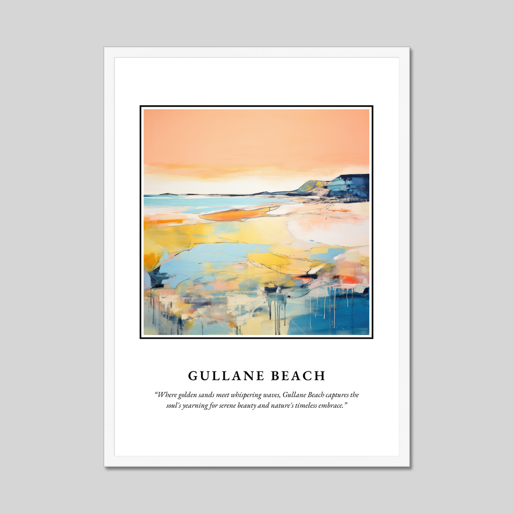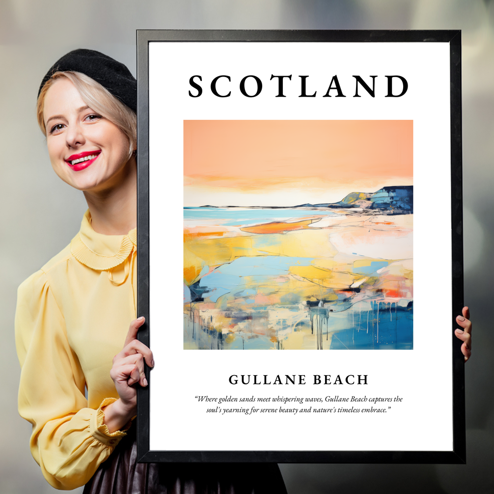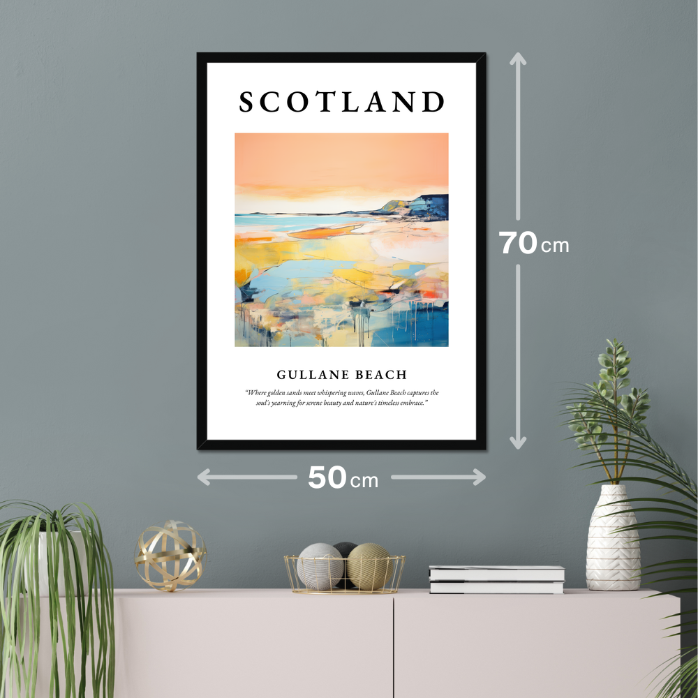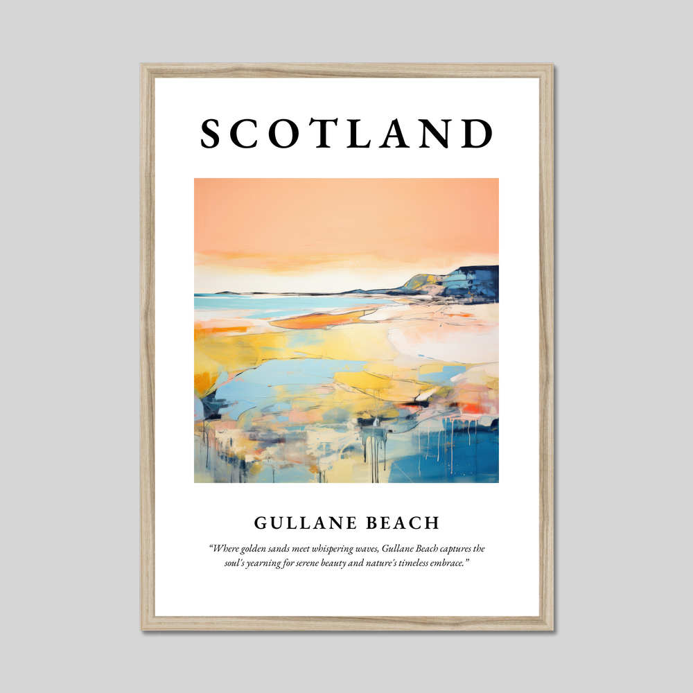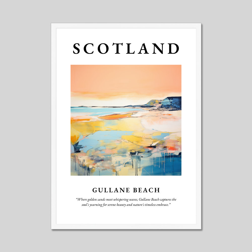 The poster features the word “SCOTLAND” in bold, commanding letters at the top, setting the stage for an evocative piece of abstract art that captures the essence of Gullane Beach. The artwork below portrays the rich tapestry of golden sands meeting the playful whispers of ocean waves, painted in vibrant hues of blue, orange, and yellow. Beneath this mesmerising visual, the quote “Where golden sands meet whispering waves, Gullane Beach captures the soul's yearning for serene beauty and nature's timeless embrace” serves as a gentle reminder of the tranquility and timeless allure of this serene landscape.