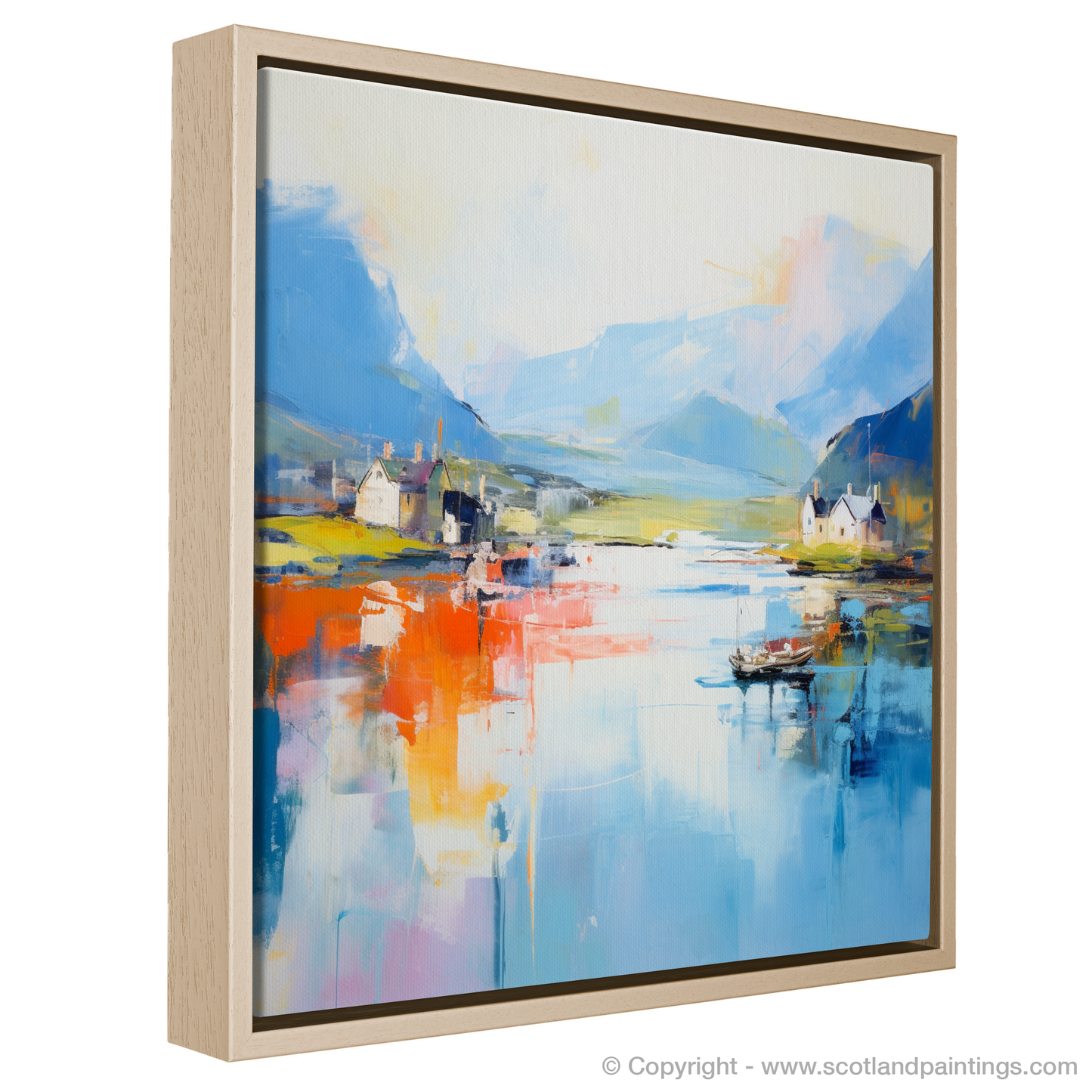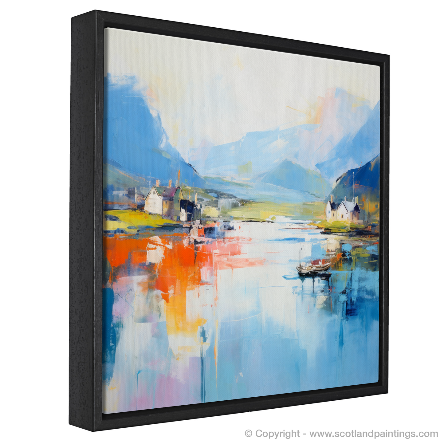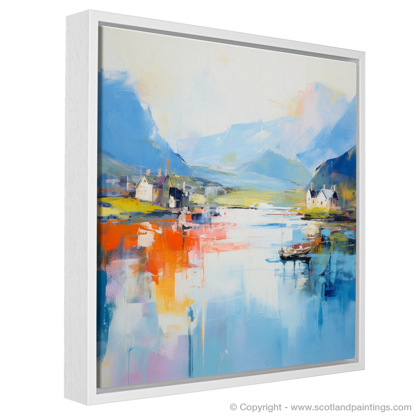 Capturing the essence of Craobh Haven Harbour with a vibrant tapestry of colours, this abstract print transports viewers to the serene shores of Argyll. The interplay of bold orange and passionate red hues reflects off the tranquil blues of the waters below, while the brushstrokes dance between reality and imagination.