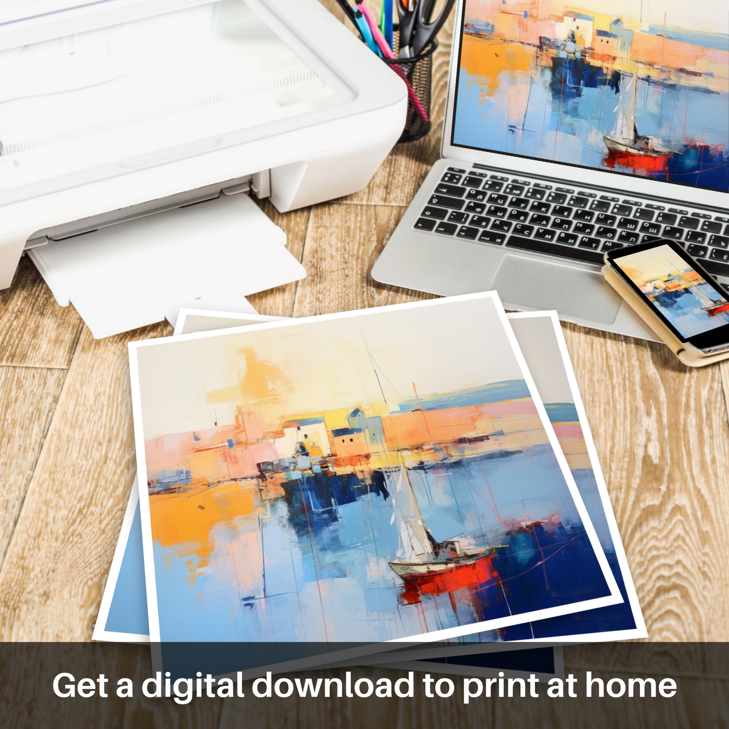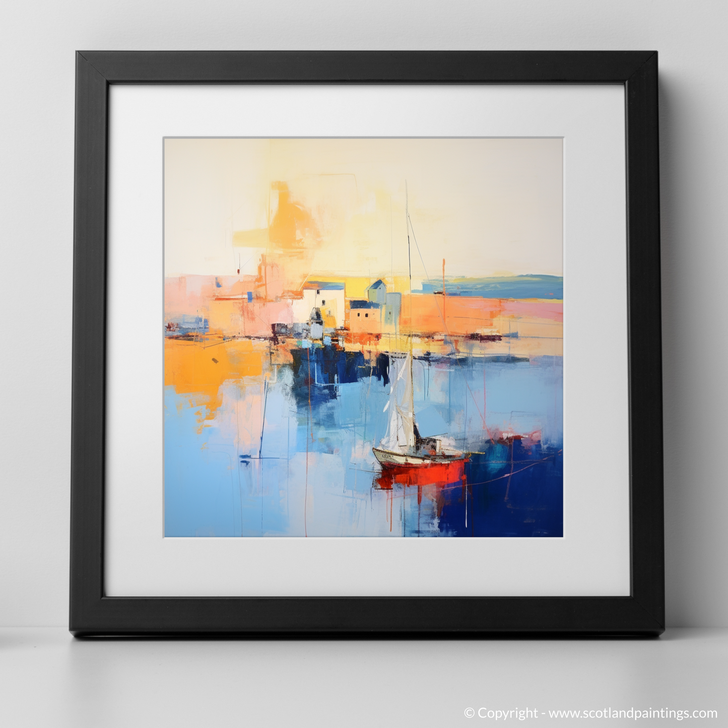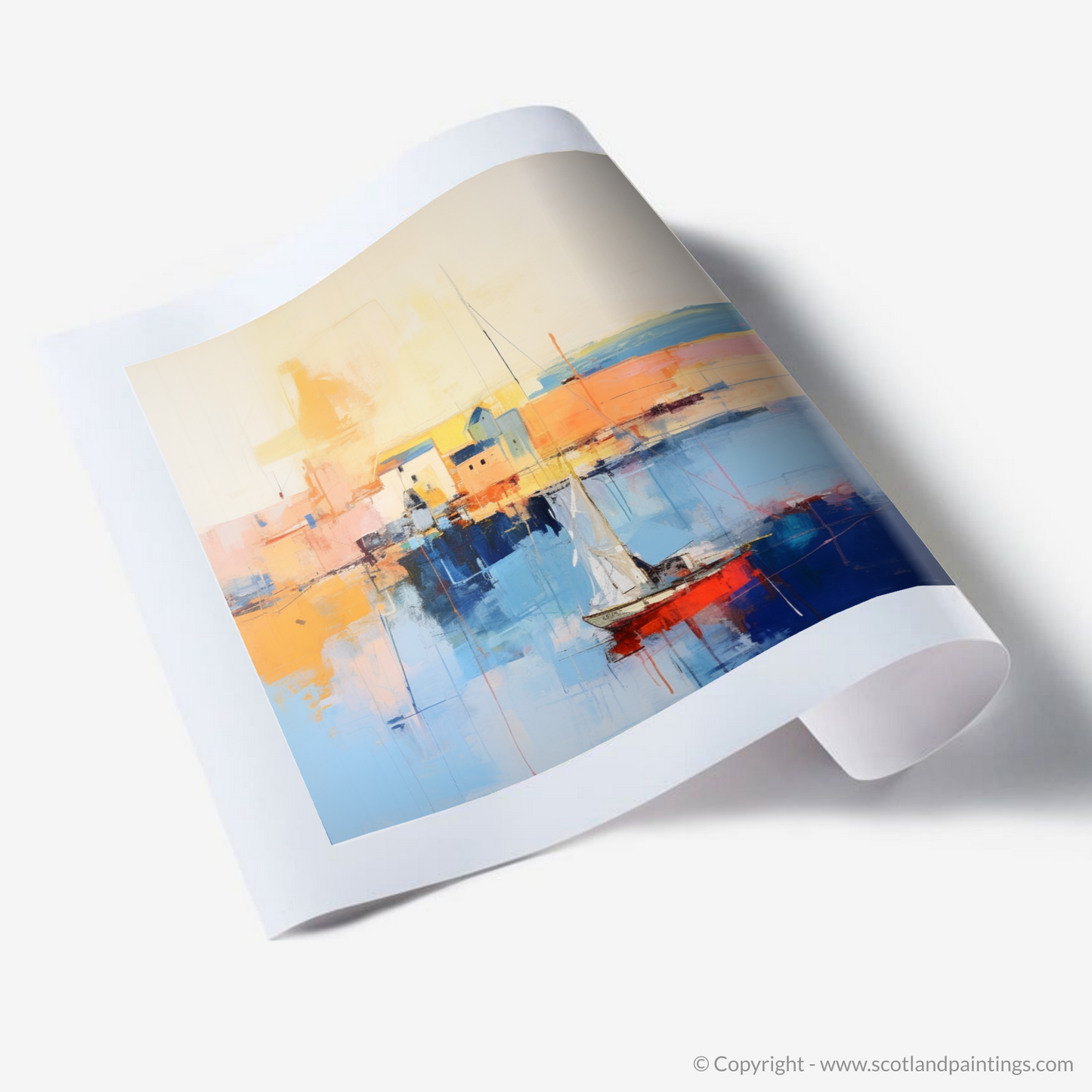 Capturing the ephemeral beauty of Port Ellen Harbour bathed in the enchanting glow of golden hour, this abstract print presents a mesmerizing play of colour and light. Vivid strokes of blues and oranges dance across the canvas, reflecting the tranquil waters and silhouetting the harbour structures with a dreamlike quality. The harbour, a serene stage for the elegantly poised sailboat, comes to life amidst a symphony of warm and cool hues that mirror the fleeting perfection of dusk.