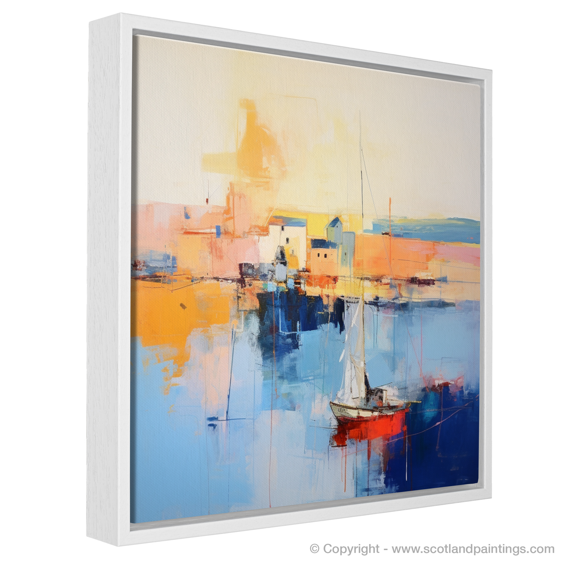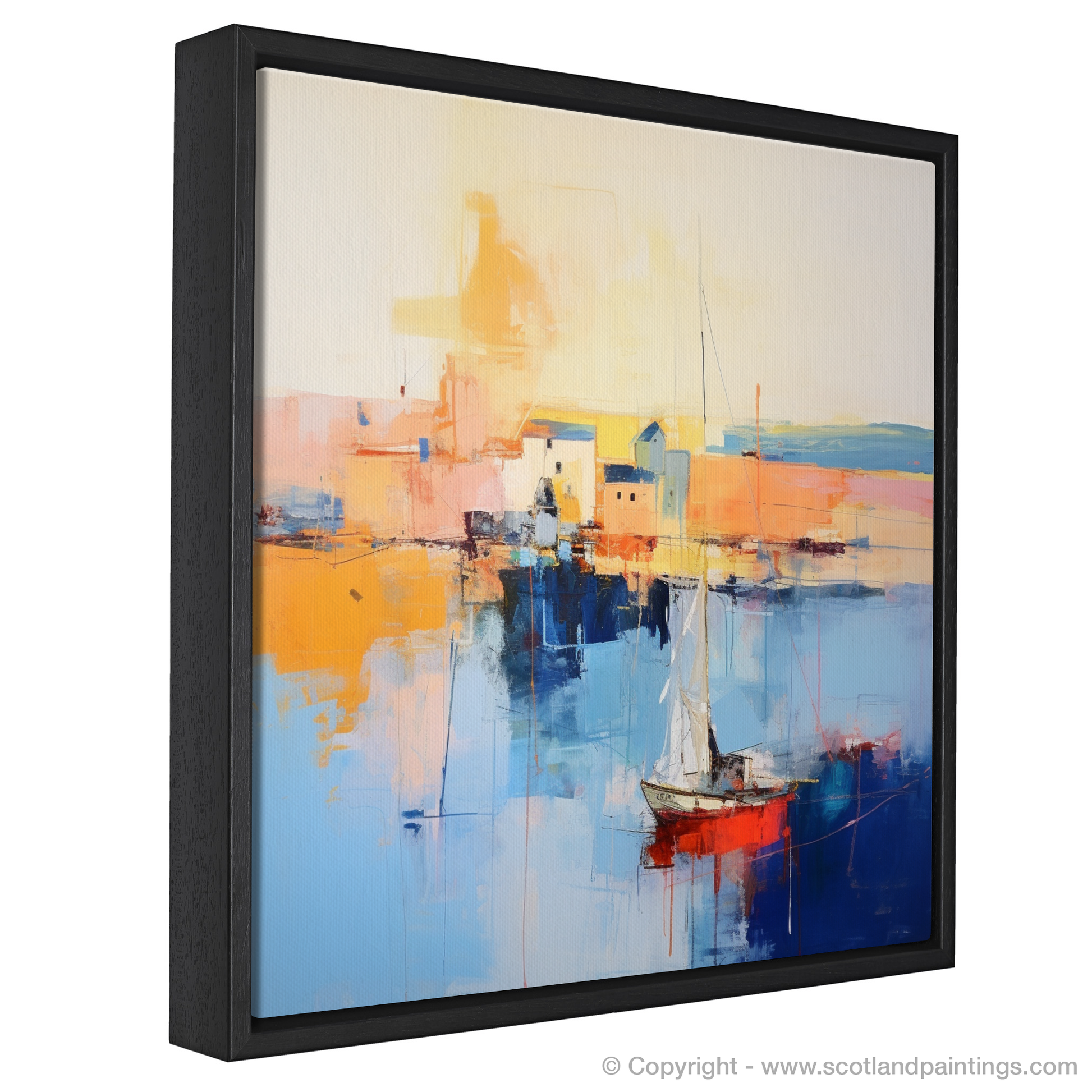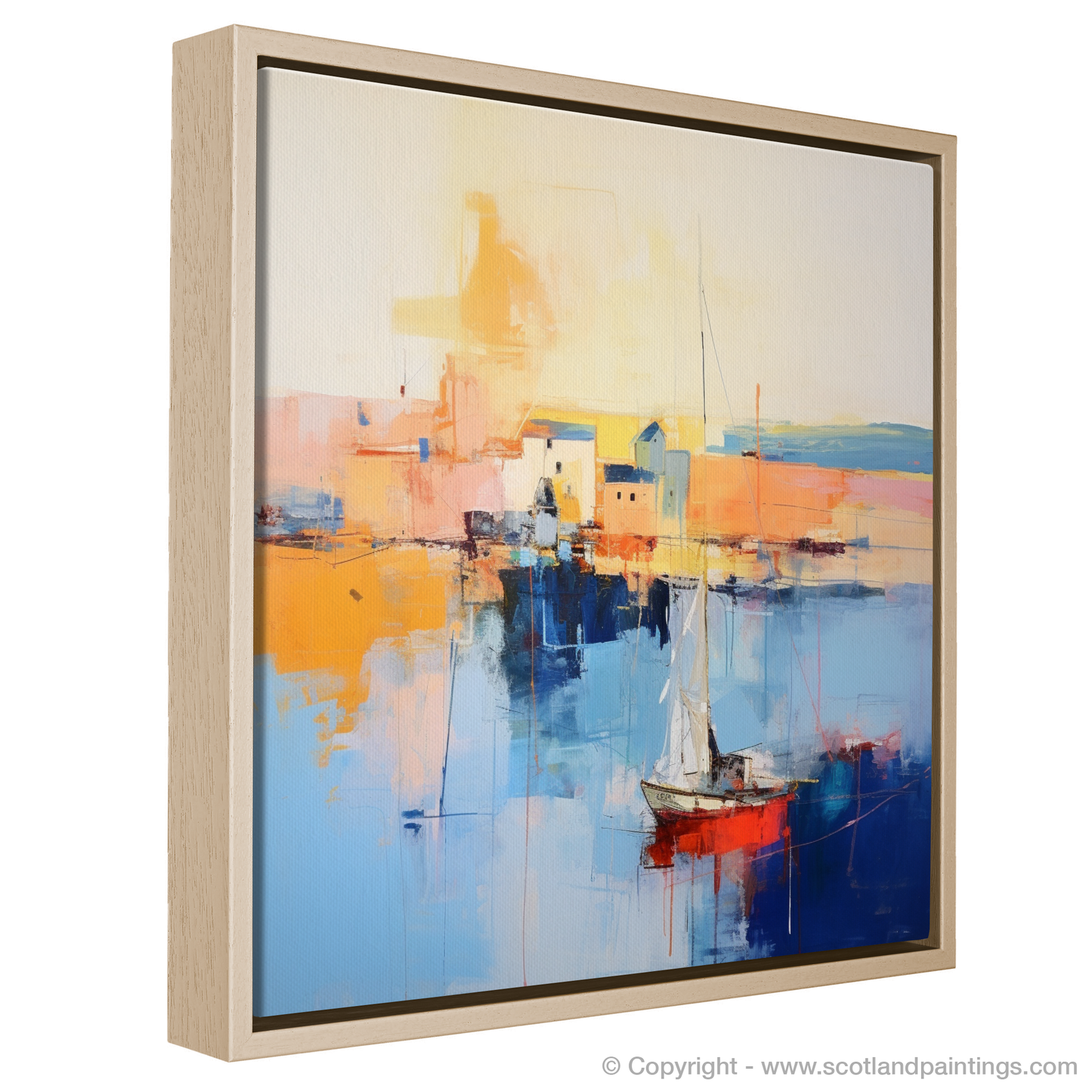 Capturing the ephemeral beauty of Port Ellen Harbour bathed in the enchanting glow of golden hour, this abstract print presents a mesmerizing play of colour and light. Vivid strokes of blues and oranges dance across the canvas, reflecting the tranquil waters and silhouetting the harbour structures with a dreamlike quality. The harbour, a serene stage for the elegantly poised sailboat, comes to life amidst a symphony of warm and cool hues that mirror the fleeting perfection of dusk.
