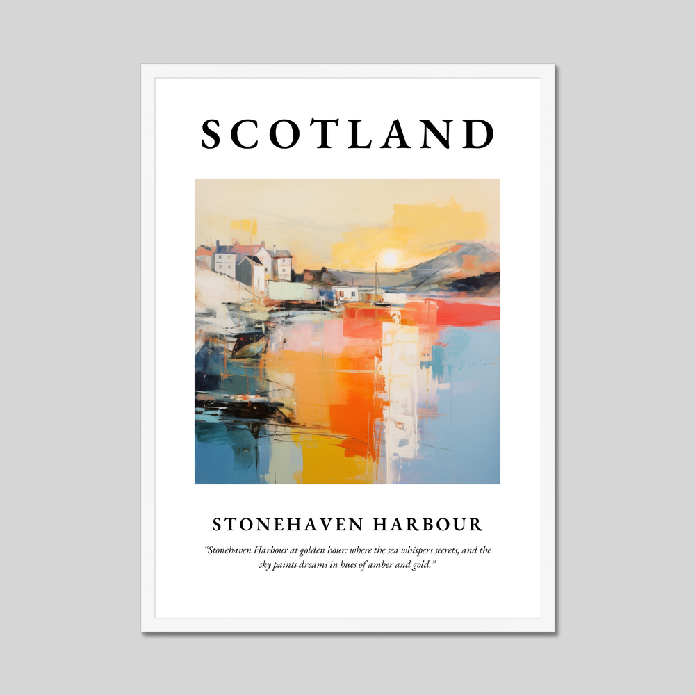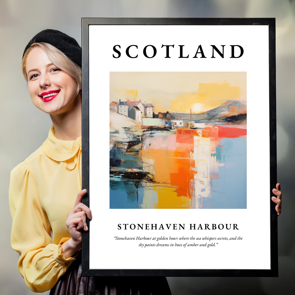 At the top, the word “SCOTLAND” stands bold and proud, inviting you into a mesmerising scene where Stonehaven Harbour comes alive in a dance of colours and textures. Deep hues of amber and gold wash over the canvas, depicting the golden hour with a serene vibrancy that feels almost dreamlike. Beneath the painting, the words “Stonehaven Harbour at golden hour: where the sea whispers secrets, and the sky paints dreams in hues of amber and gold” beckon you closer, hinting at the magic of this mystical location.