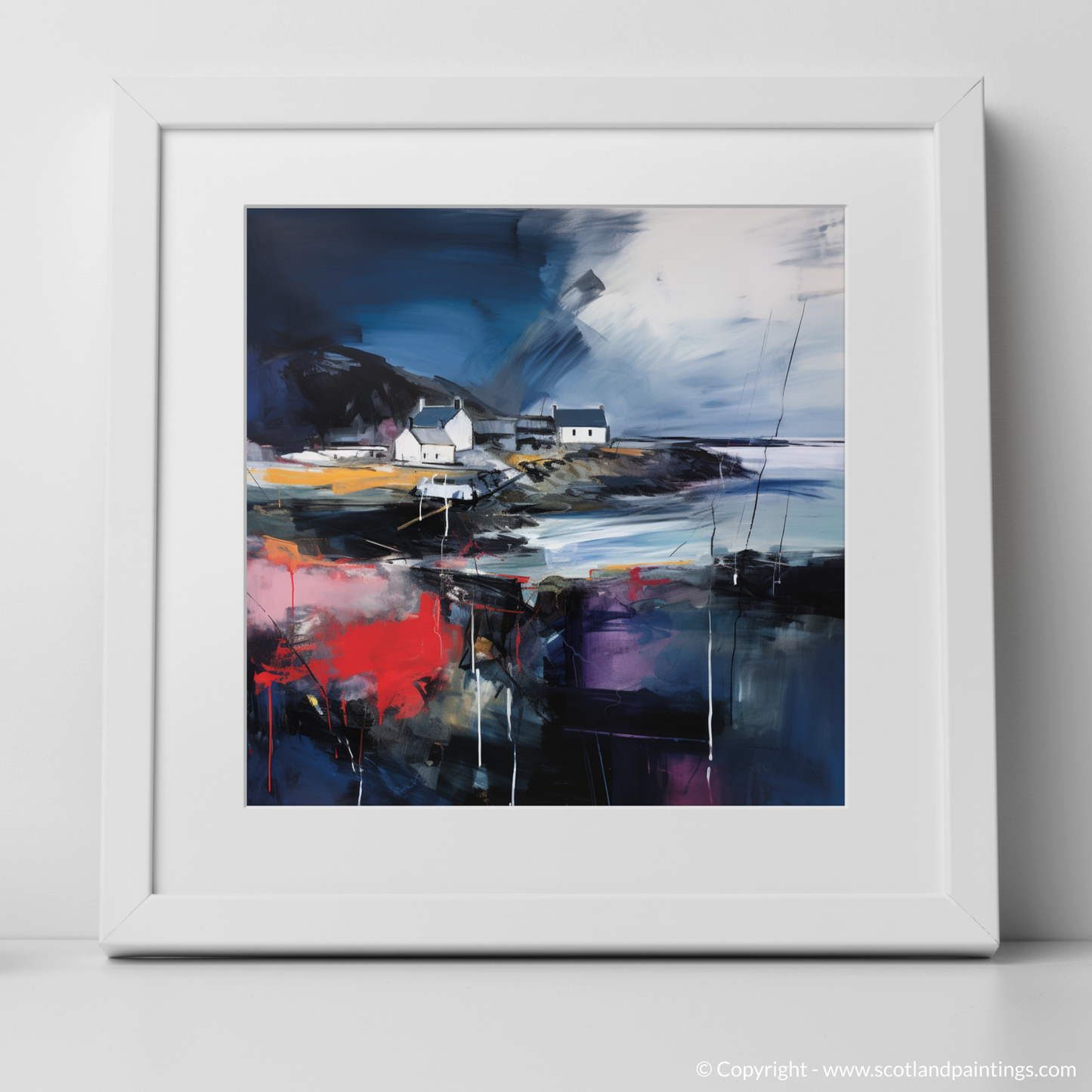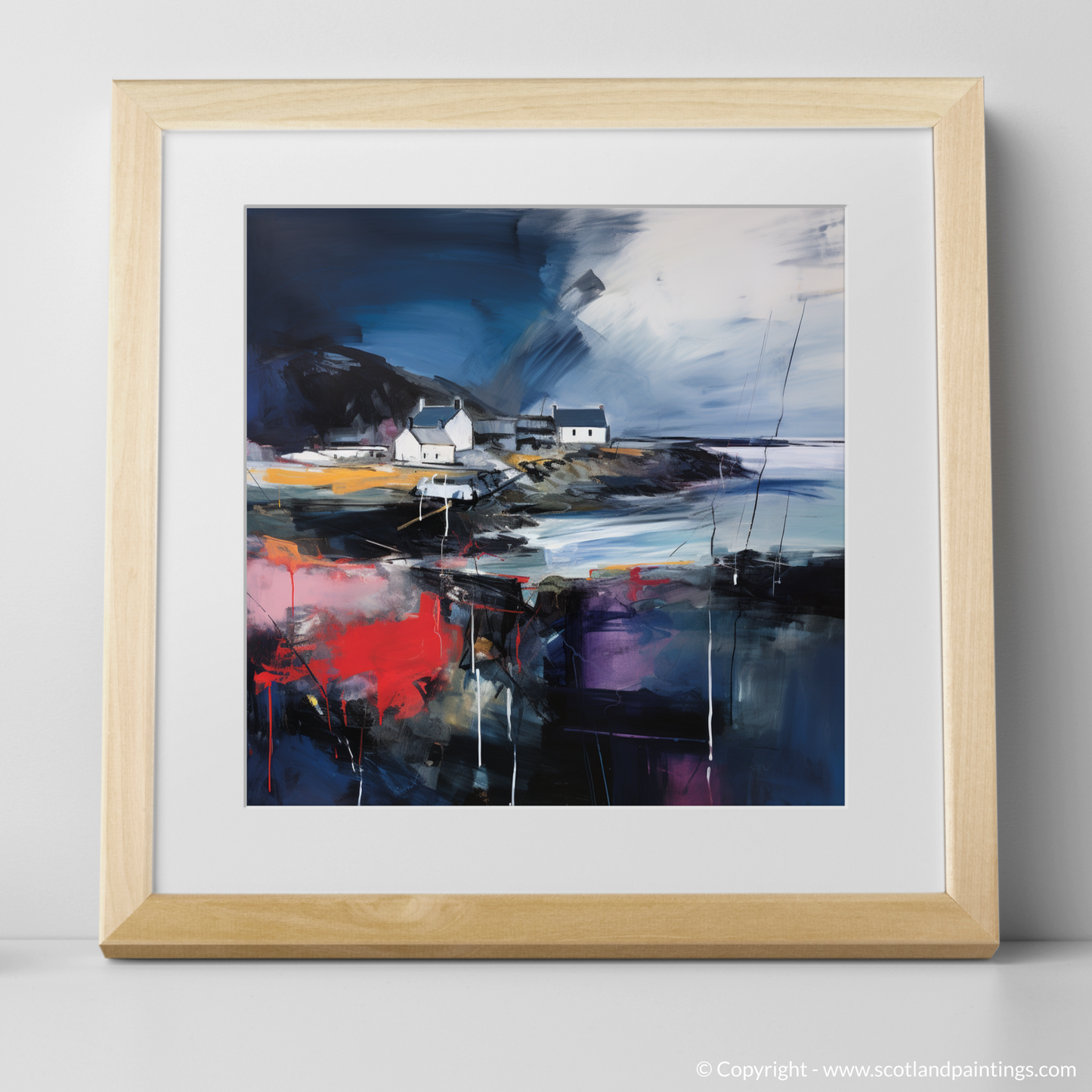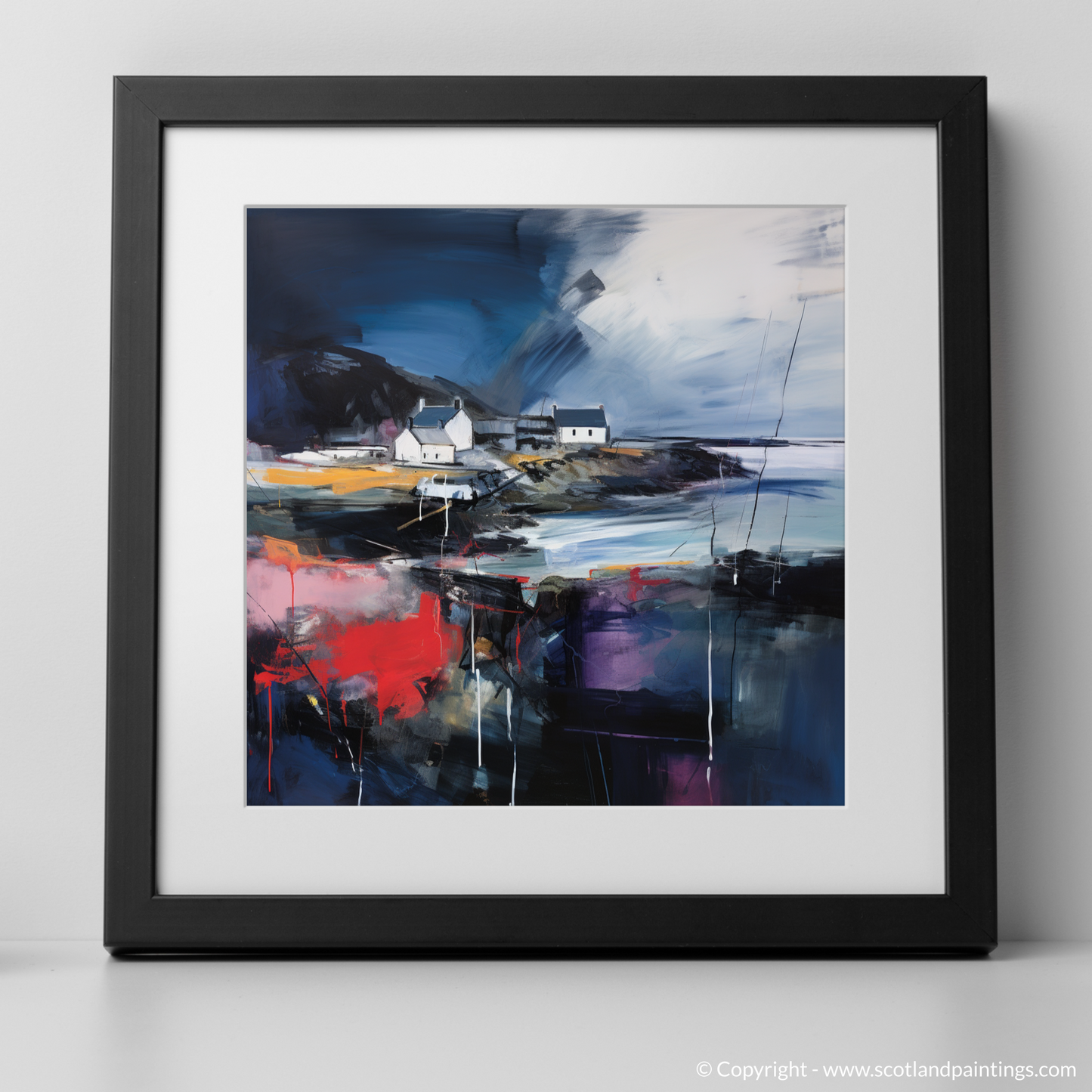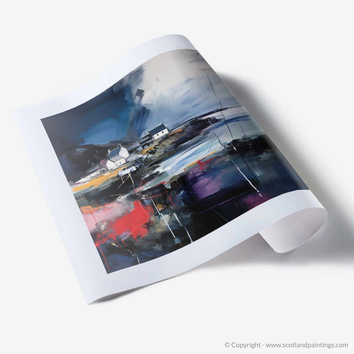 This print is an homage to Scotland’s maritime heritage, reimagined through the lens of abstract artistry. The vivacious colours splash across the canvas, creating an almost palpable energy that brings to life the chaotic beauty of nature's wrath. Enigmatic and deep, the dark hues convey the depth of the ocean during a storm, while the play of light against the cottages hints at the transient calm between the gusts.