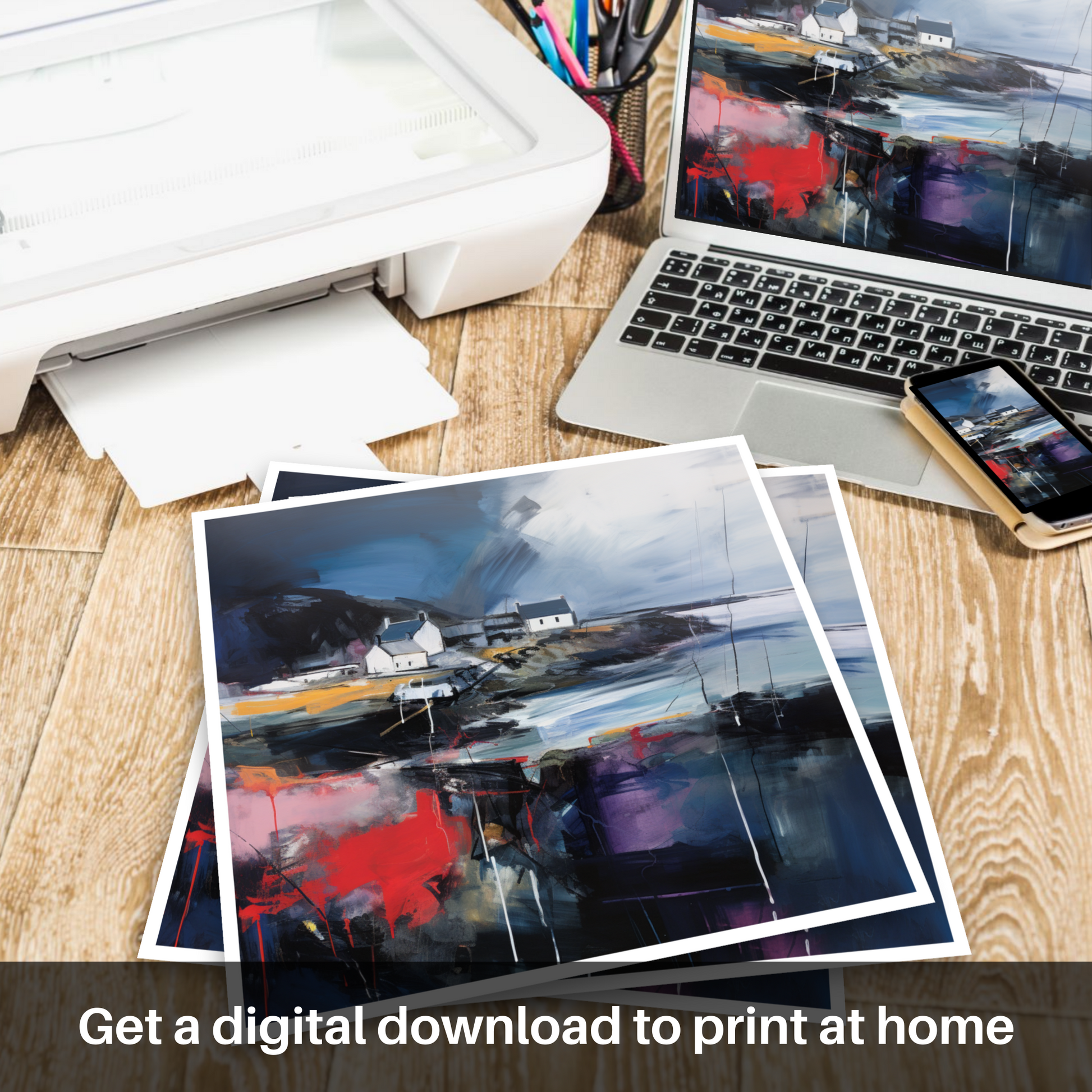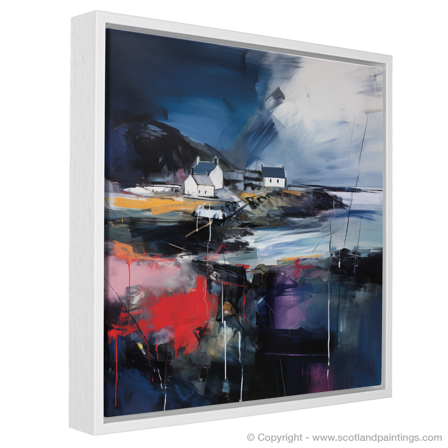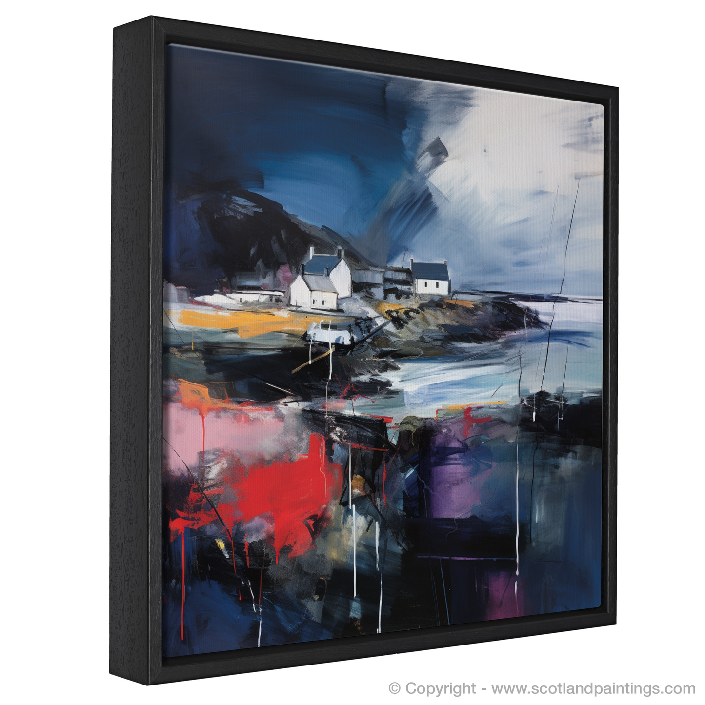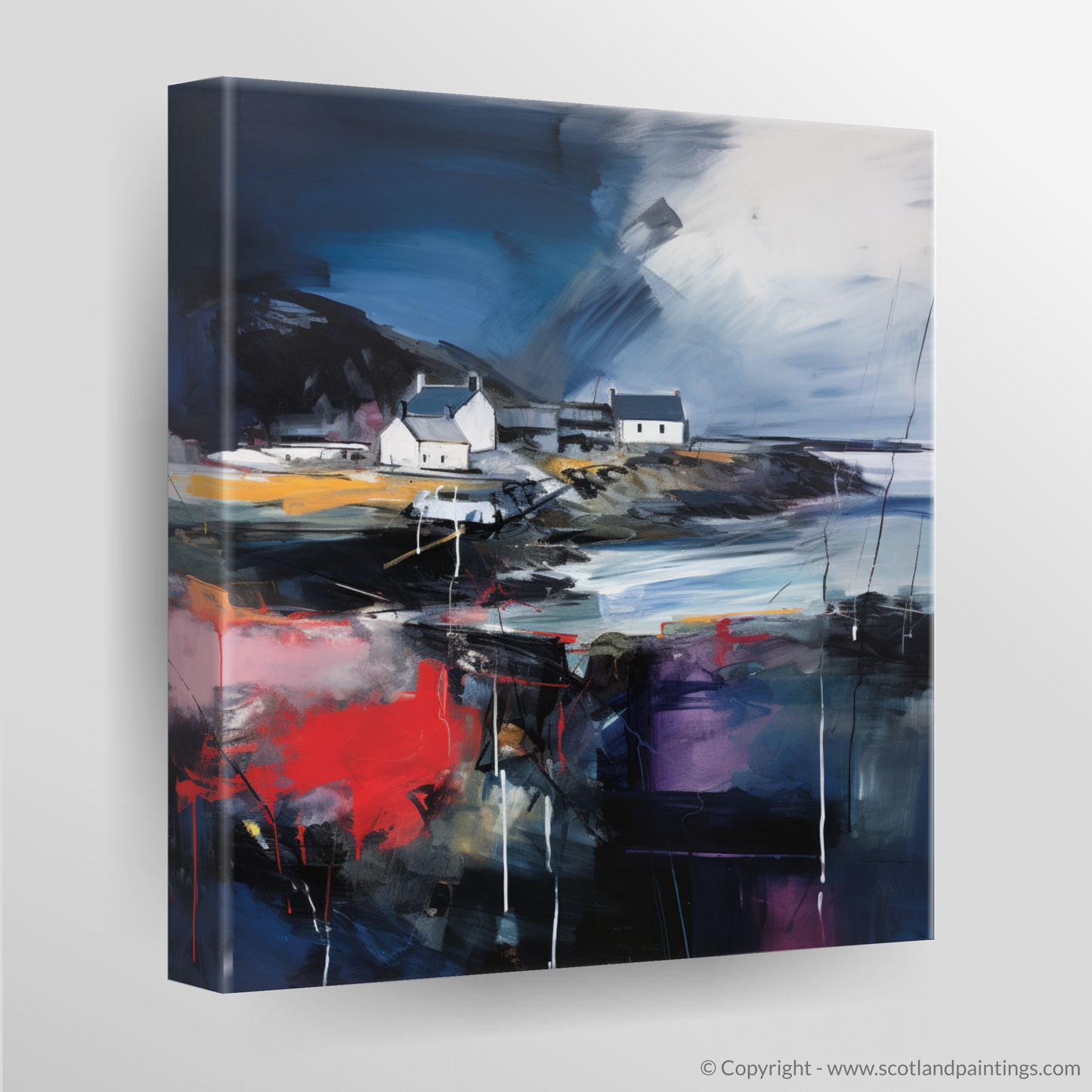 This print is an homage to Scotland’s maritime heritage, reimagined through the lens of abstract artistry. The vivacious colours splash across the canvas, creating an almost palpable energy that brings to life the chaotic beauty of nature's wrath. Enigmatic and deep, the dark hues convey the depth of the ocean during a storm, while the play of light against the cottages hints at the transient calm between the gusts.