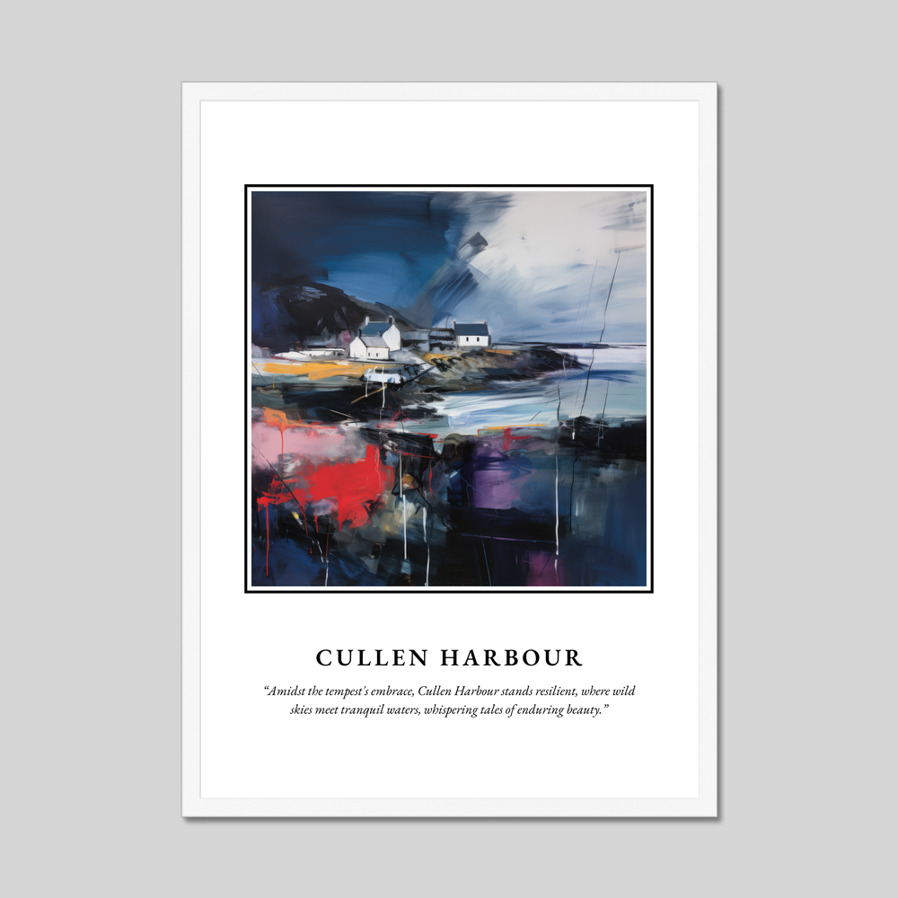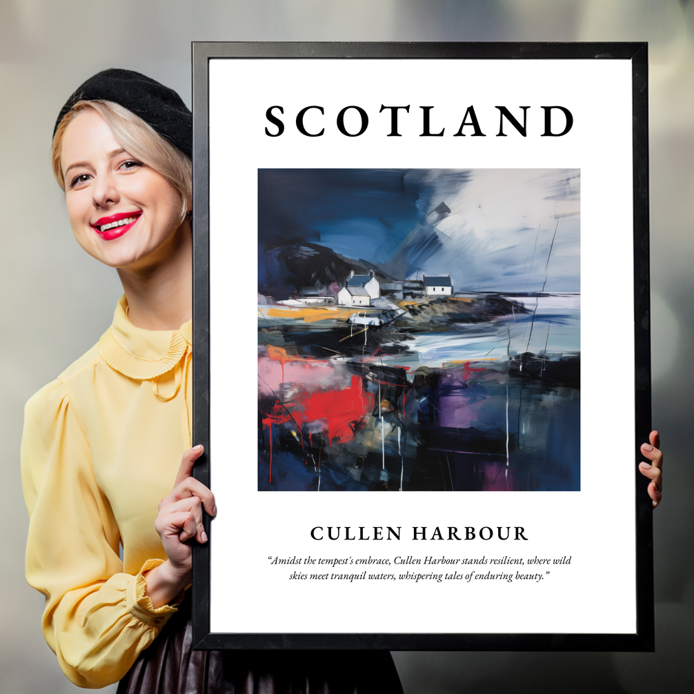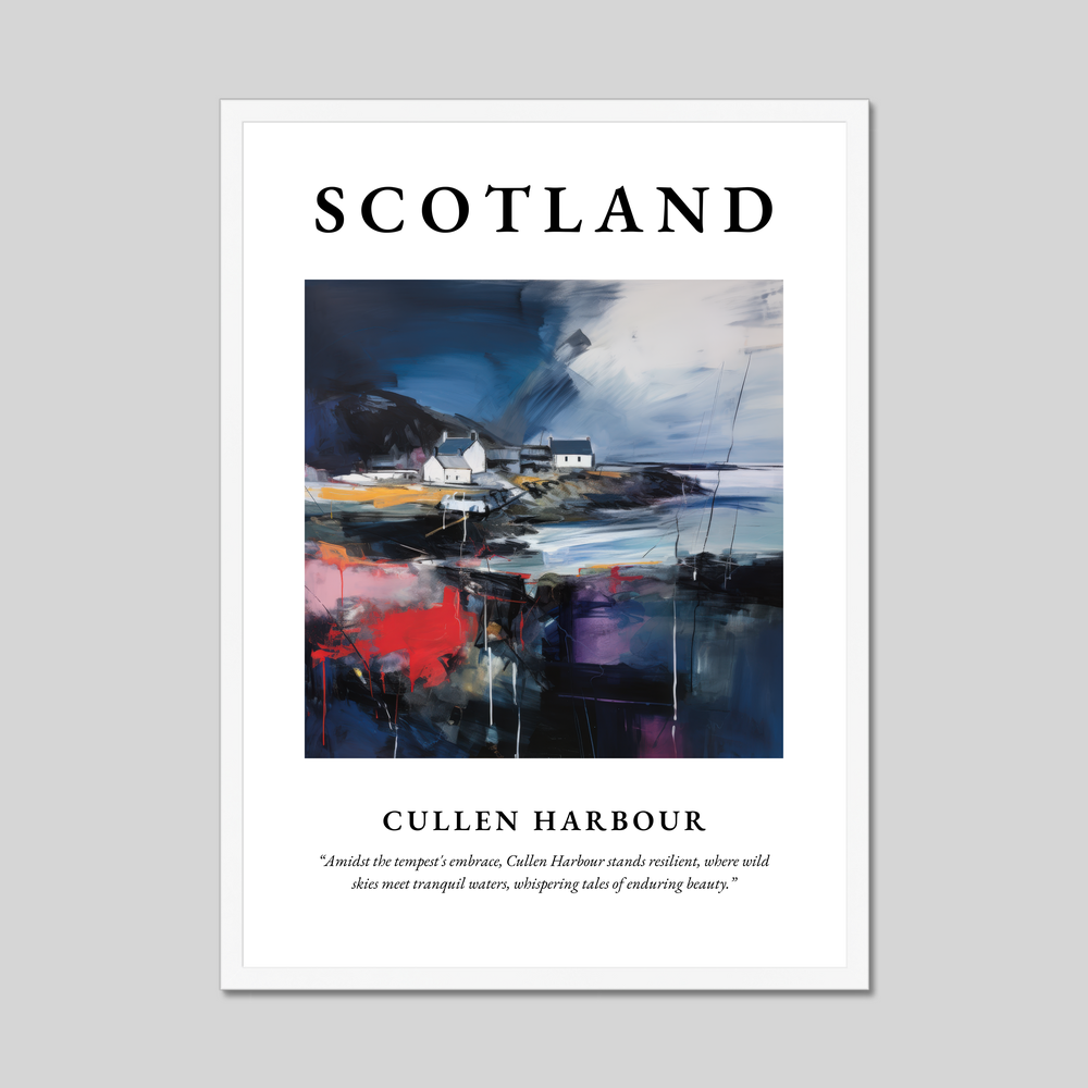 Boldly displayed at the top, the word “SCOTLAND” commands attention, inviting you to dive into the stunning portrayal of Cullen Harbour below. The abstract composition beautifully encapsulates the dynamic interplay of nature's elements. Rich, deep blues and energetic strokes of red and violet capture the tempestuous sky and the vibrant Scottish landscape, while softer hues whisper of the tranquil waters meeting the harbour’s steadfast structures. This piece is more than just a visual delight; it tells a story of balance between chaos and calm—a testament to the region's rugged beauty and resilience.