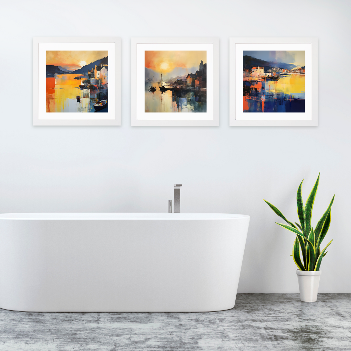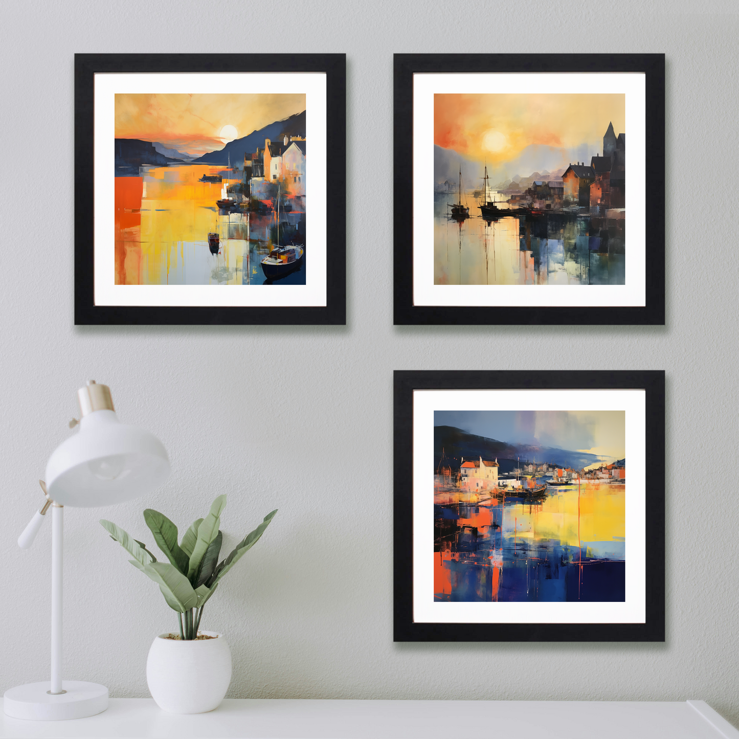 Transform your living space with the stunning set of three framed prints from our Scottish Harbours collection, available at ScotlandPaintings.com. Capturing the serene beauty of Oban Harbour at golden hour, this collection radiates warmth and elegance. Each print encapsulates the tranquil transition of day to night, where vibrant hues of orange, pink, and deep blue blend seamlessly across calm waters and historic harbourside architecture.