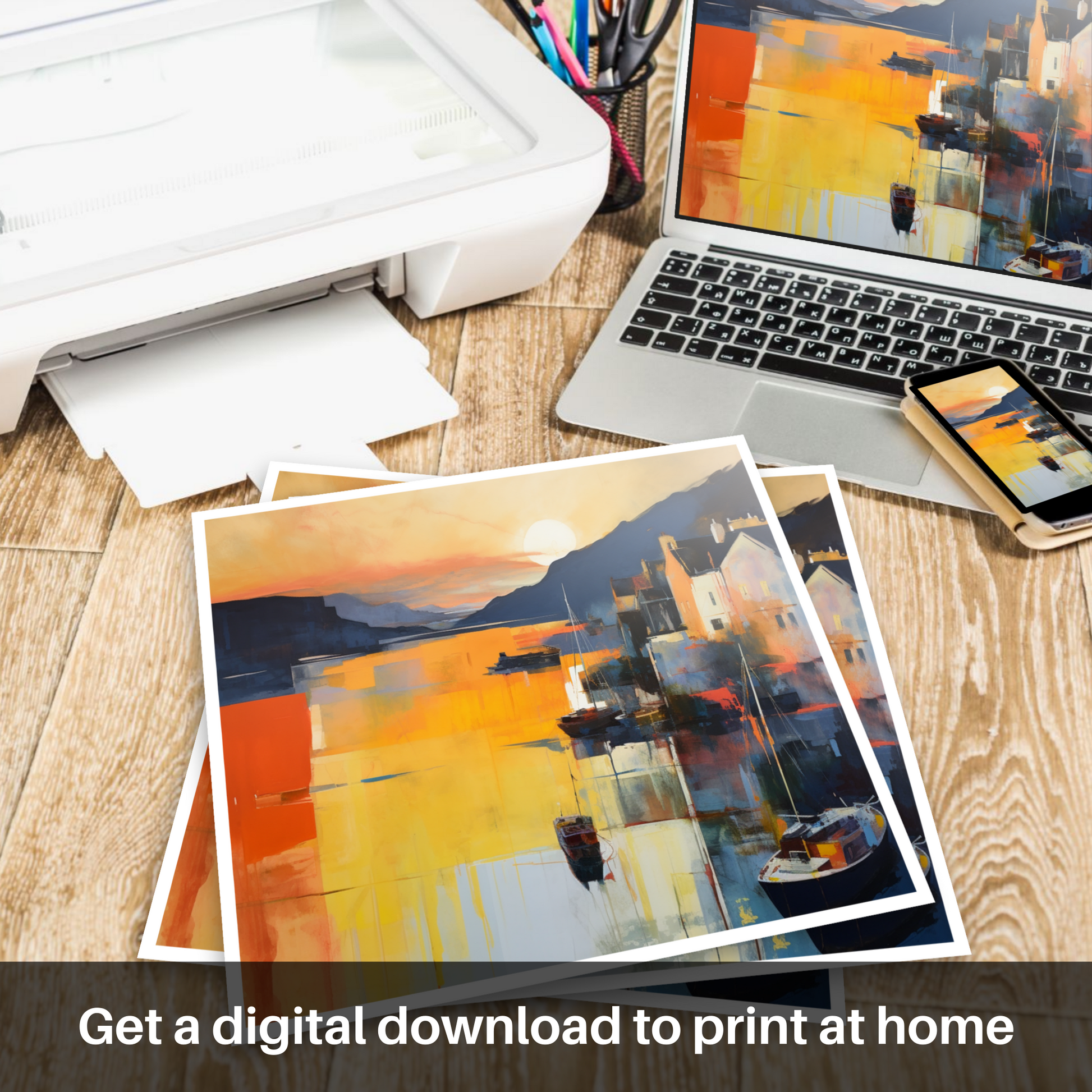 Immerse yourself in the subtle complexity of this print, which offers a contemporary take on the timeless splendour of Scotland’s coastal harbours. This piece is an exquisite addition for collectors and admirers of abstract art, as well as a perfect centrepiece for those seeking to infuse their environment with the warm, inviting ambience of a harbour at rest under the golden sky.