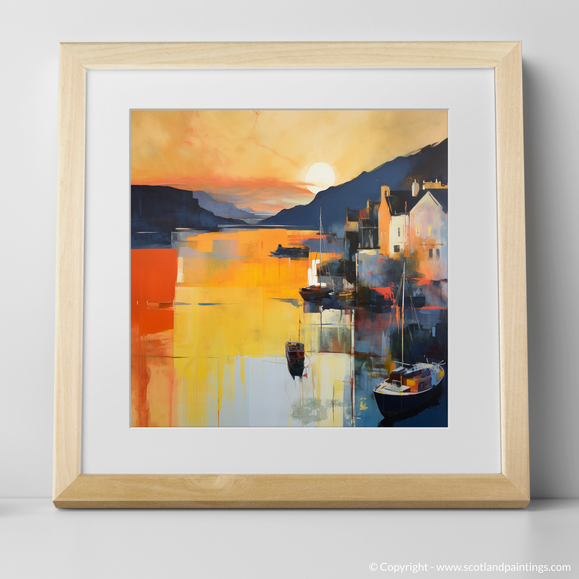 Let the warm glow of a setting sun wash over your space with this evocative print inspired by Oban Harbour at the most magical time of the day. Capturing the essence of golden hour, this abstract piece eloquently fuses swathes of vibrant oranges, deep crimsons and gentle yellows with the cool whispers of blue and grey to depict the stillness and beauty of the Scottish coastline.
