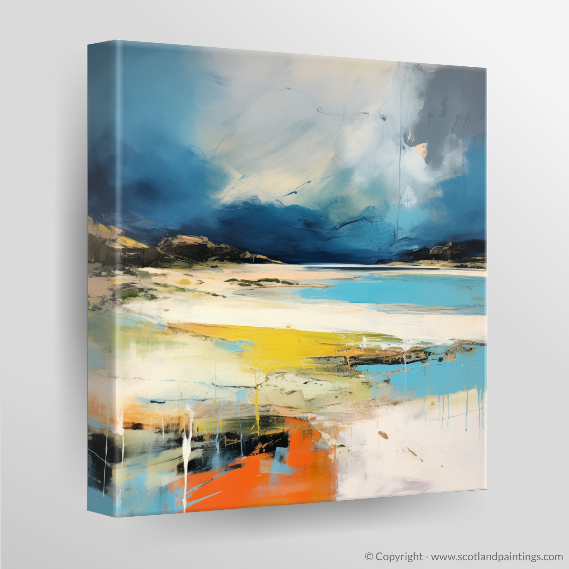 Beneath this moody skyscape, the horizon is smudged with a distant darkness, hinting at the rugged landforms for which the Scottish Highlands are renowned. Descending into the heart of the composition, the abstract representation of the beach unveils itself through an unexpected burst of bright tones. Lemon yellows and creamy whites reflect the transient light as it pierces the ominous clouds, casting a momentary glow on the sands and teasing the eye with its luminescence.