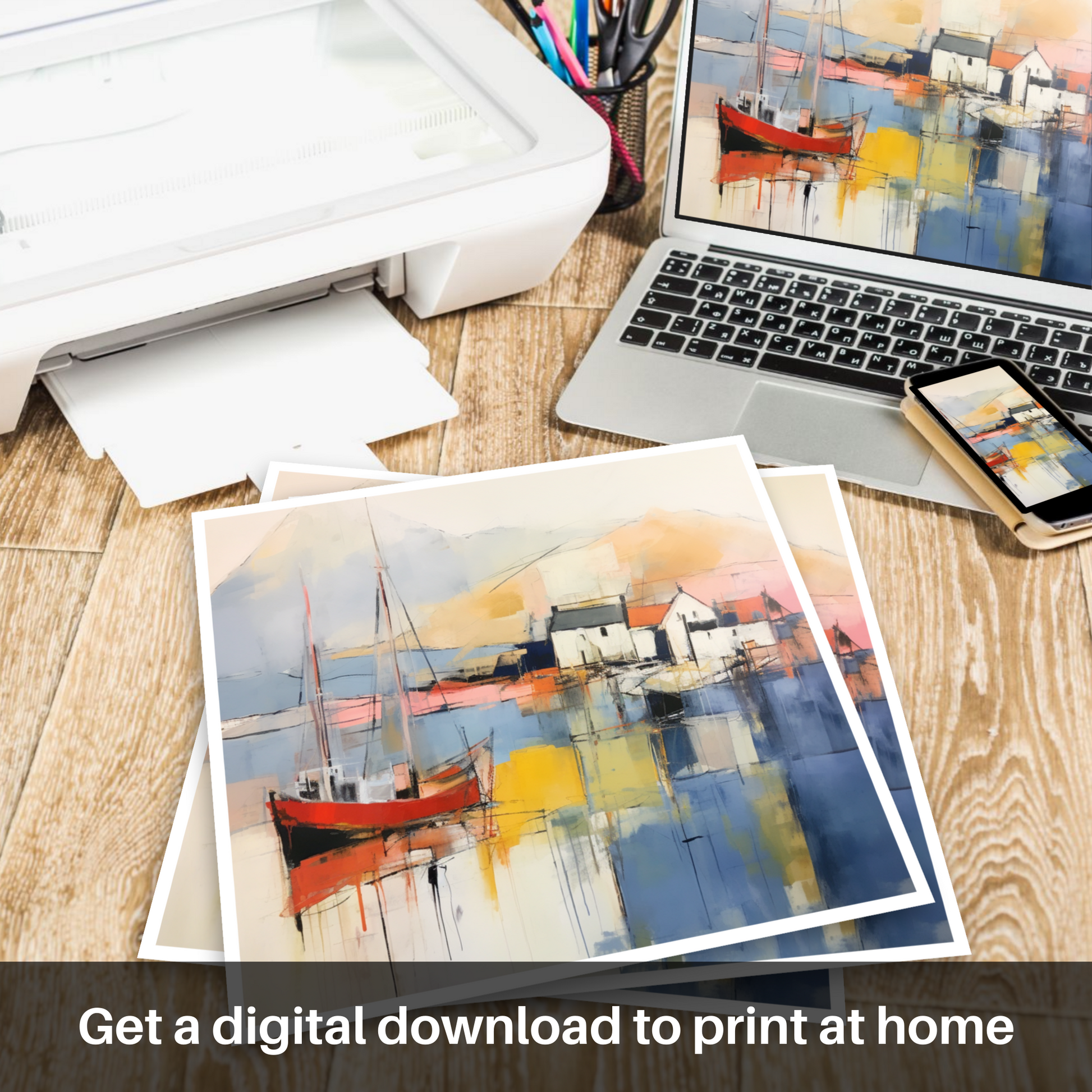 Immerse yourself in the captivating essence of Ullapool Harbour, an abstraction that beckons the spirit of Wester Ross through an exhilarating interplay of colour and form. This print is a visual feast, a dance of bold hues and fluid shapes that evoke the serene yet bustling energy of a Scottish harbour.