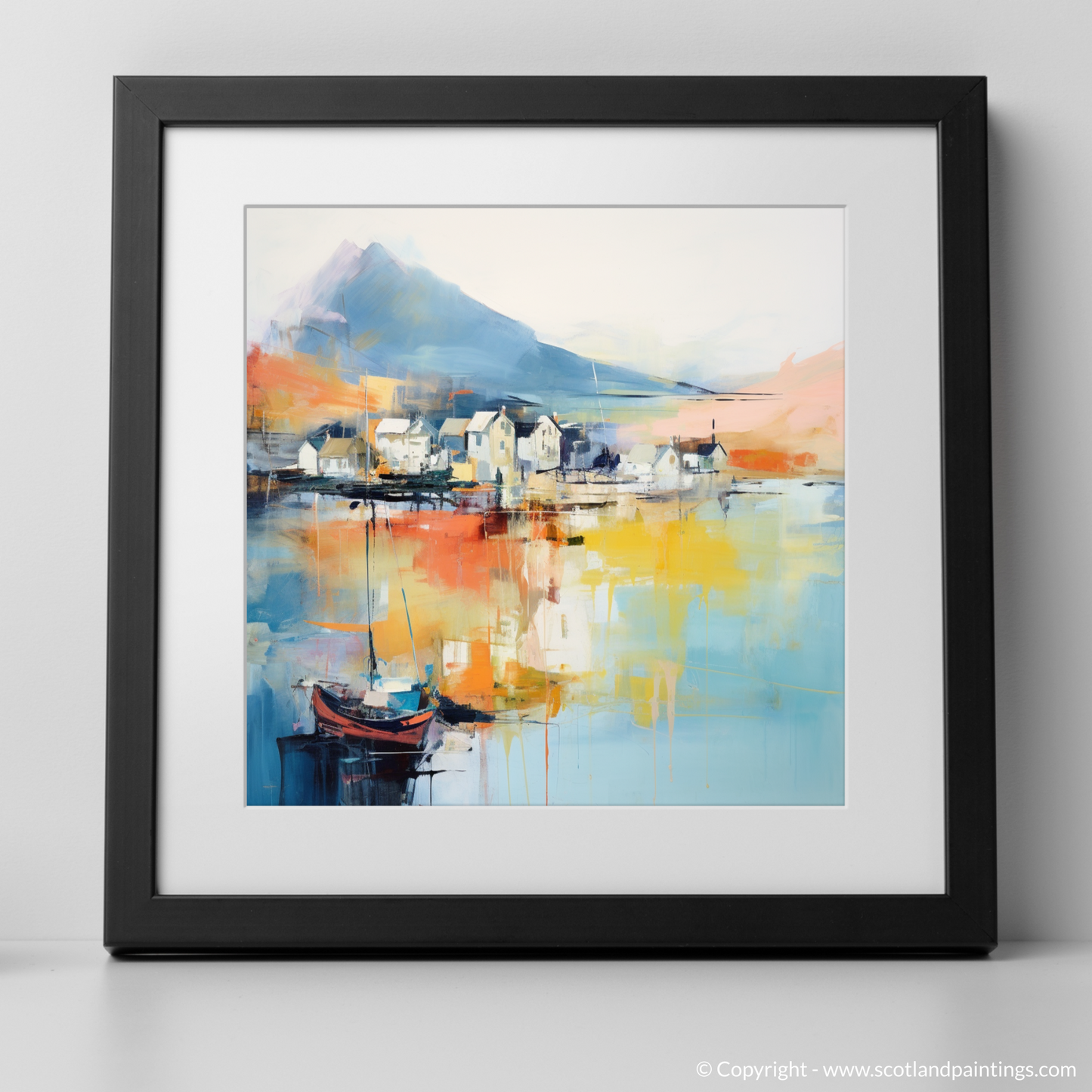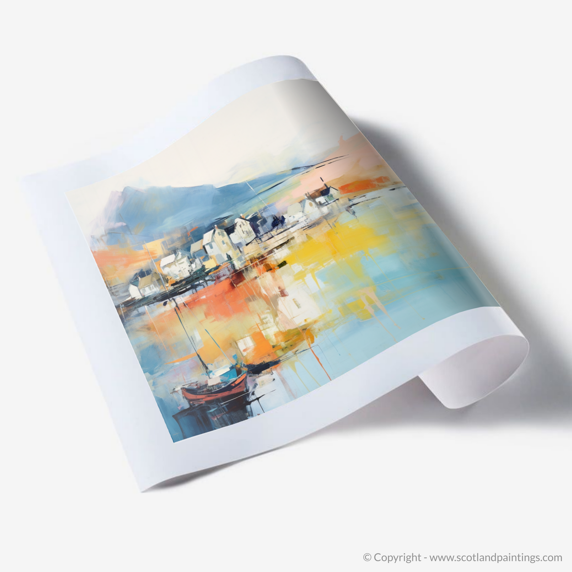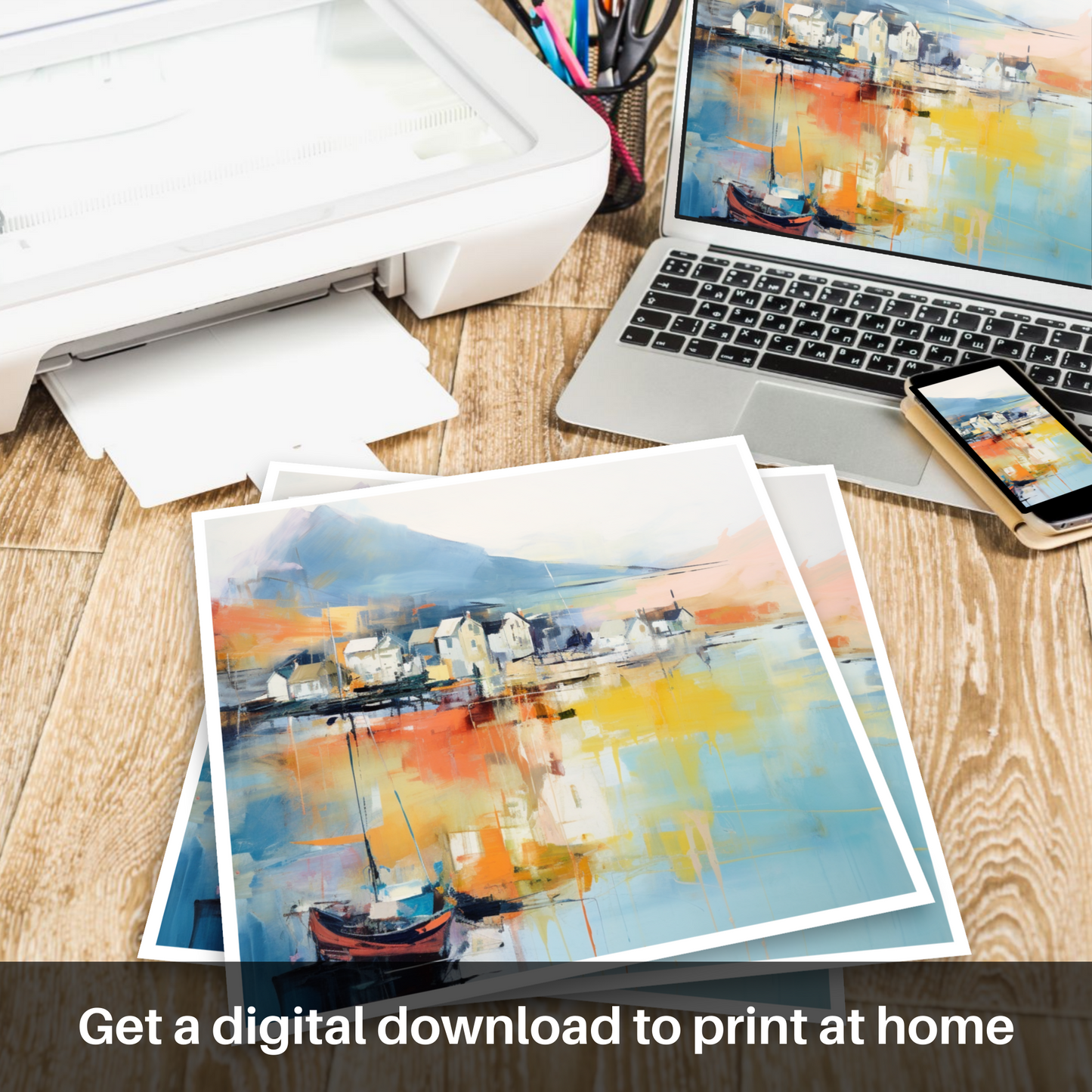 Invoking the cool, crisp air of the Scottish Highlands, this evocative print captures the essence of Ullapool Harbour through an abstract lens. Shades of azure and cobalt blue mingle with warm sunset oranges, reflecting the interplay of water and sky at this serene coastal retreat. Strokes of white and cream contour the quaint harbour buildings, their edges softened as if by a mist rolling in from the sea. The boats, abstractly rendered, float gently alongside the pier, their masts rising like reeds at the edge of a pond.
