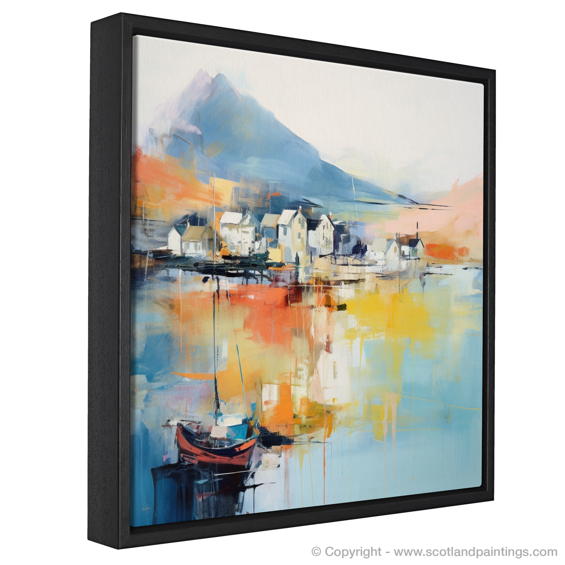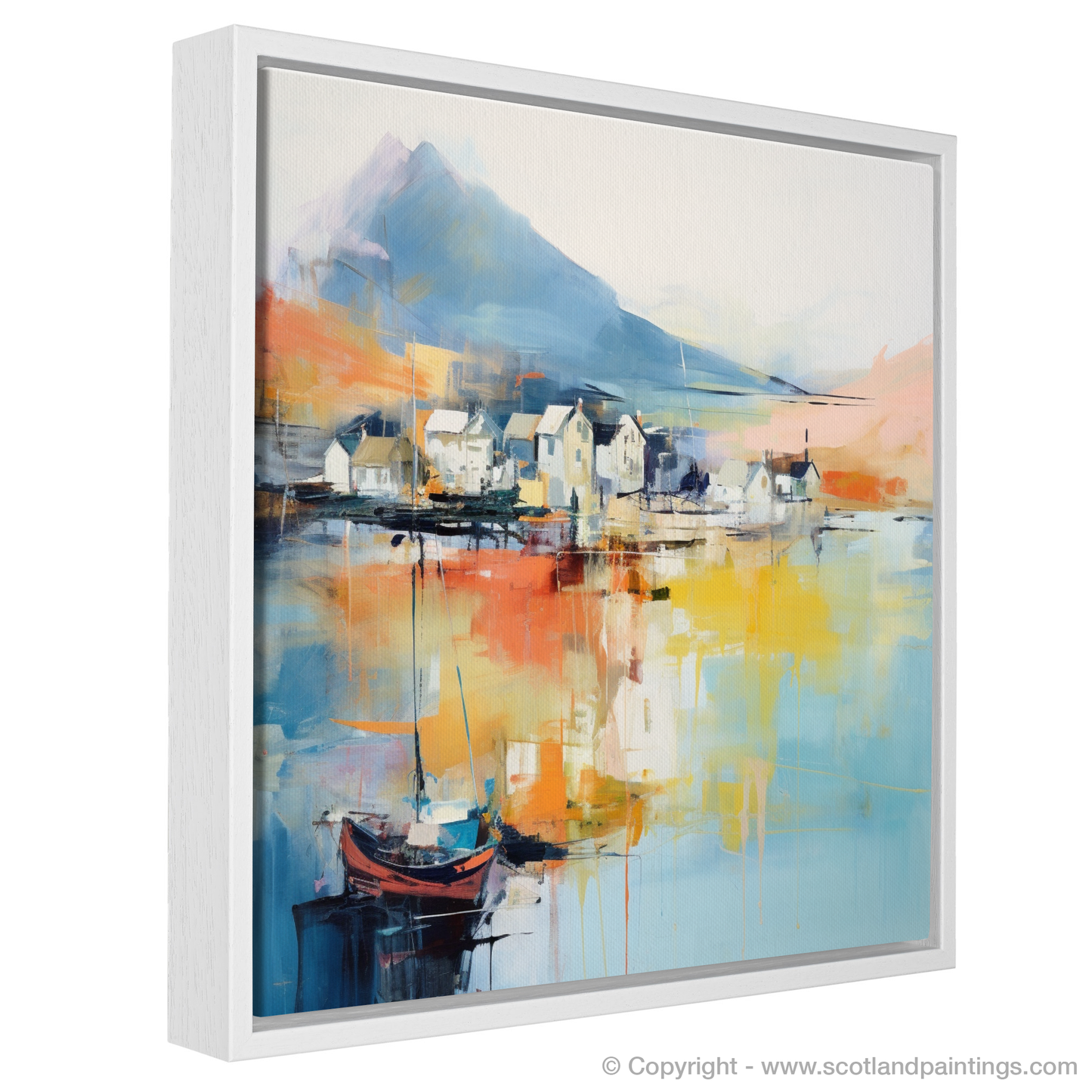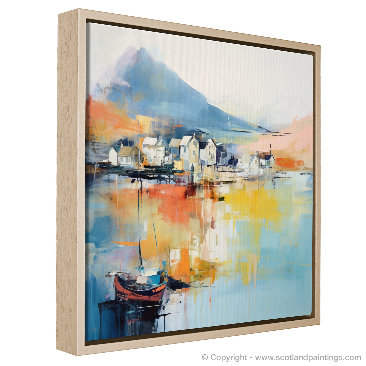 Invoking the cool, crisp air of the Scottish Highlands, this evocative print captures the essence of Ullapool Harbour through an abstract lens. Shades of azure and cobalt blue mingle with warm sunset oranges, reflecting the interplay of water and sky at this serene coastal retreat. Strokes of white and cream contour the quaint harbour buildings, their edges softened as if by a mist rolling in from the sea. The boats, abstractly rendered, float gently alongside the pier, their masts rising like reeds at the edge of a pond.