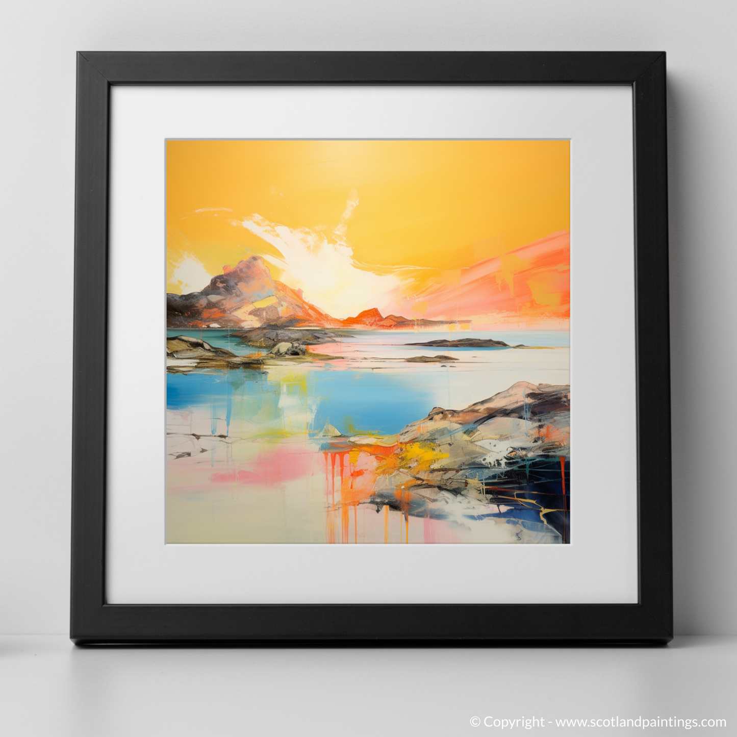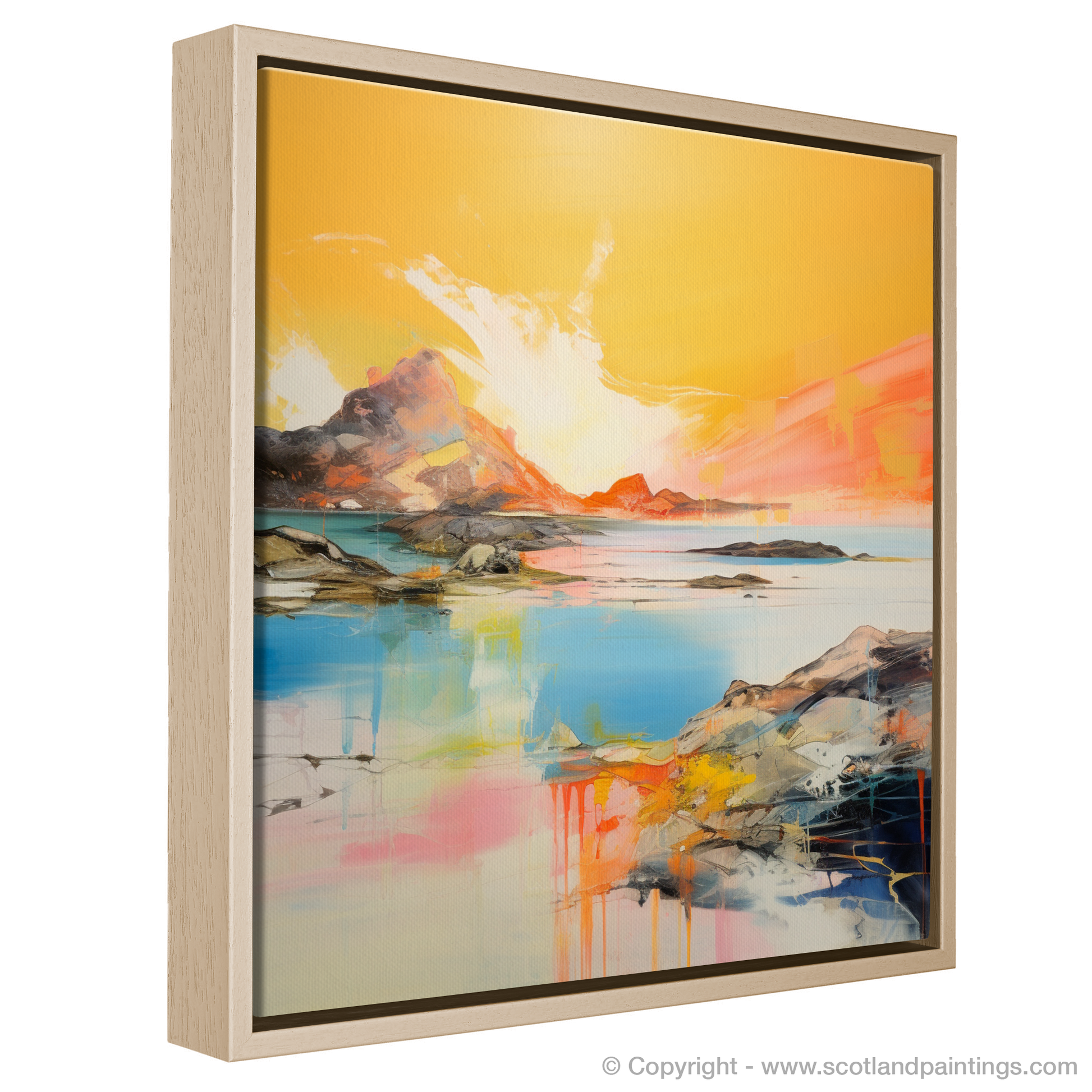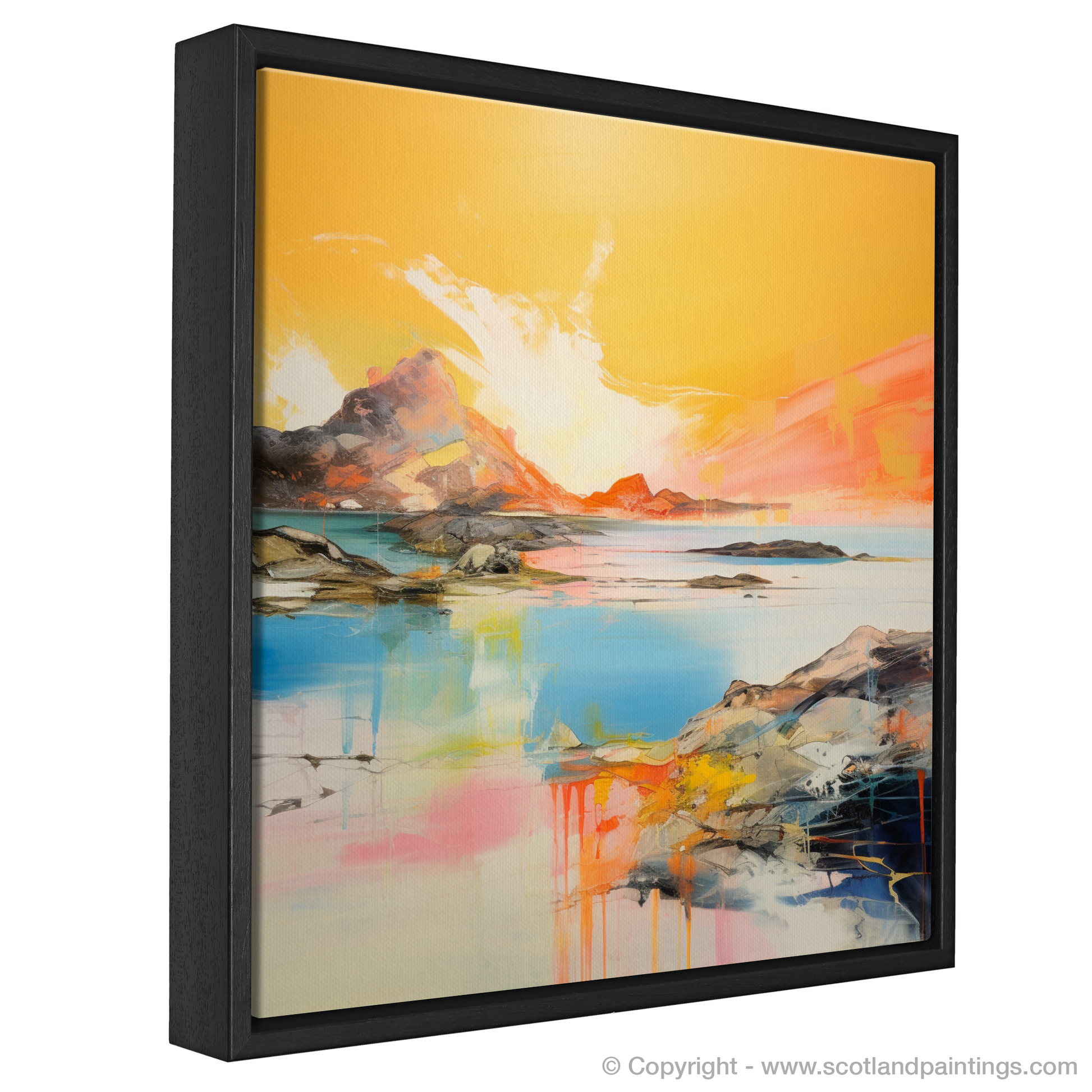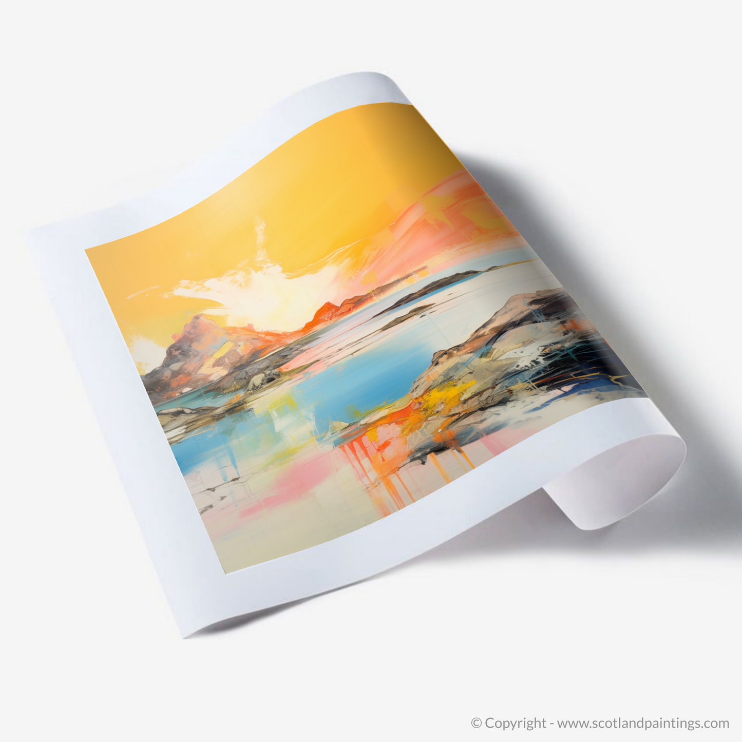 Capturing the ephemeral beauty of Achmelvich Bay at the enchanted hour when the sun kisses the horizon, this stunning abstract print evokes the serene yet dynamic essence of one of Scotland's hidden coastal gems. Bathed in the resplendent hues of golden hour, this artwork is a vibrant symphony of colour, where fiery ambers and warm oranges blend seamlessly with the cool blues and turquoises of the tranquil sea.