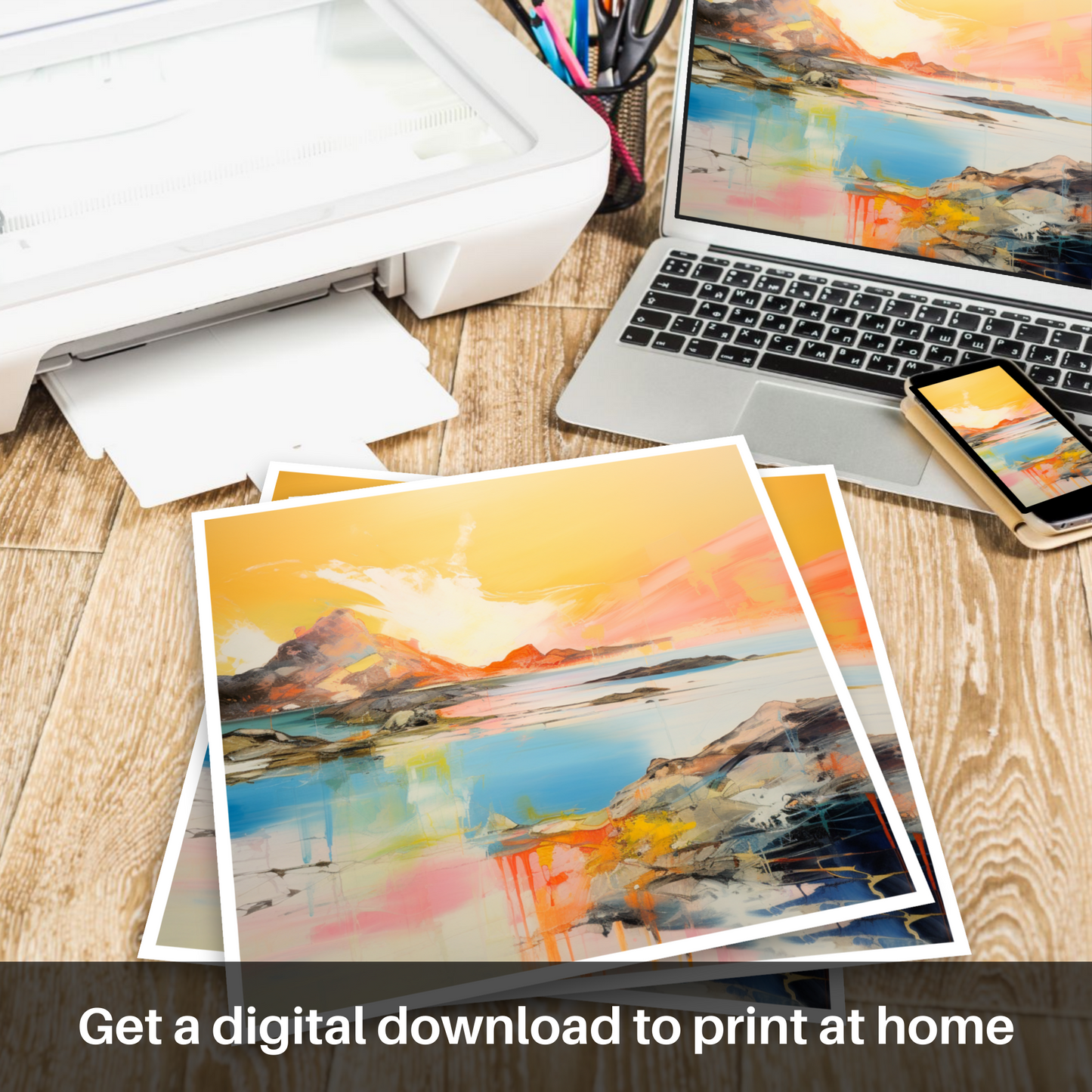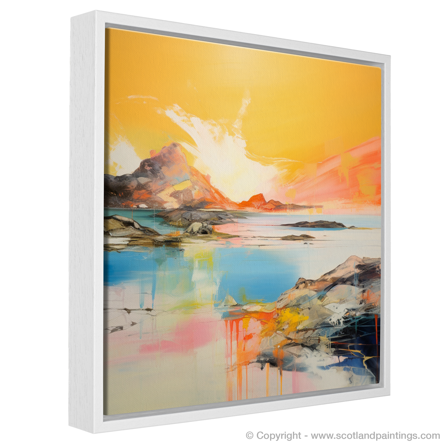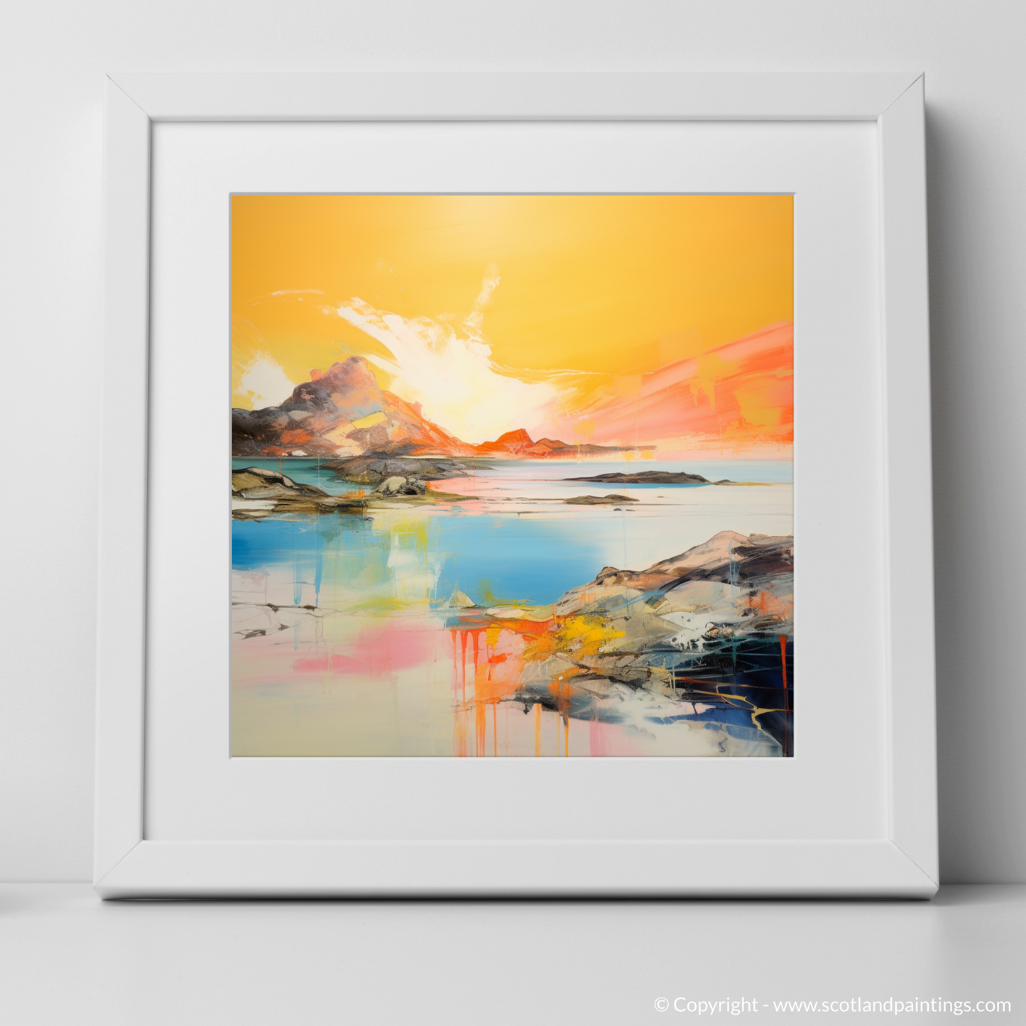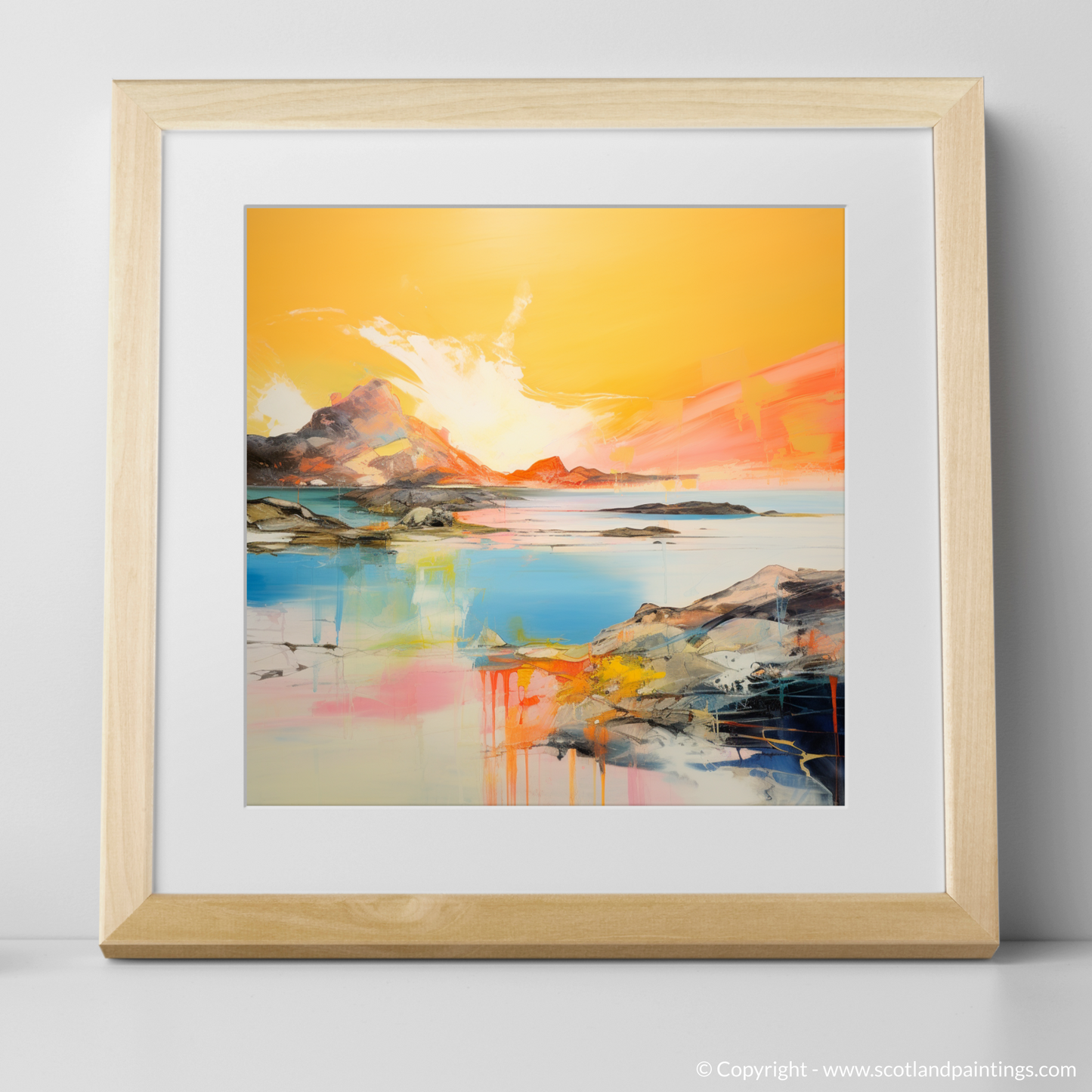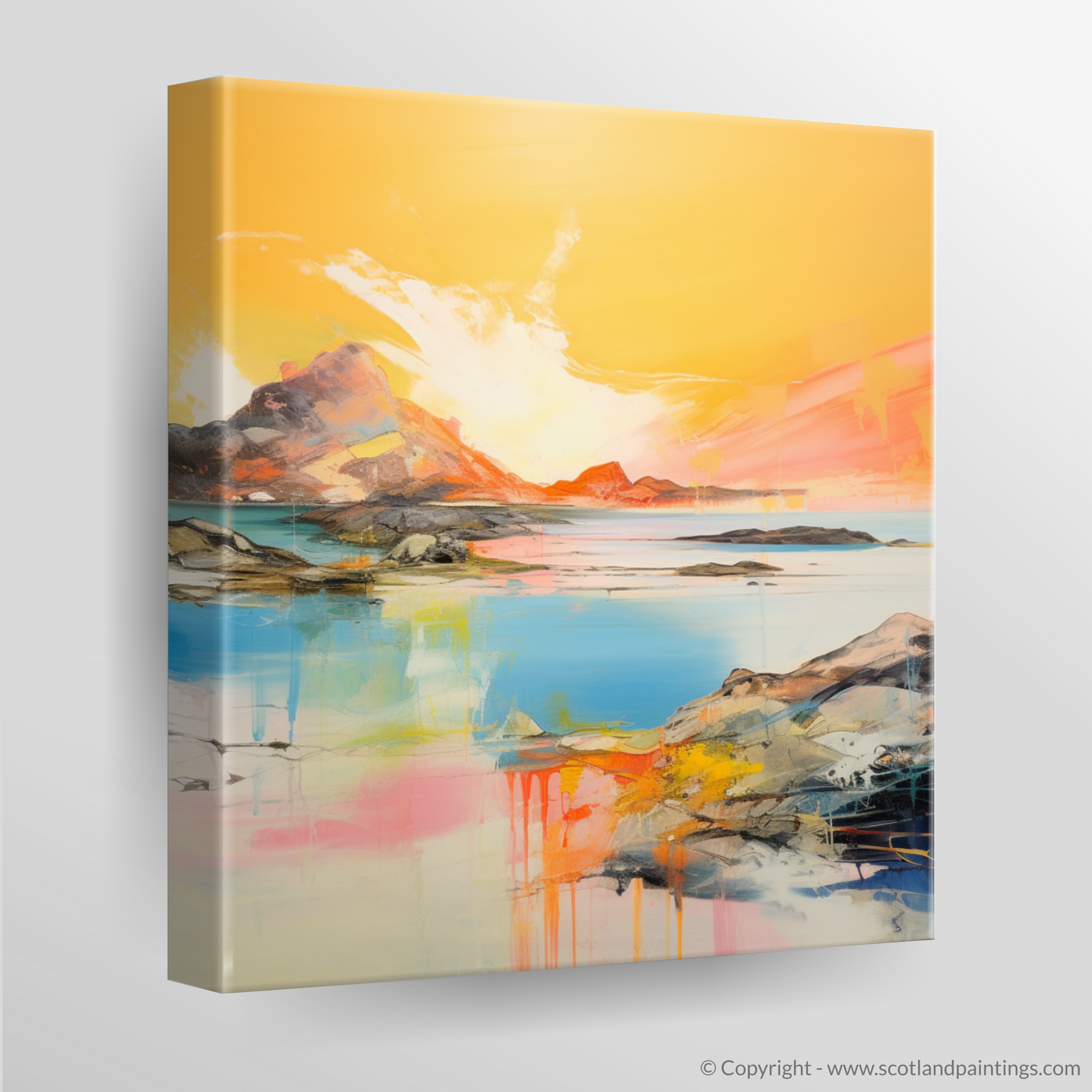 Capturing the ephemeral beauty of Achmelvich Bay at the enchanted hour when the sun kisses the horizon, this stunning abstract print evokes the serene yet dynamic essence of one of Scotland's hidden coastal gems. Bathed in the resplendent hues of golden hour, this artwork is a vibrant symphony of colour, where fiery ambers and warm oranges blend seamlessly with the cool blues and turquoises of the tranquil sea.
