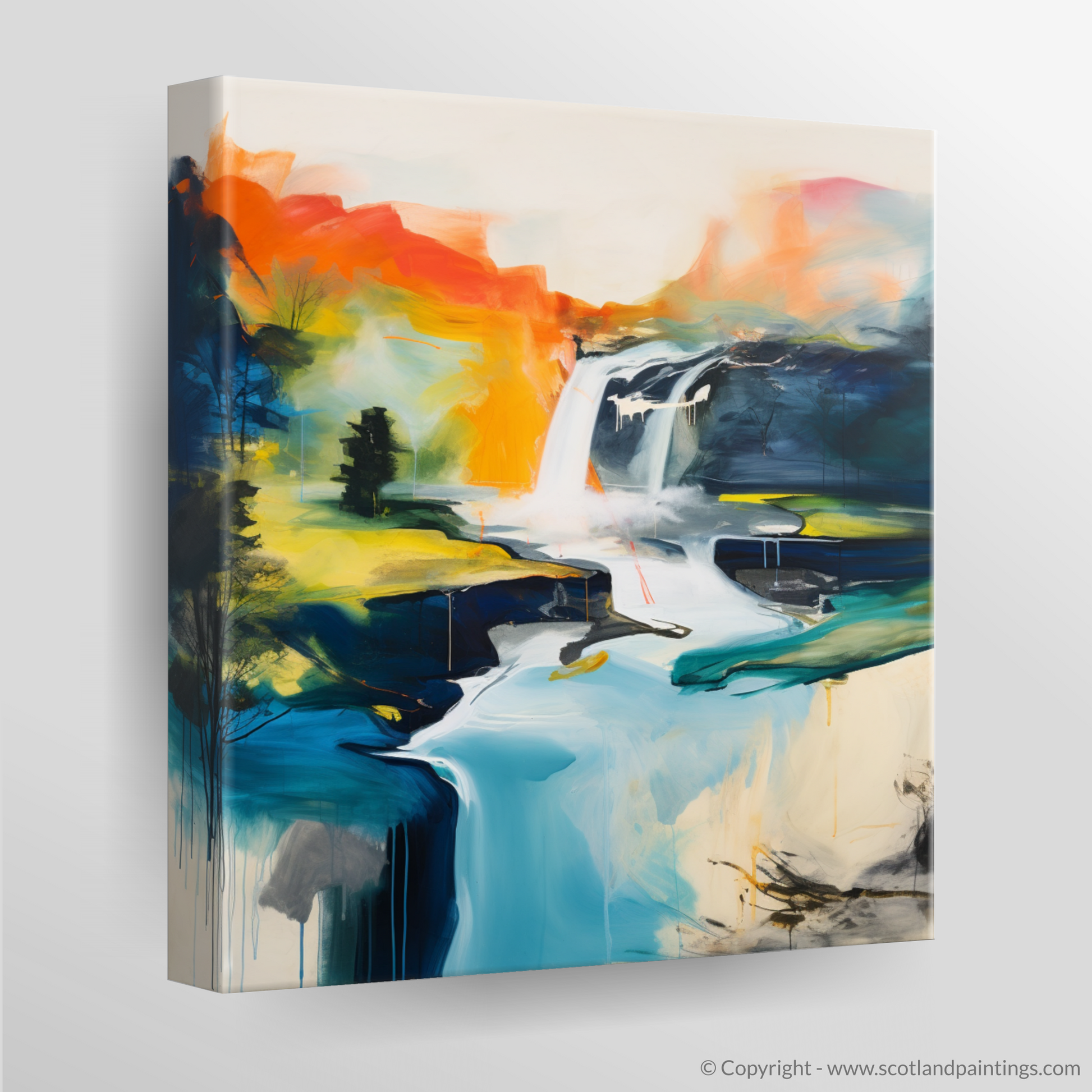 Immerse yourself in the vivid allure of a Scottish masterpiece, where dynamic brushstrokes bring the mesmerising Falls of Dochart to life through a kaleidoscope of colour and movement. Delve into an abstract interpretation where the raw energy of cascading waters is captured in a symphony of azure and sapphire hues, their fluidity juxtaposed against the rugged, earthen tones of the surrounding landscape.