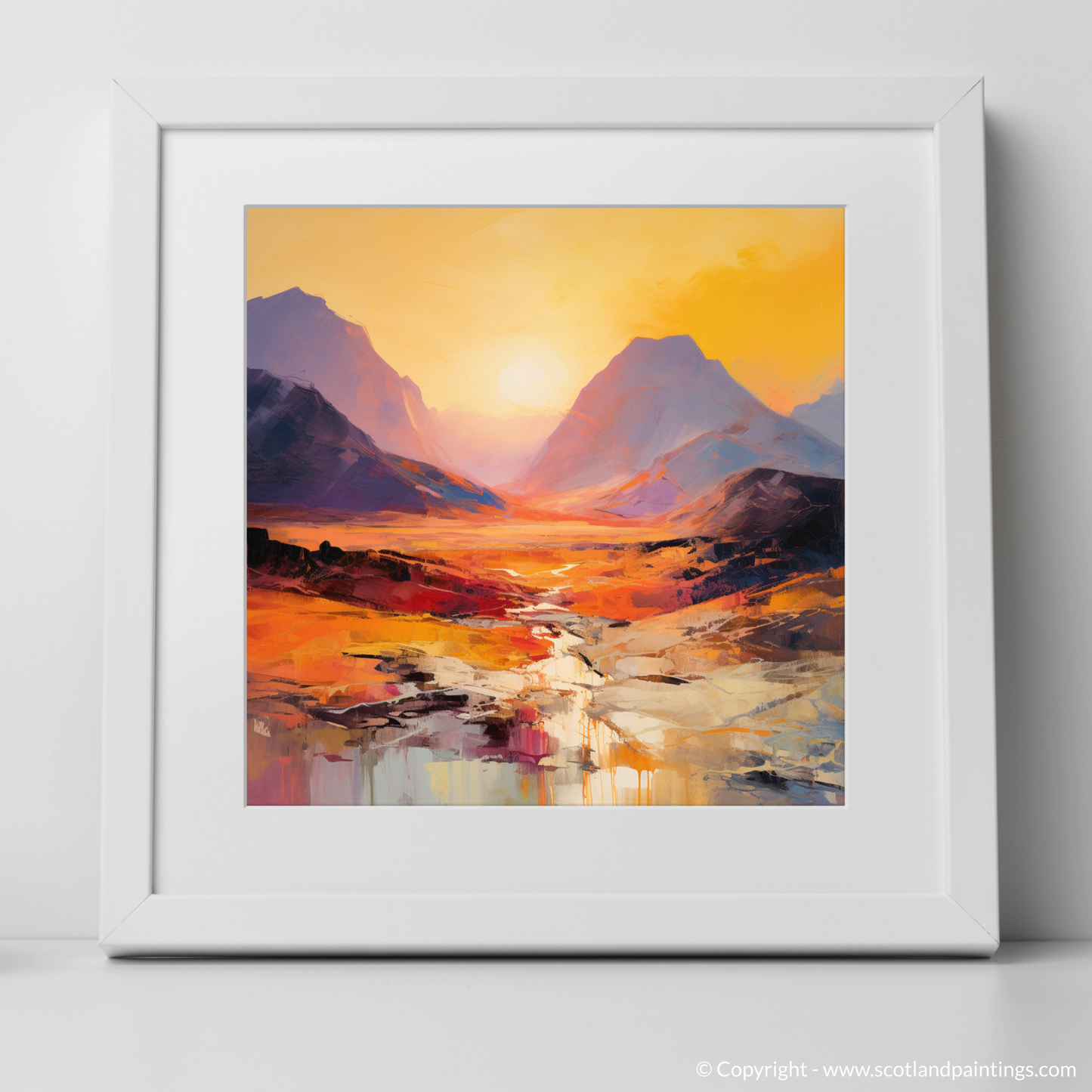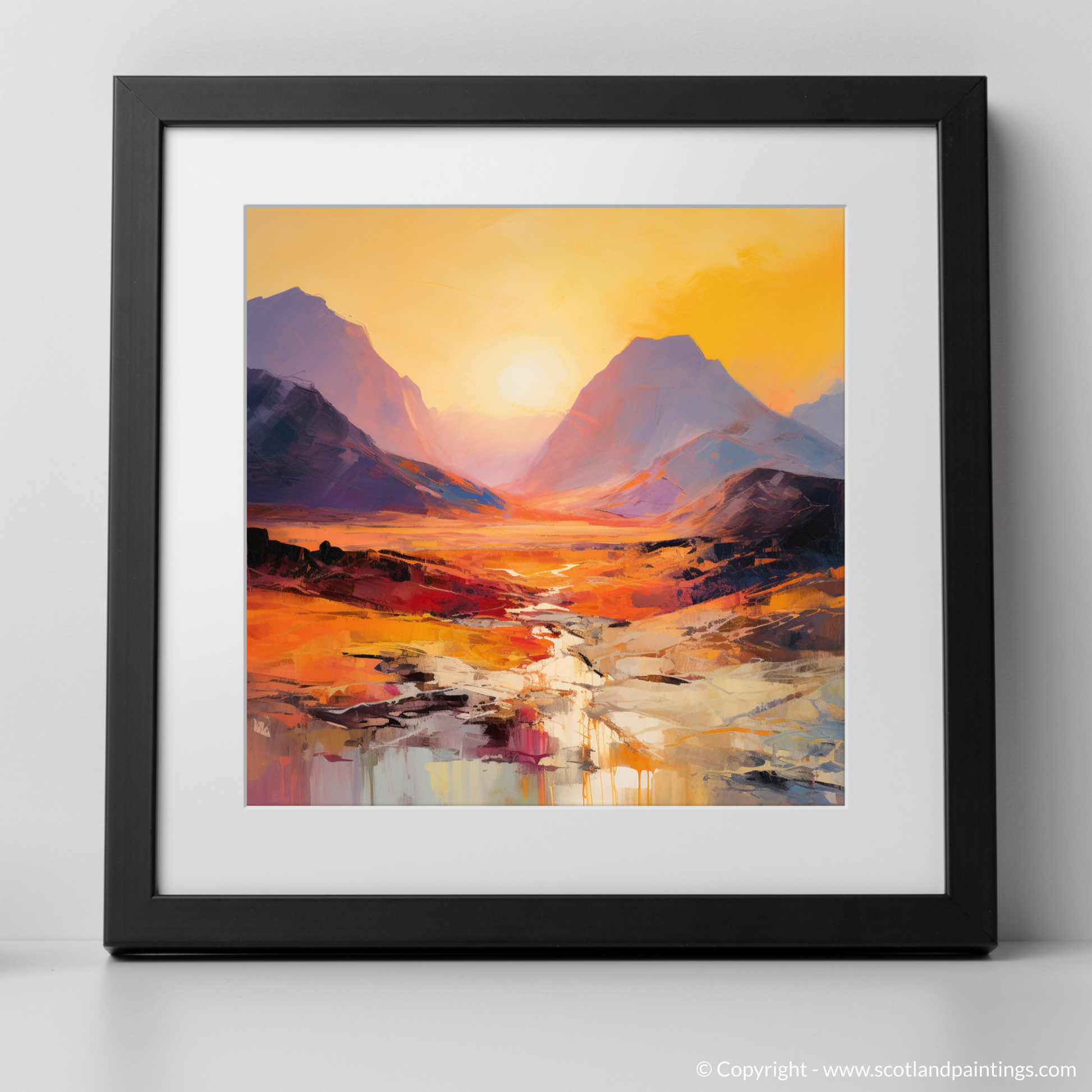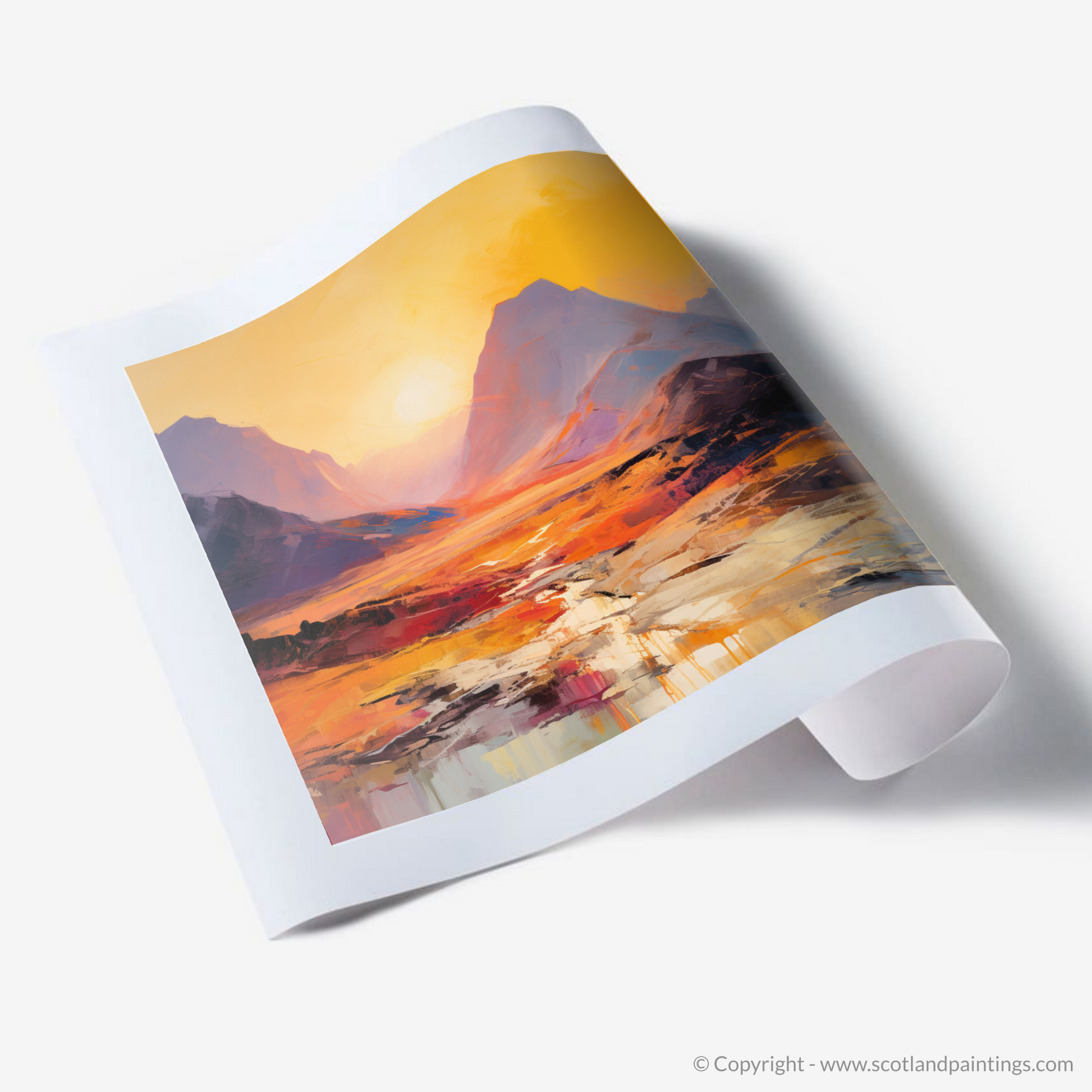 Capturing the ephemeral magic of the Golden hour, this enchanting print from our 'Glencoe' collection transports viewers to a realm where the play of light creates a dreamlike landscape. Behold a dynamic array of fiery oranges, soft pastel pinks, and deep purples that dance across the canvas, evoking the raw beauty of Buachaille Etive Mor during the most visually dramatic time of day.