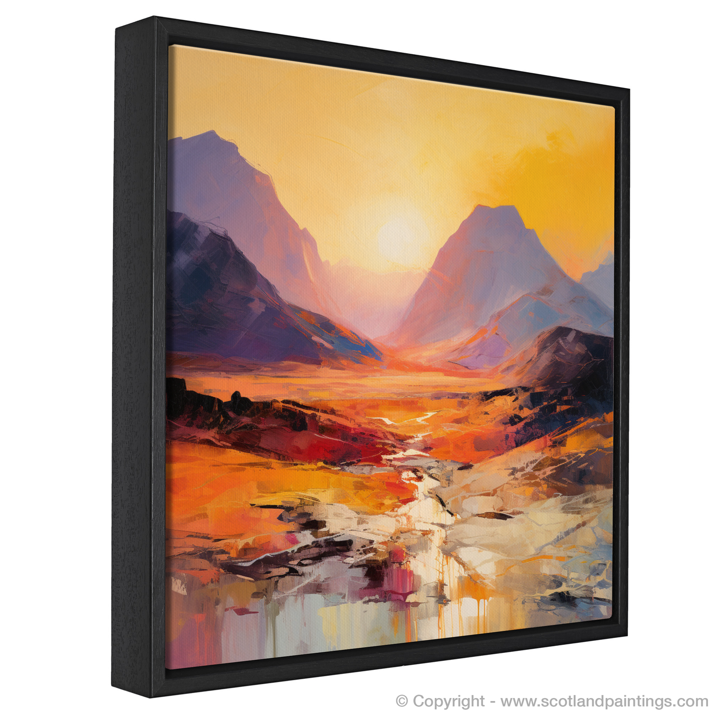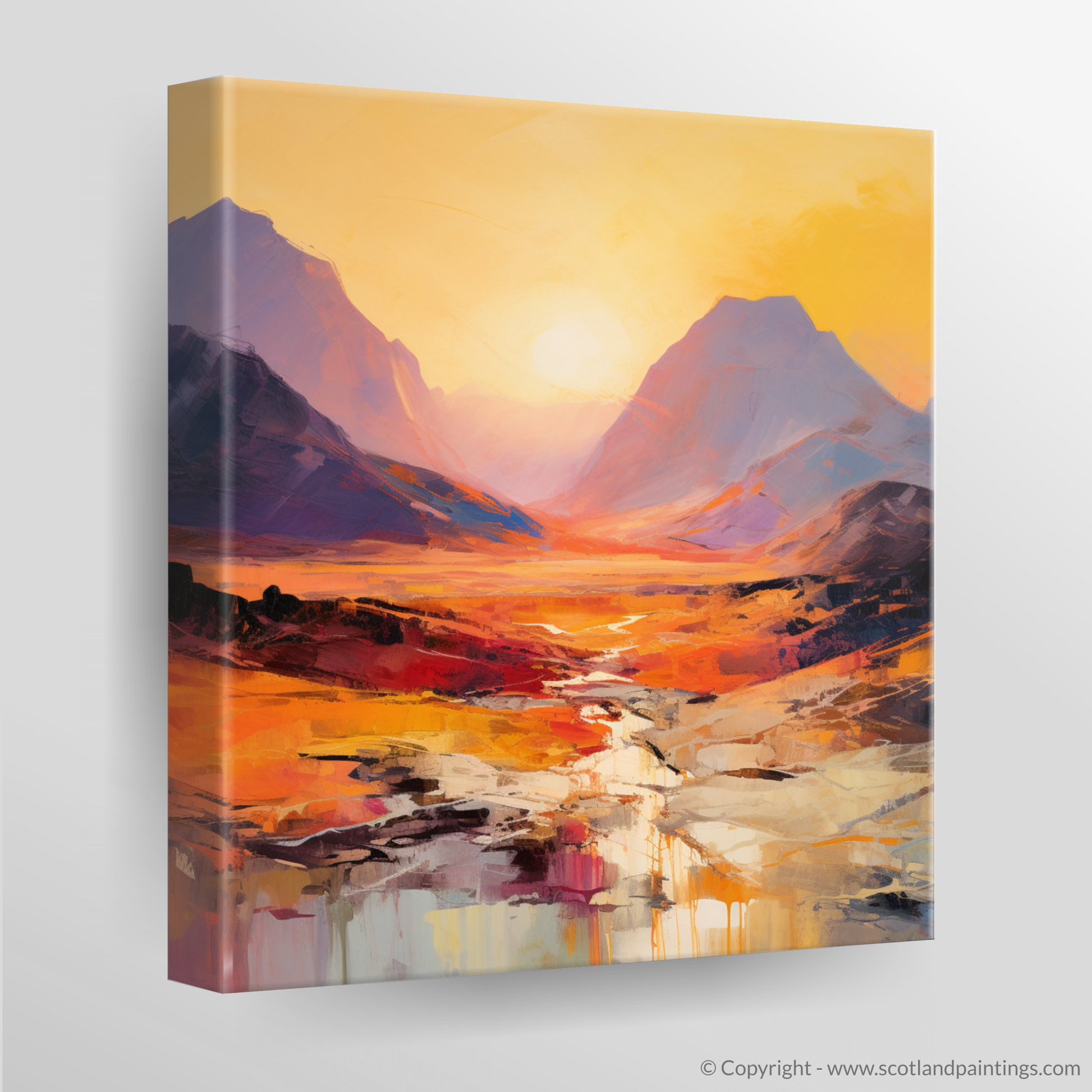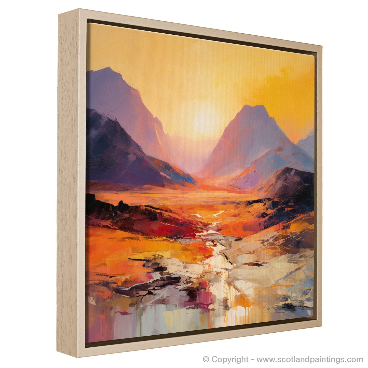 Capturing the ephemeral magic of the Golden hour, this enchanting print from our 'Glencoe' collection transports viewers to a realm where the play of light creates a dreamlike landscape. Behold a dynamic array of fiery oranges, soft pastel pinks, and deep purples that dance across the canvas, evoking the raw beauty of Buachaille Etive Mor during the most visually dramatic time of day.