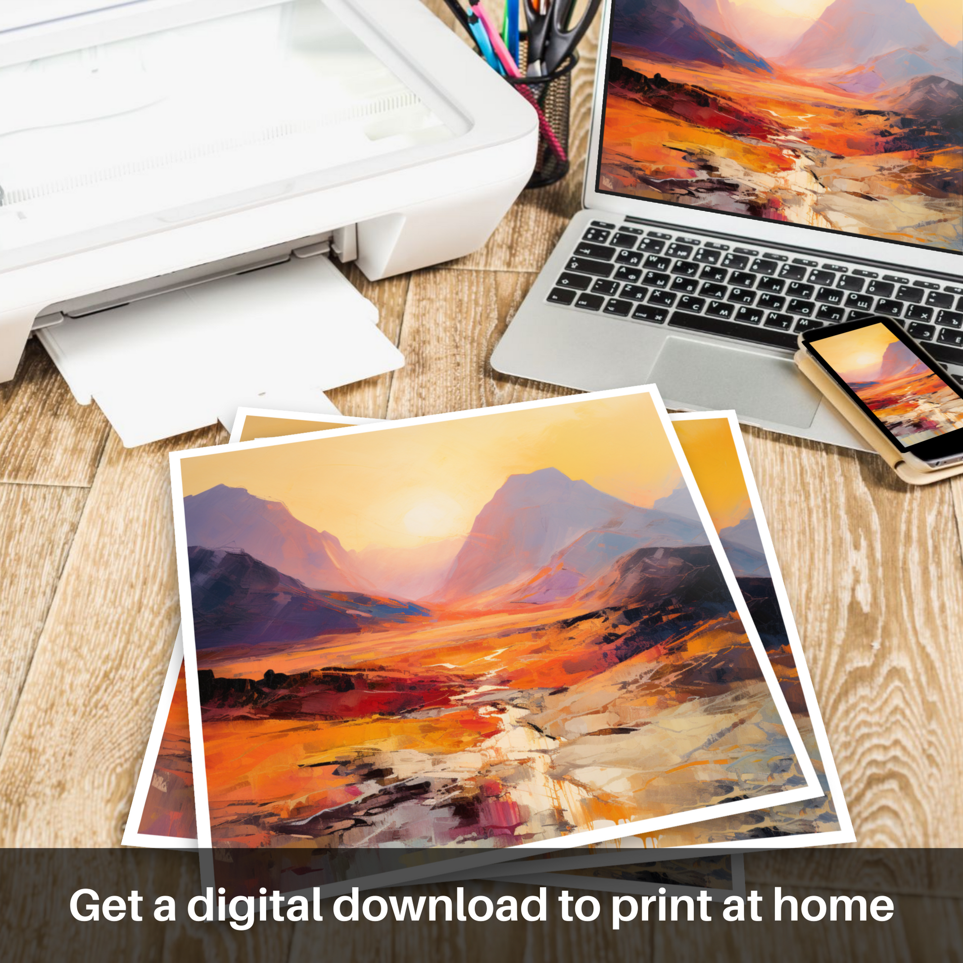This artwork's abstract nature celebrates the elemental power of Scotland's wilderness, offering a contemporary take on a timeless landscape, cherished throughout the ages yet here reimagined with vigour and vitality. It is a piece that challenges perception, delights the senses, and promises to be a captivating centrepiece for any room, evoking curiosity and conversation. Ideal for anyone wishing to immerse themselves in the sublime serenity of Glencoe's most magical moments, this print is a testament to the allure of natural splendour, encapsulated in a vision that resonates with the soul.